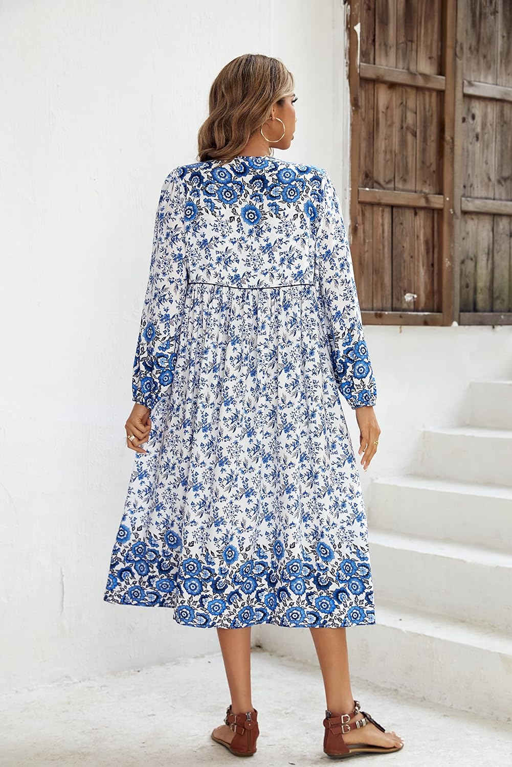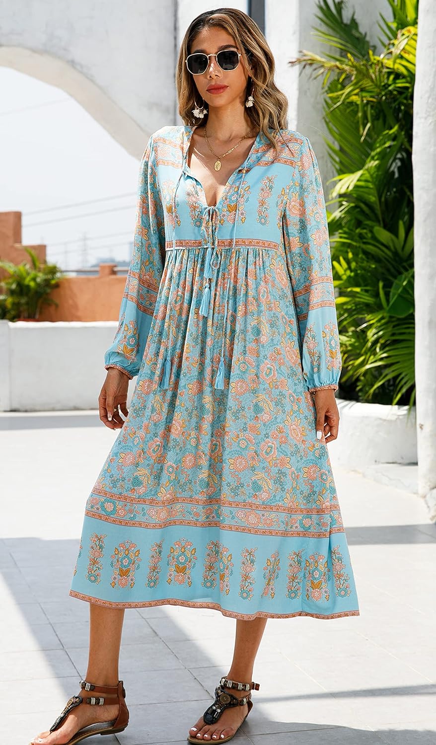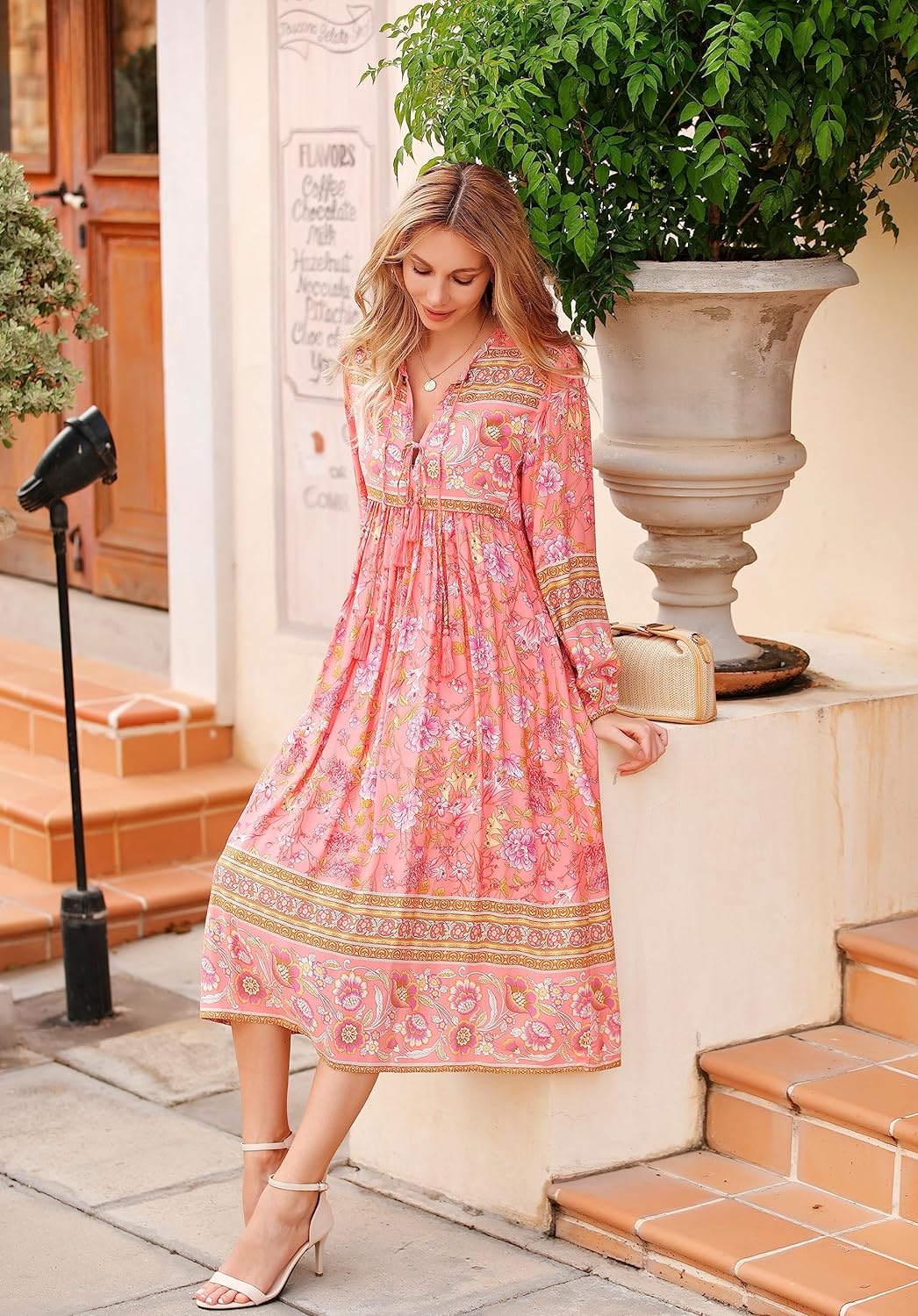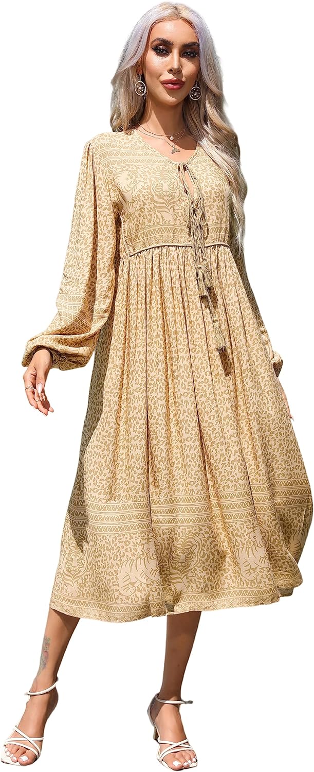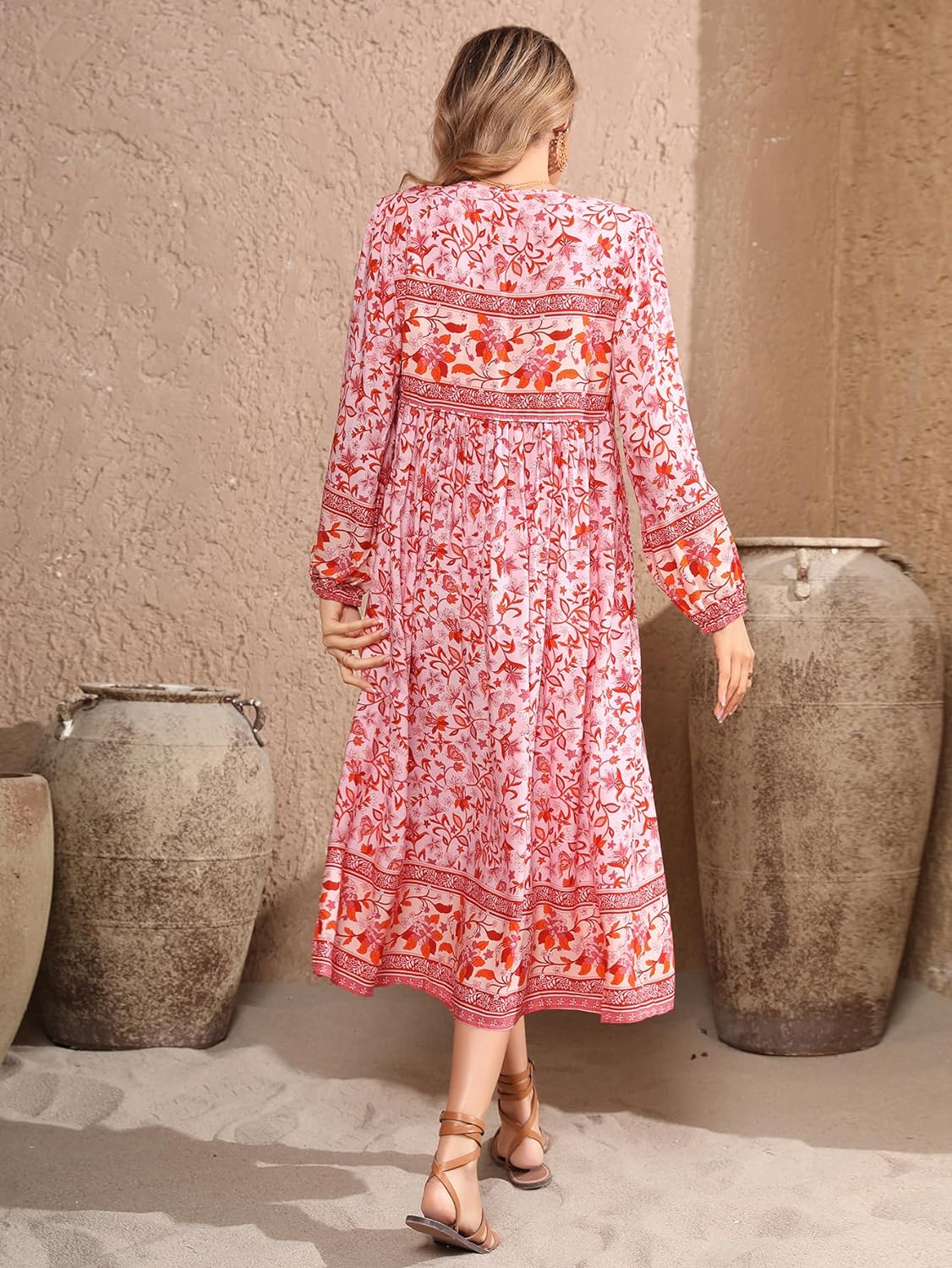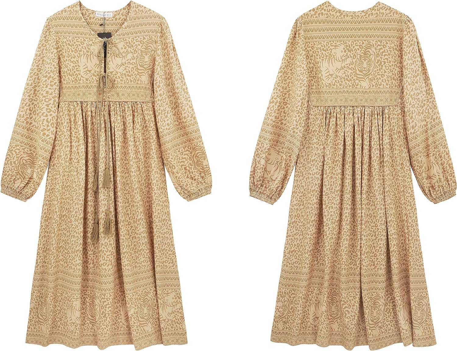 R.Vivimos Women's Long Sleeve Floral Print Retro V Neck Tassel Bohemian Midi Dresses