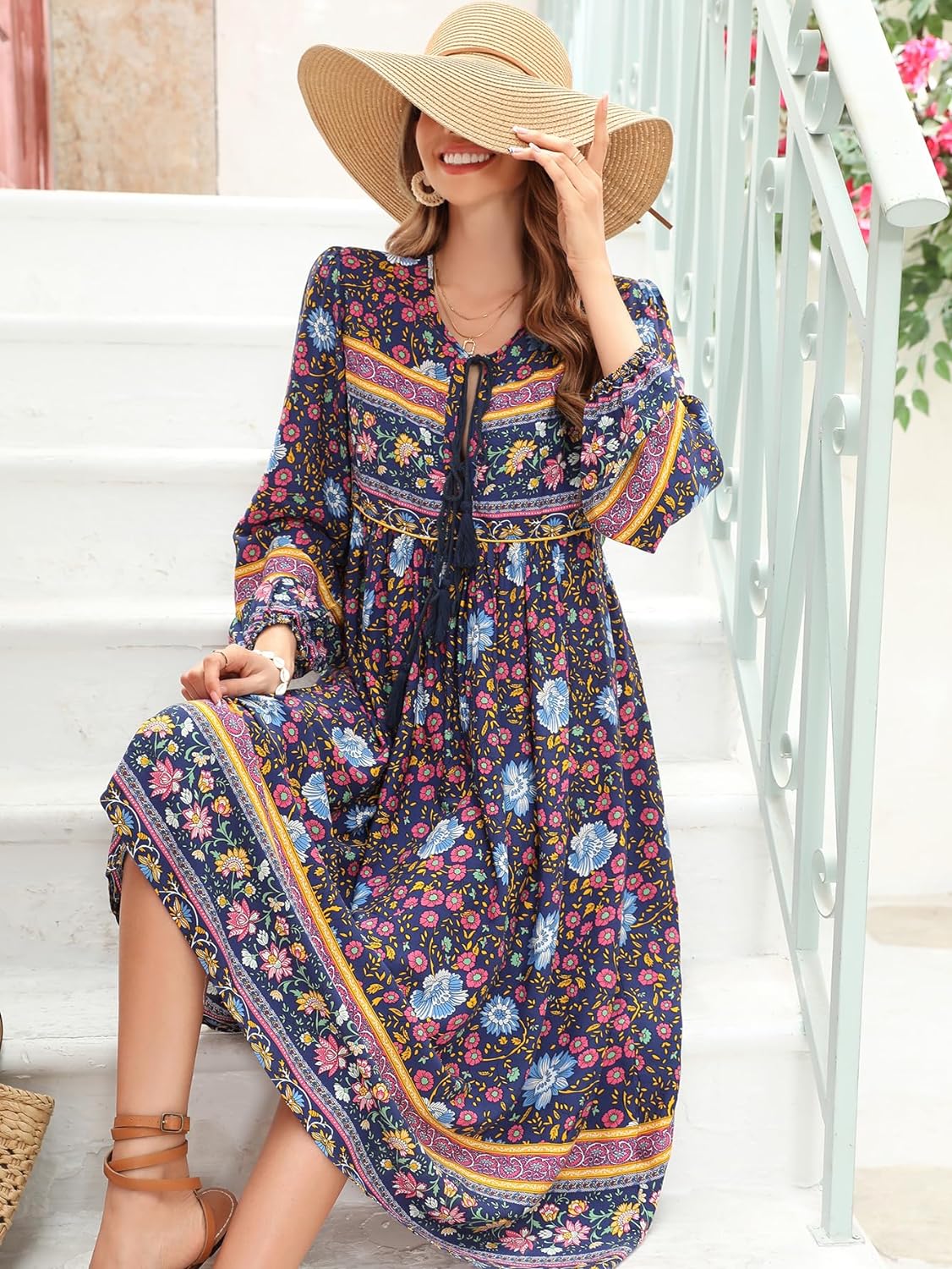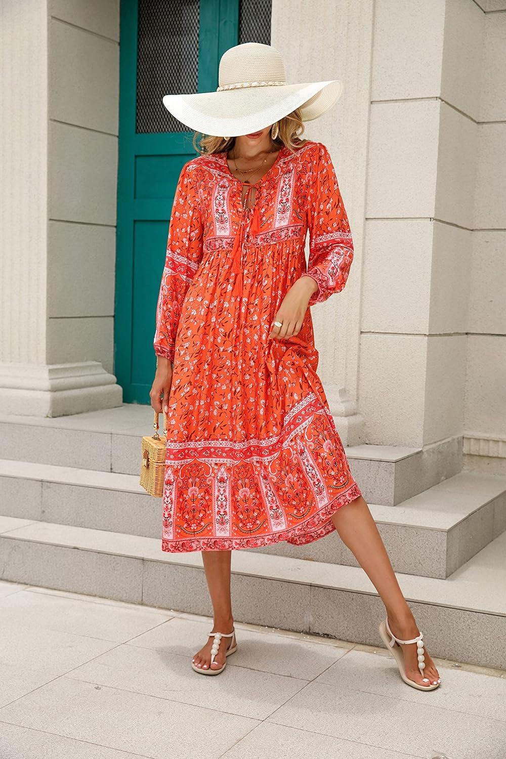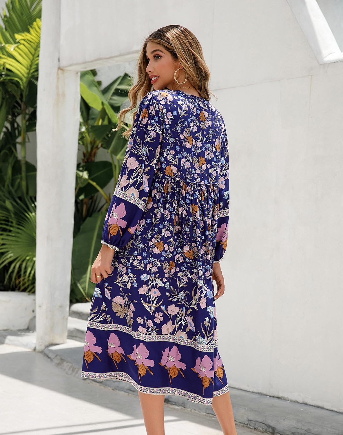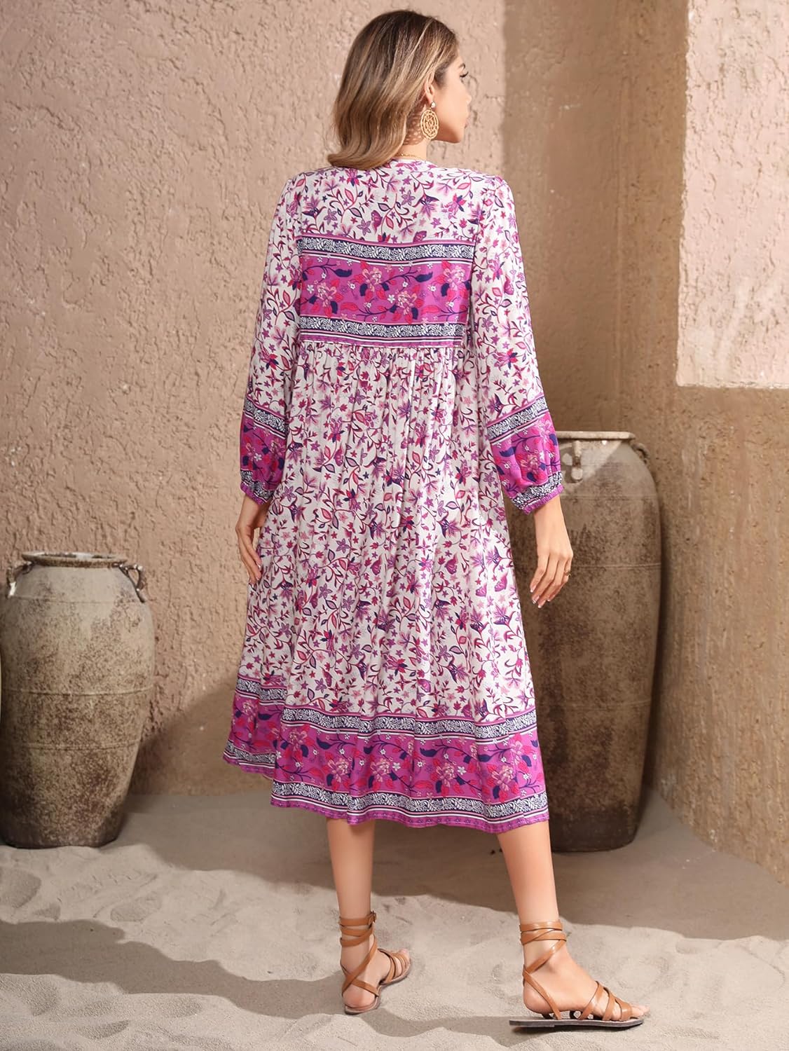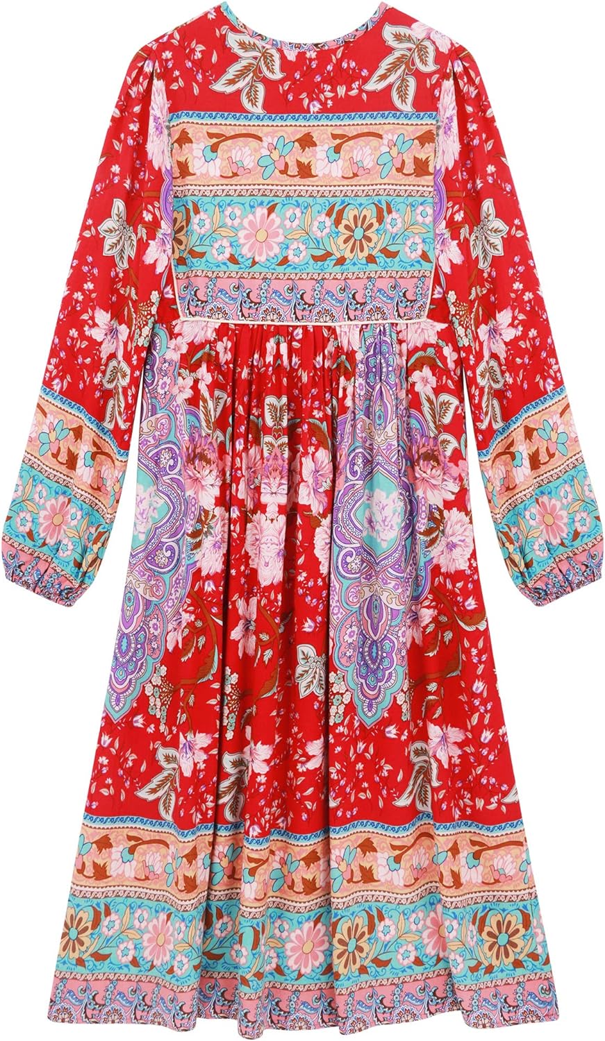 R.Vivimos Women's Long Sleeve Floral Print Retro V Neck Tassel Bohemian Midi Dresses