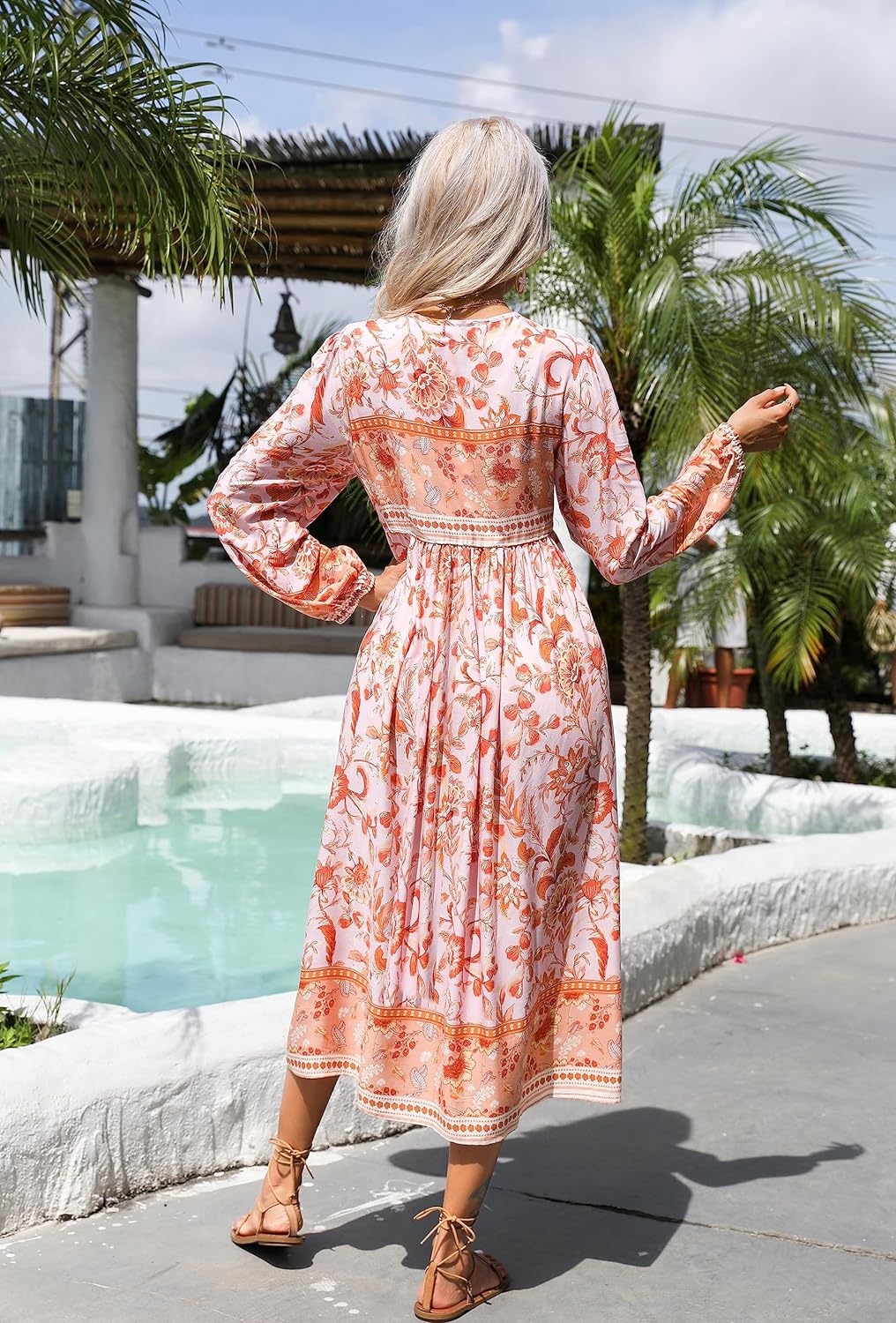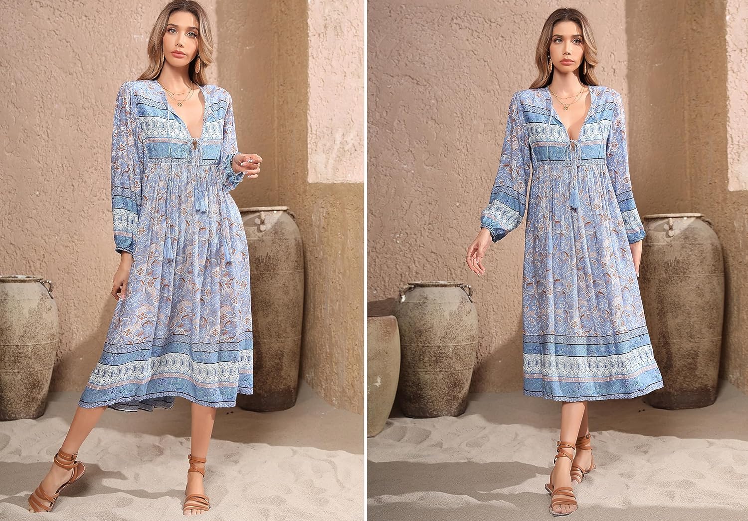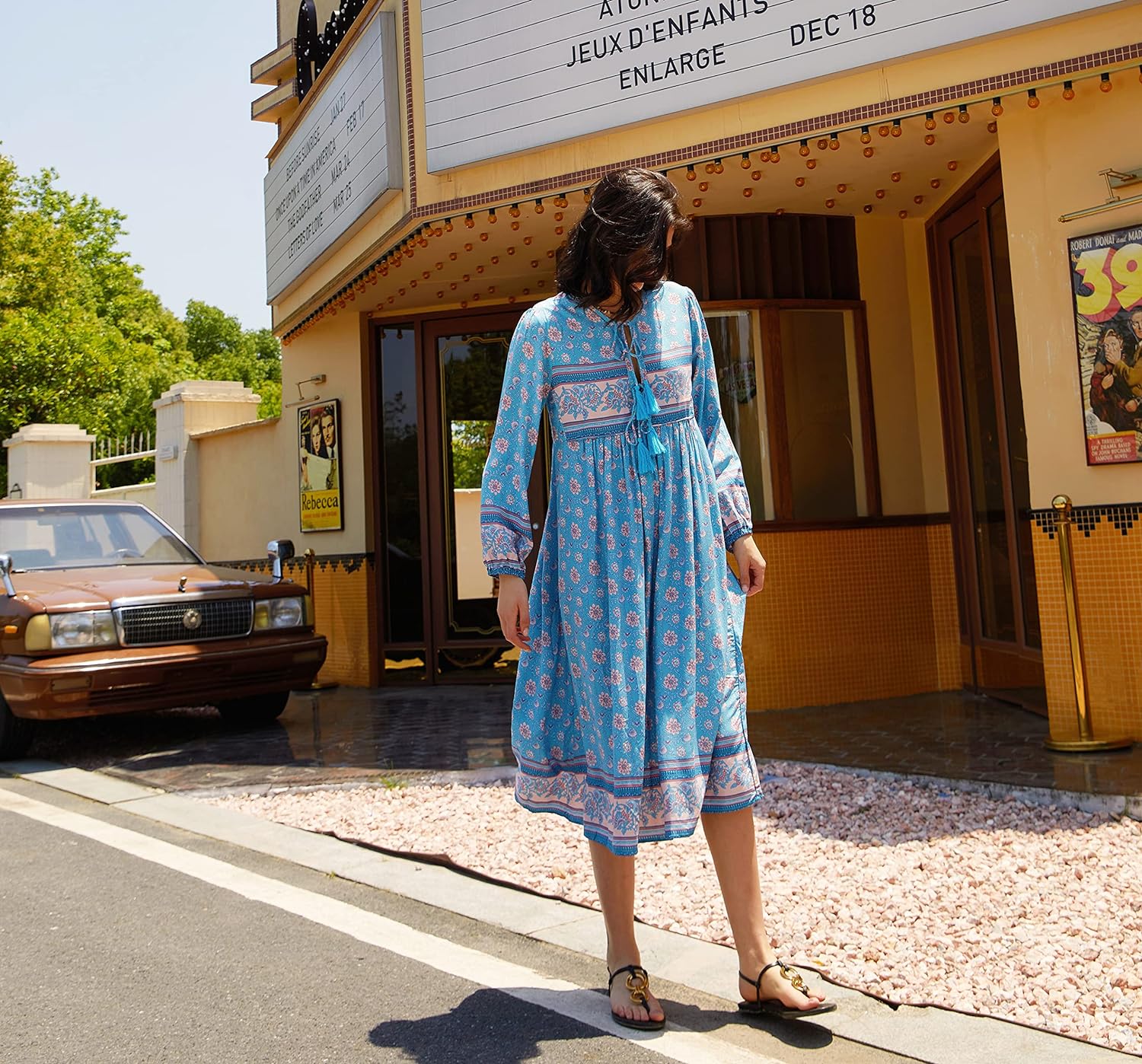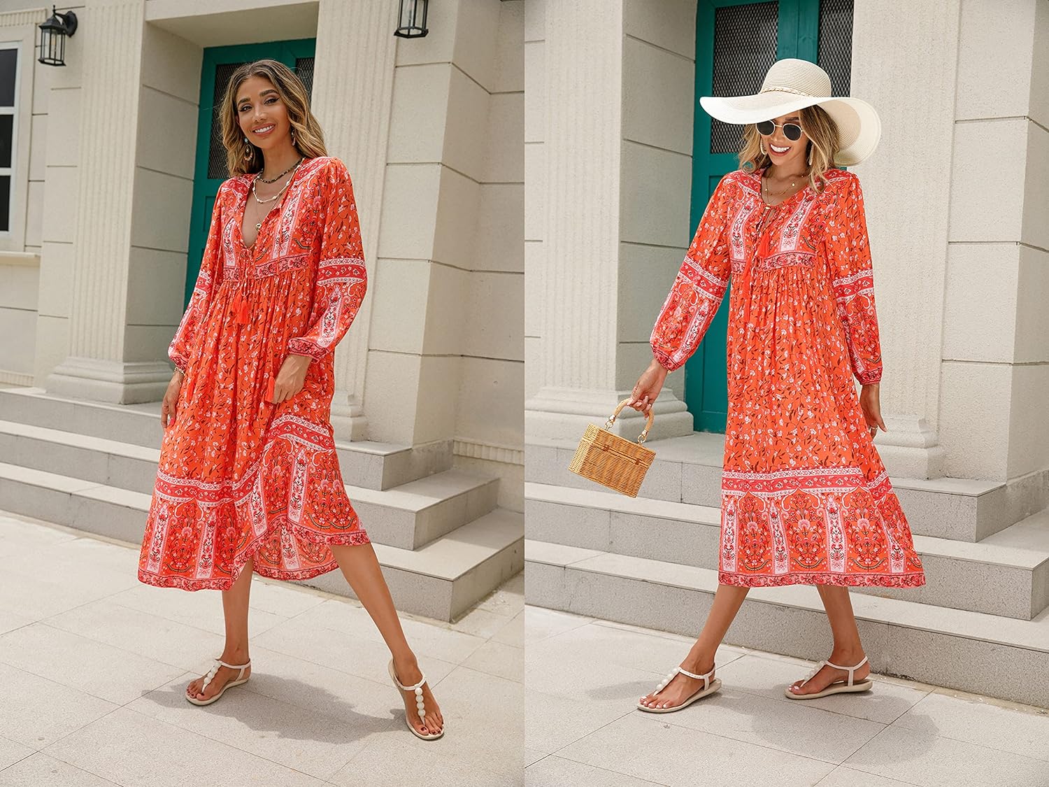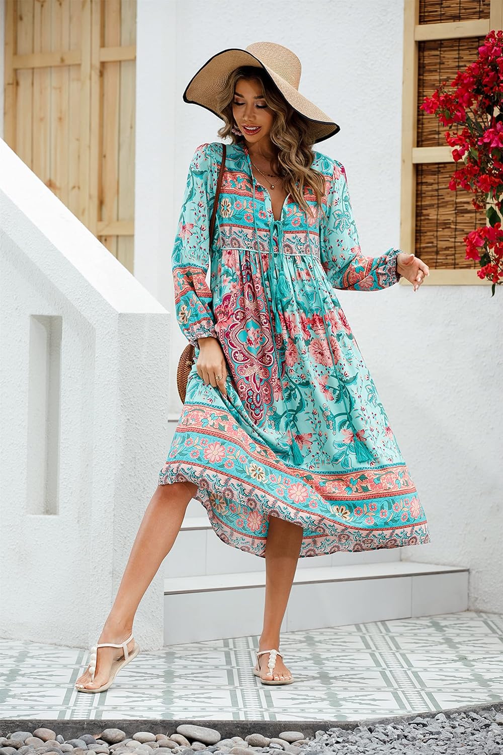 R.Vivimos Women's Long Sleeve Floral Print Retro V Neck Tassel Bohemian Midi Dresses