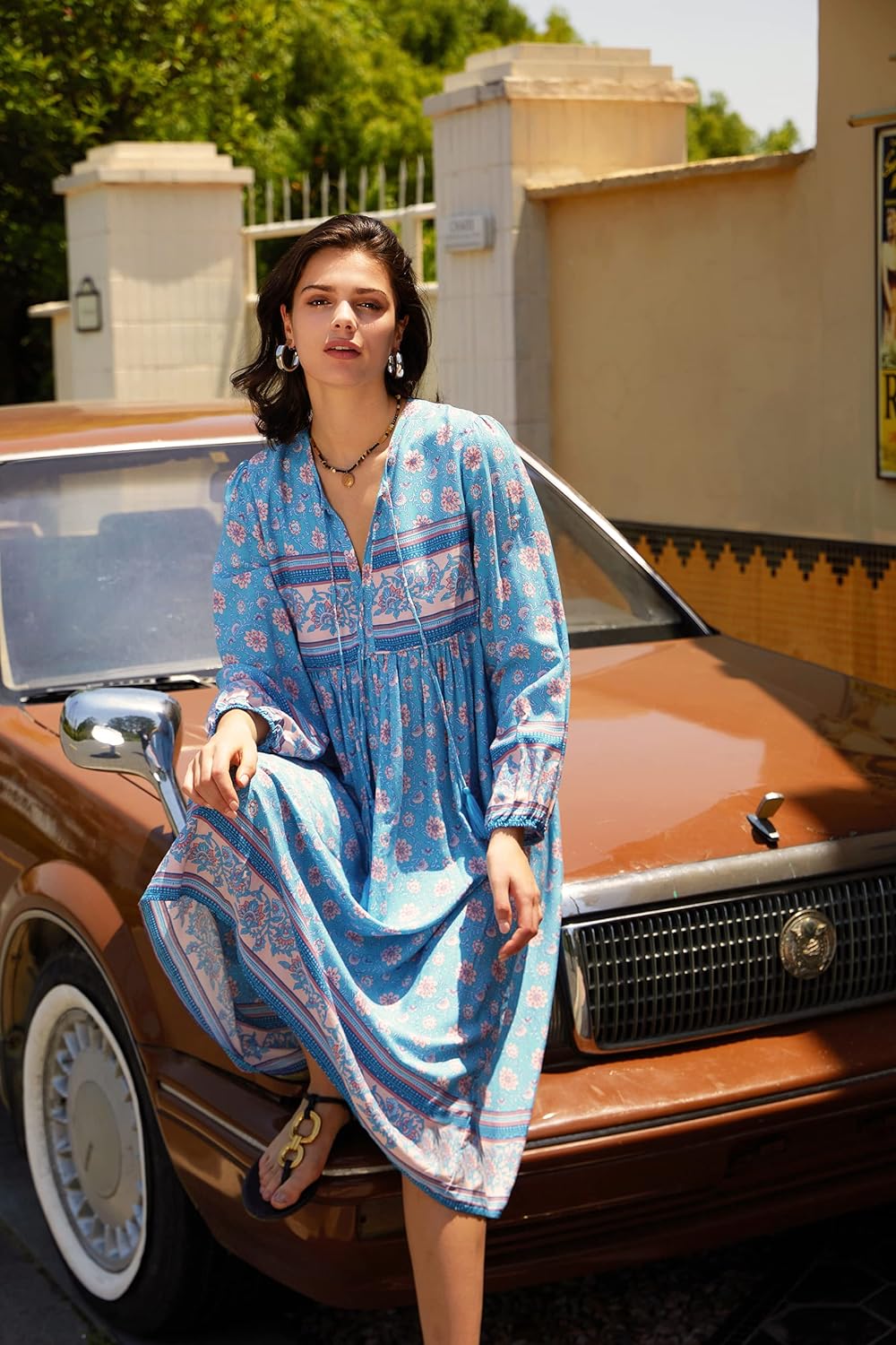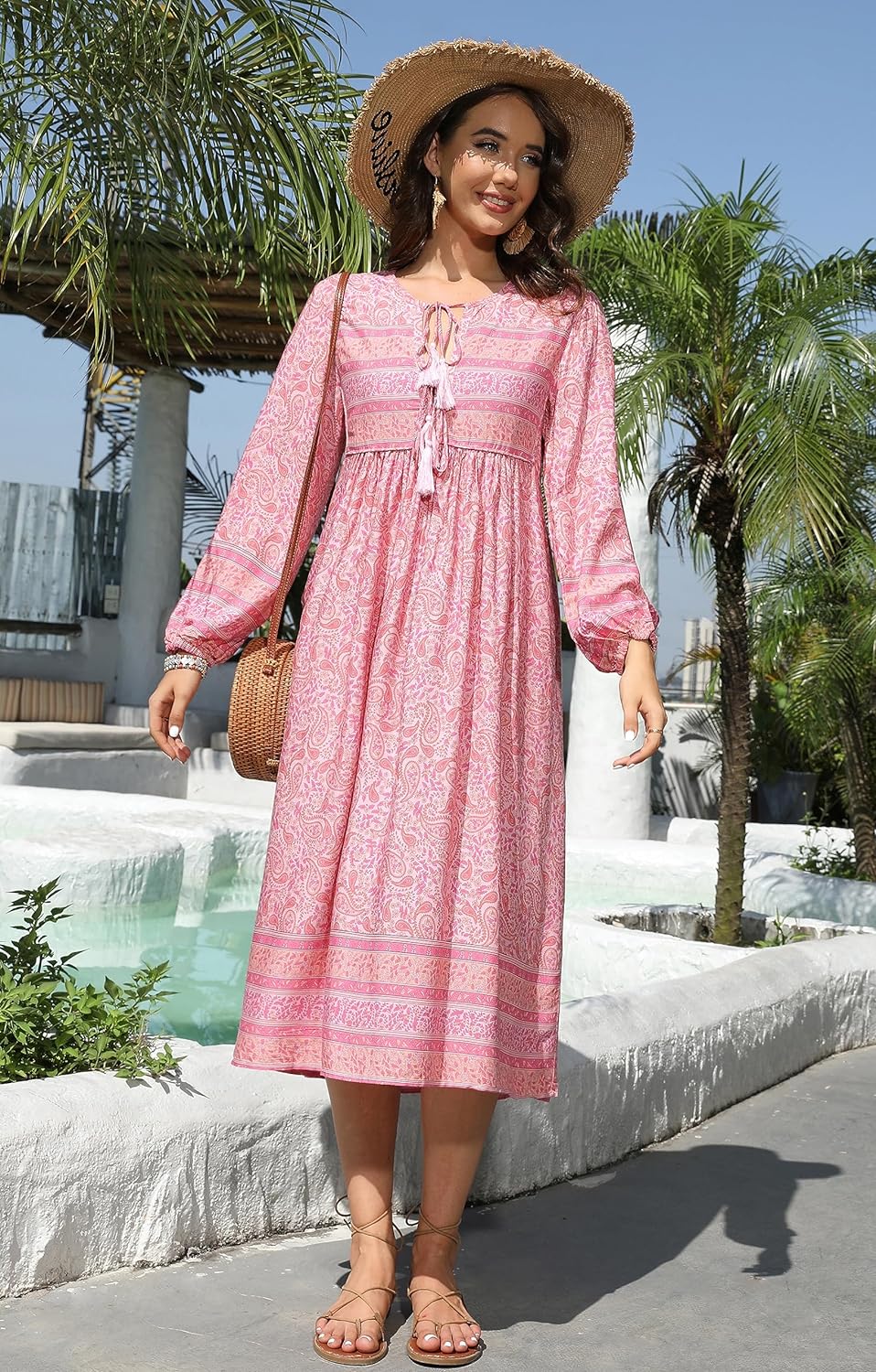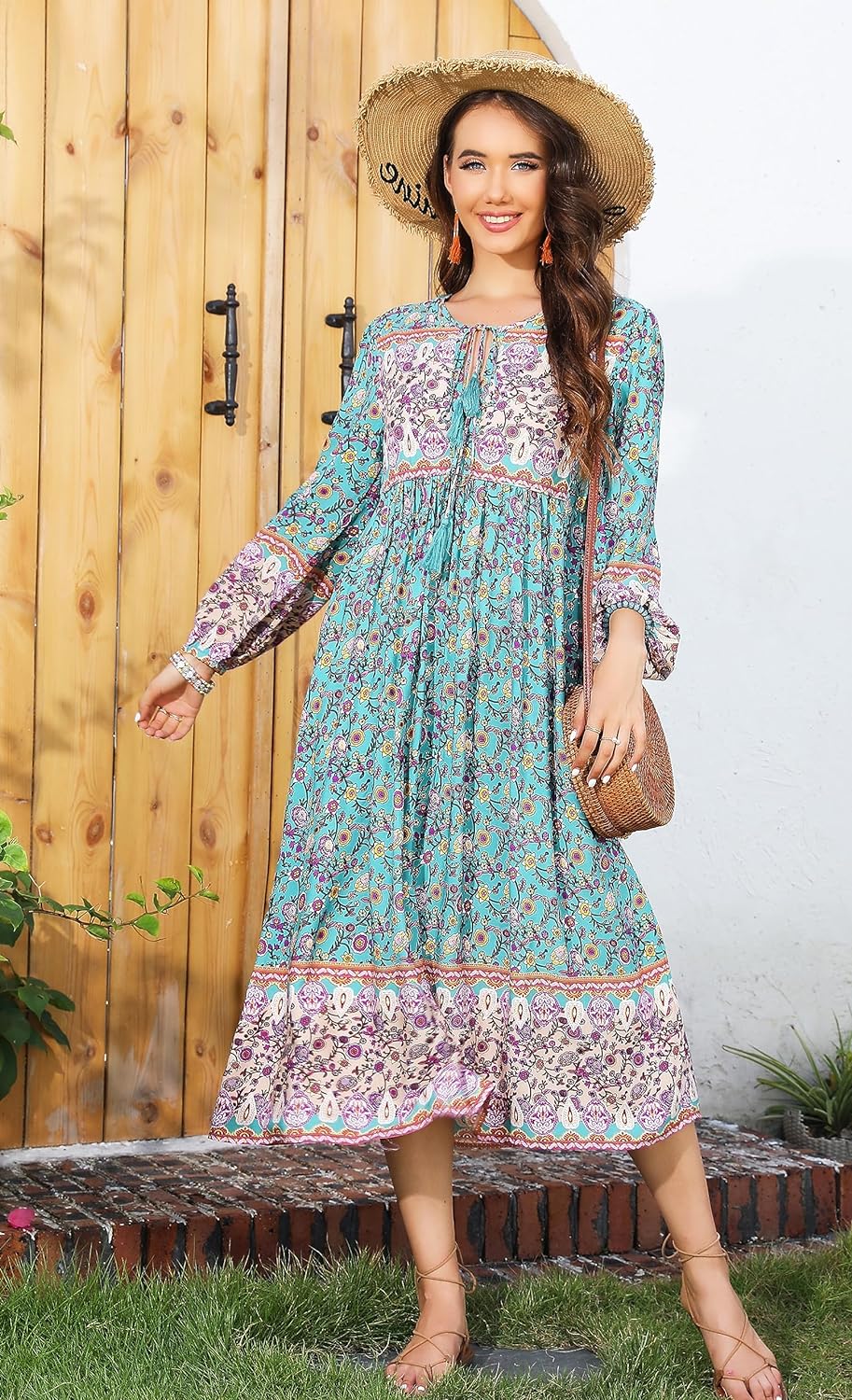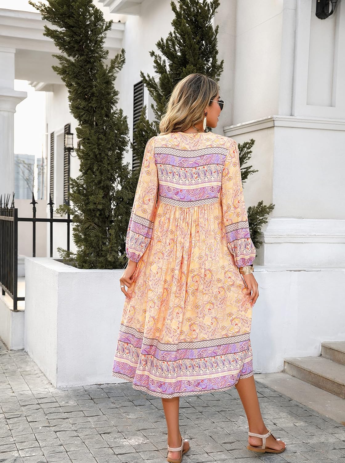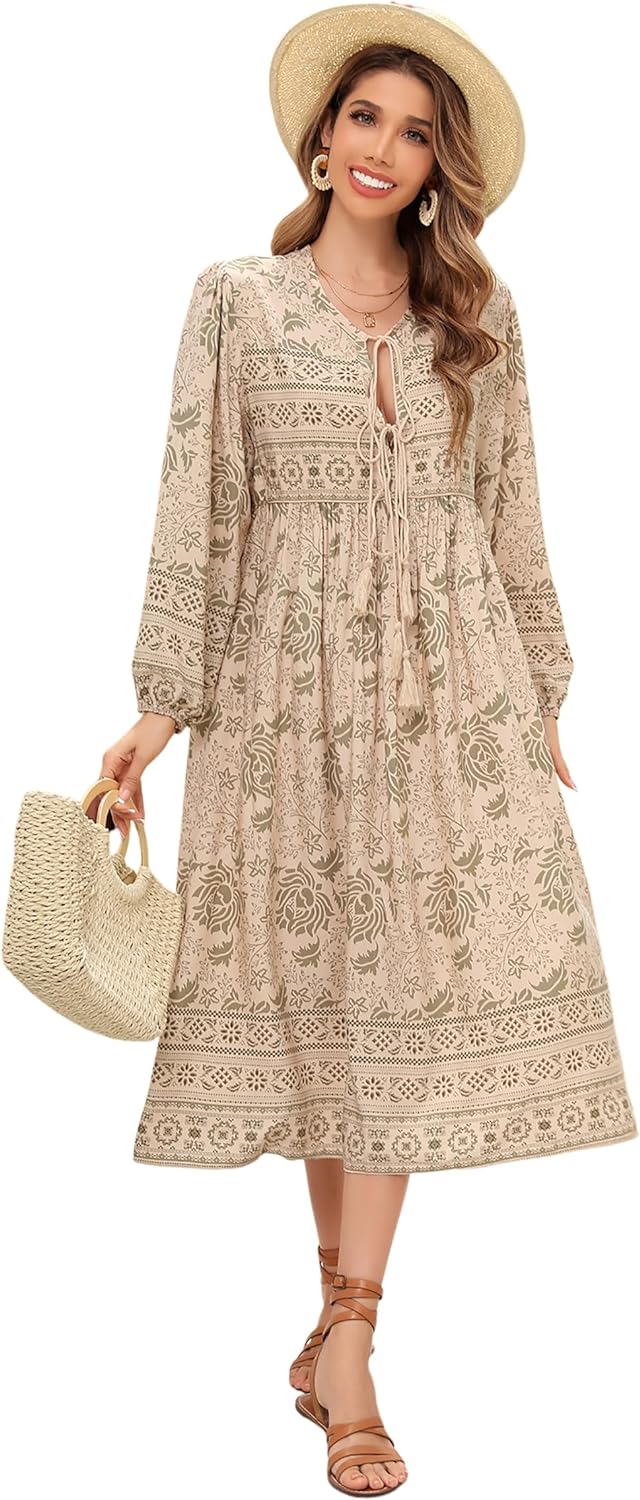 R.Vivimos Women's Long Sleeve Floral Print Retro V Neck Tassel Bohemian Midi Dresses