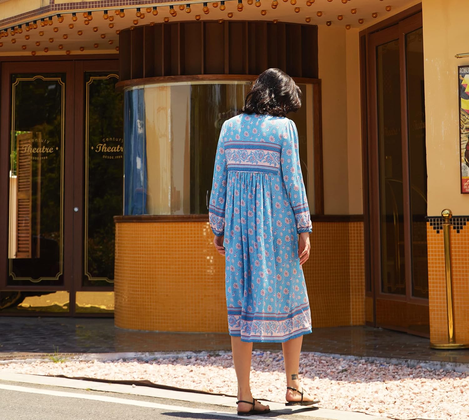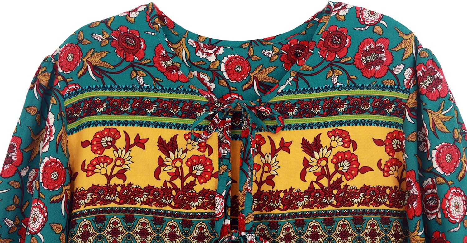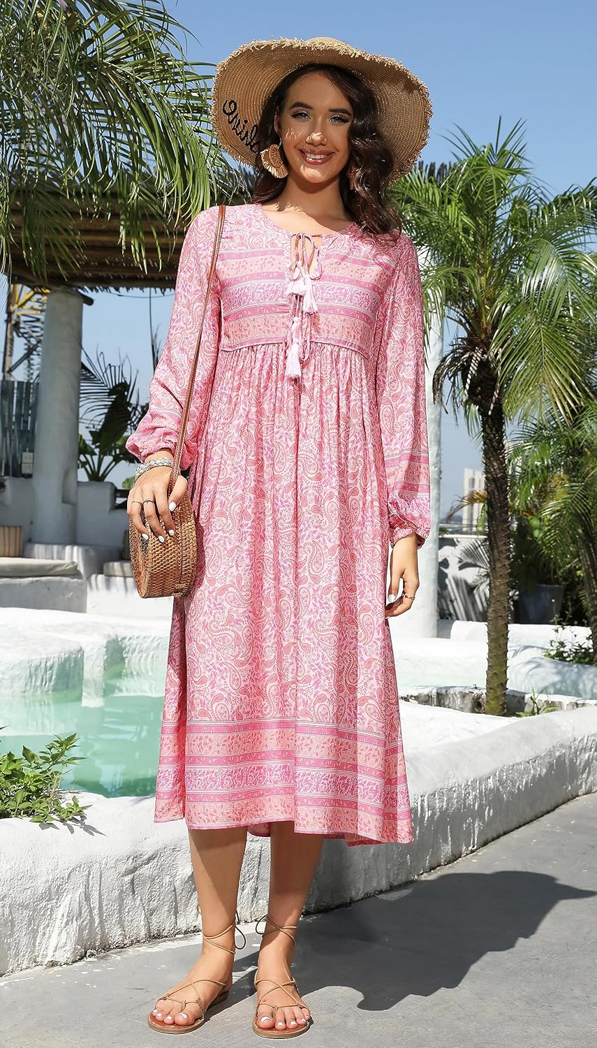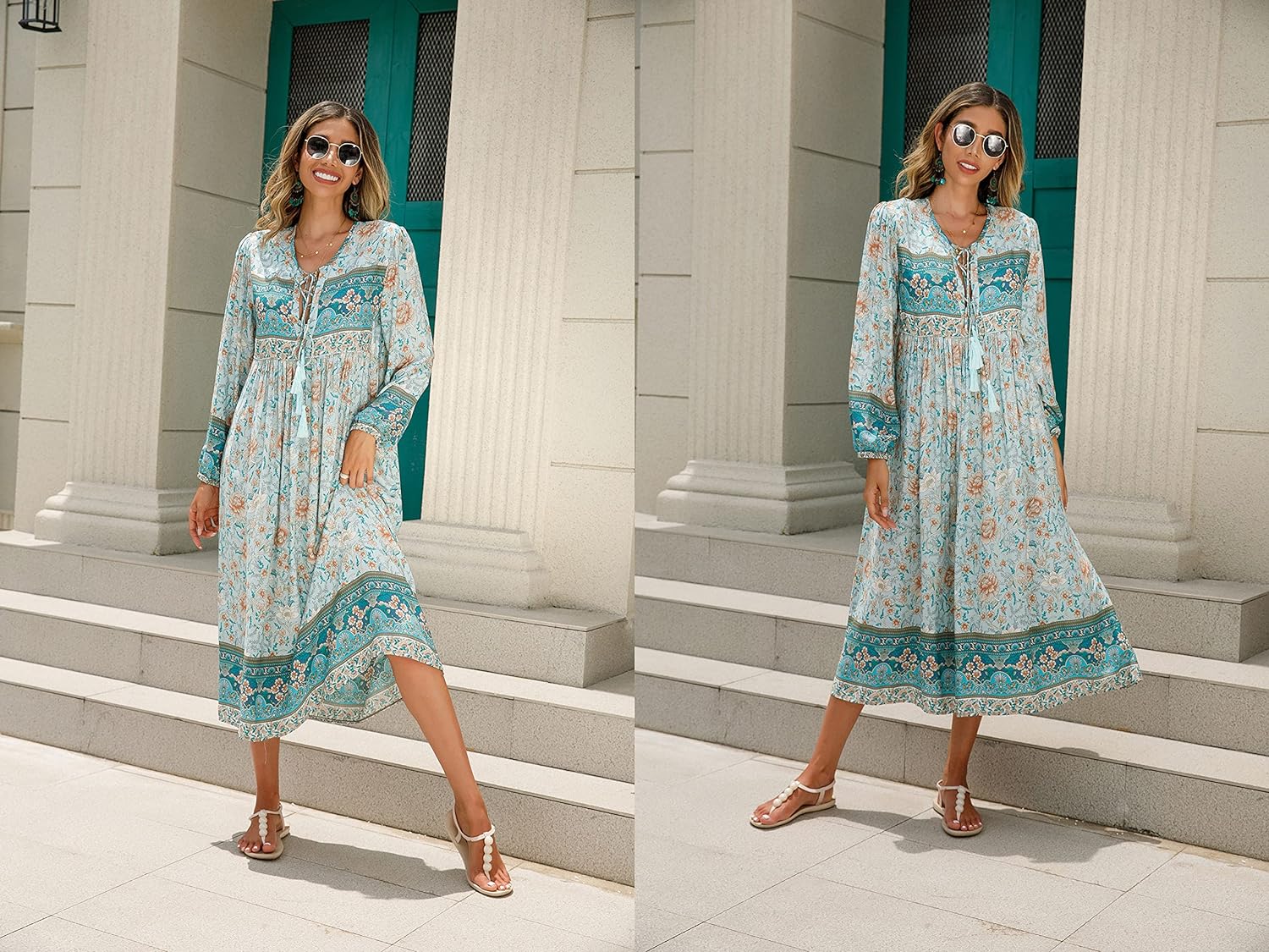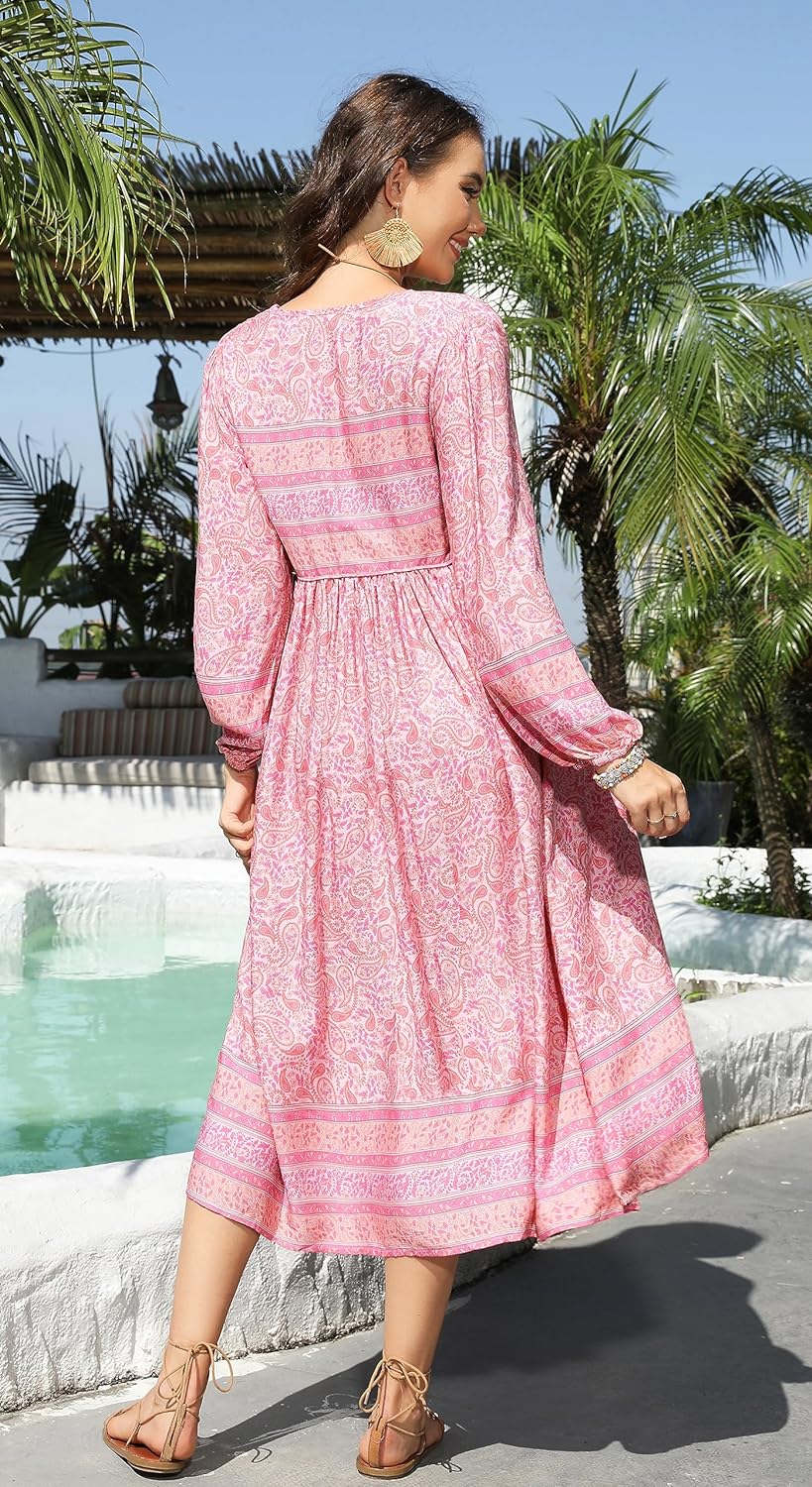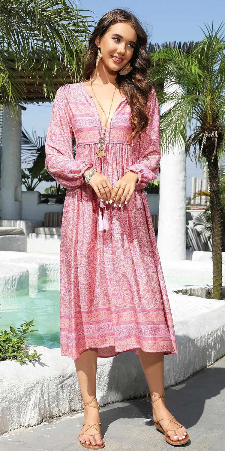 R.Vivimos Women's Long Sleeve Floral Print Retro V Neck Tassel Bohemian Midi Dresses