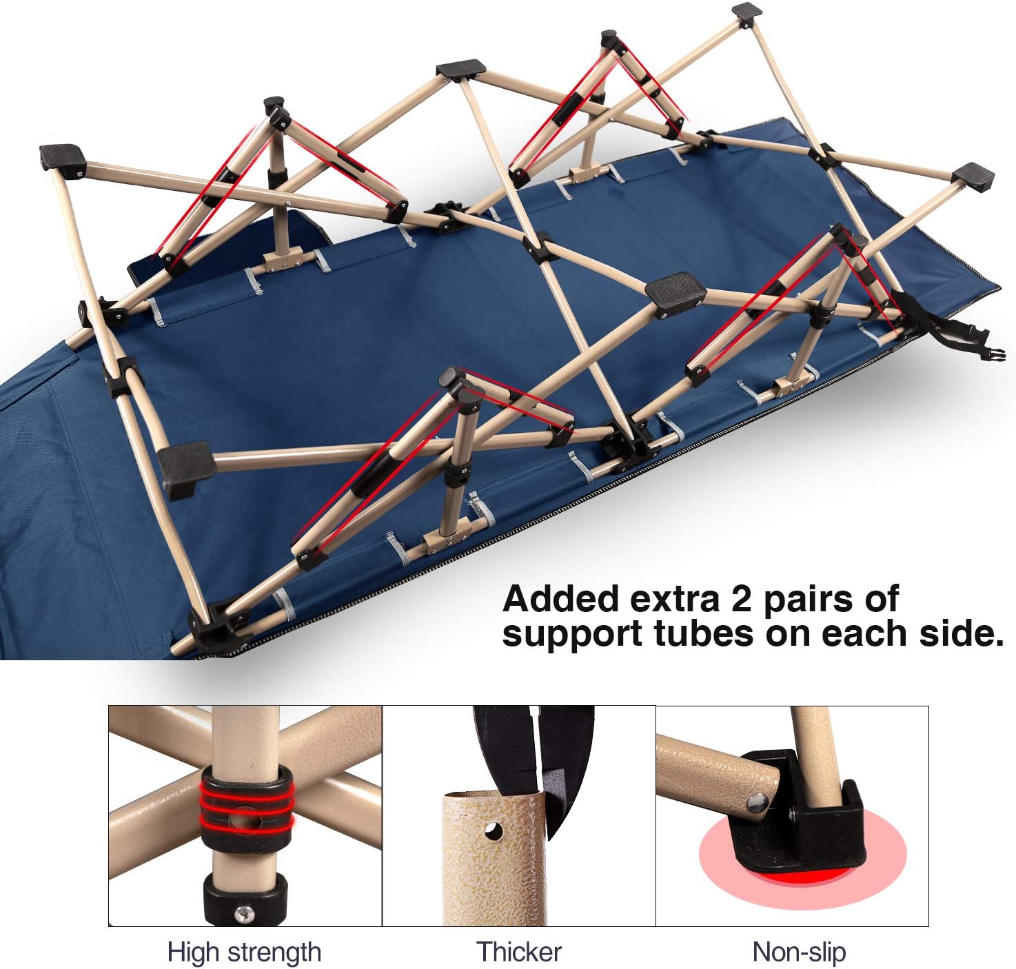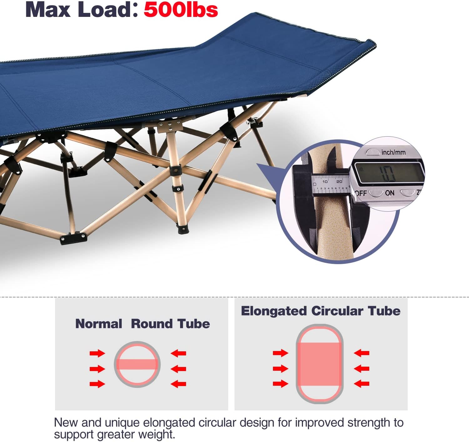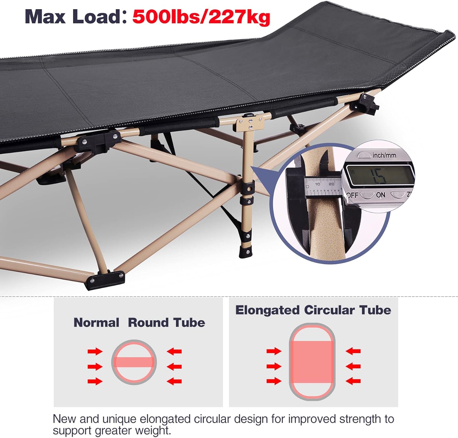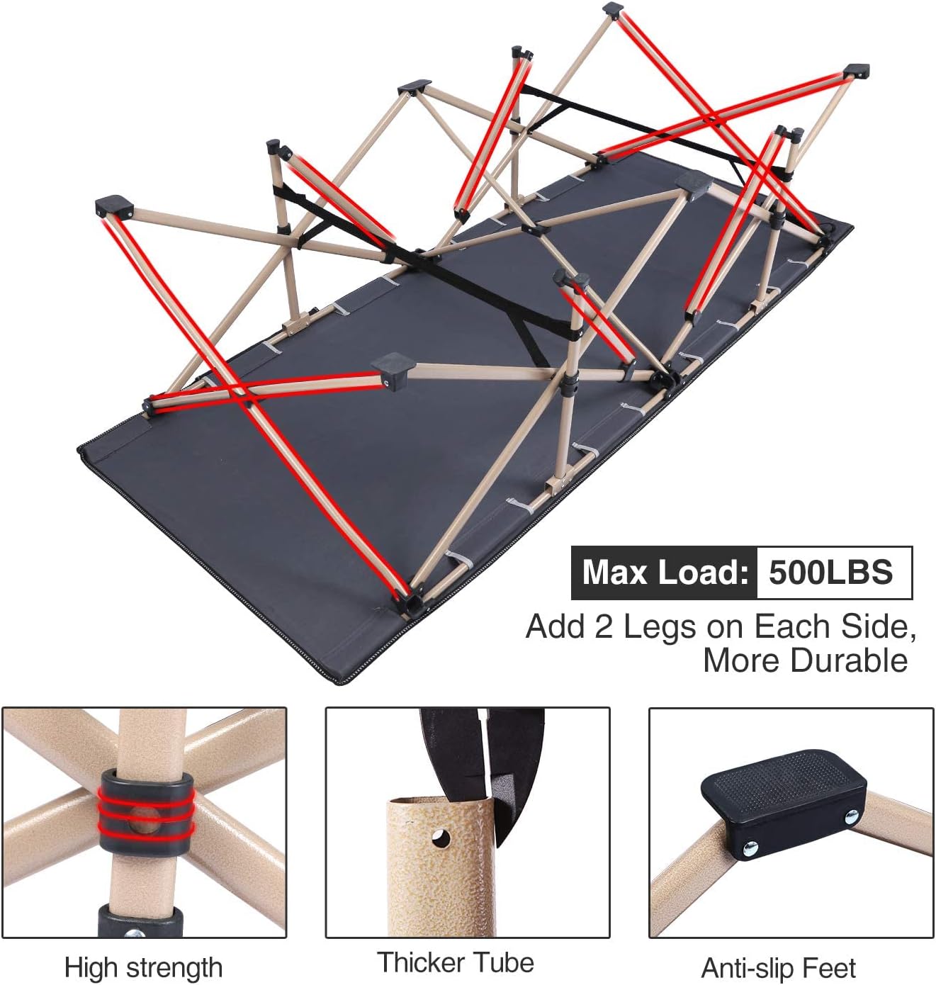 - 【STURDY & HEAVY DUTY】Finished with updated and thicker elliptical shape tubes on the cot legs, adding the camp cot to best stability and carrying capacity. It easily supports up to 500 lbs at most.