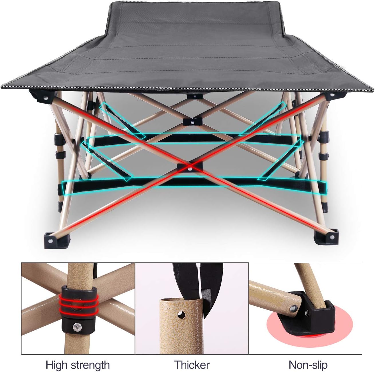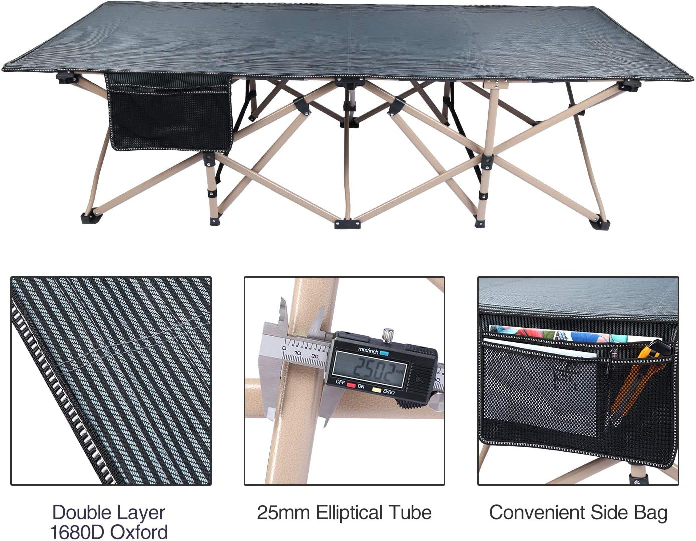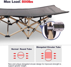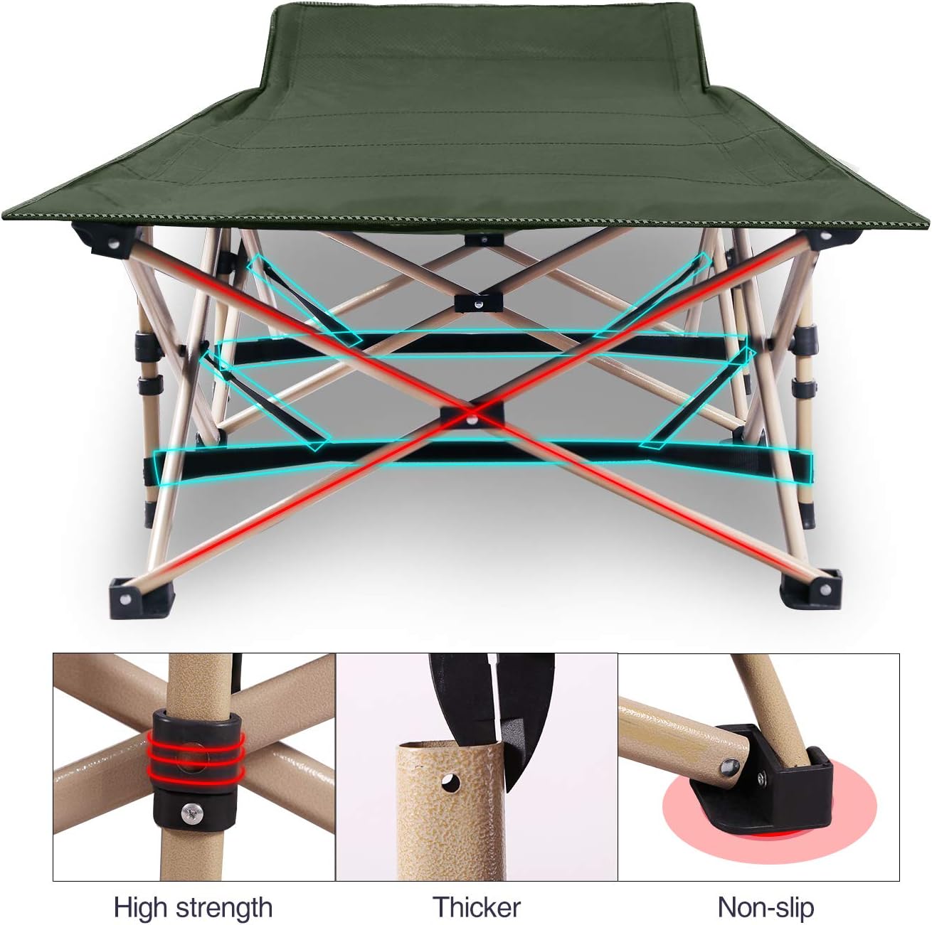 - 【STURDY & HEAVY DUTY】Finished with updated and thicker elliptical shape tubes on the cot legs, adding the camp cot to best stability and carrying capacity. It easily supports up to 500 lbs at most.