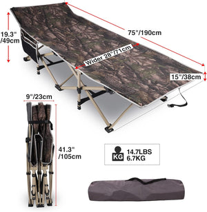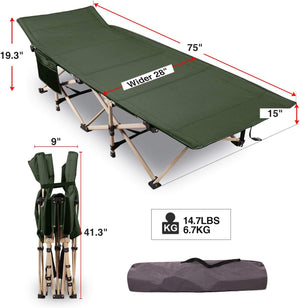 - 【LARGER SIZE】The folding cot for adults measures 75"x28"x15" when open, 1 inch wider than usual. Pack size 41"x9"x7". Weighes 14.7 pounds. The cot leg tubes measures 1.1"x1.5".