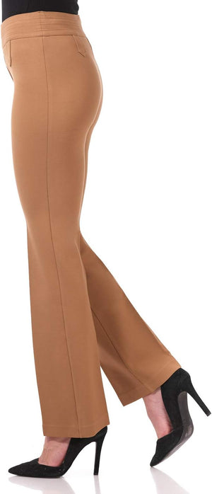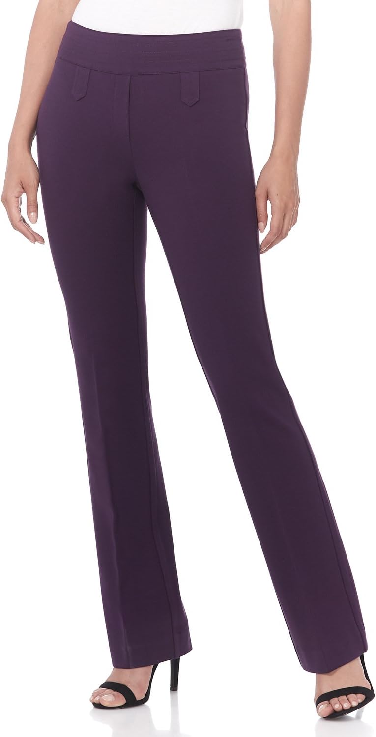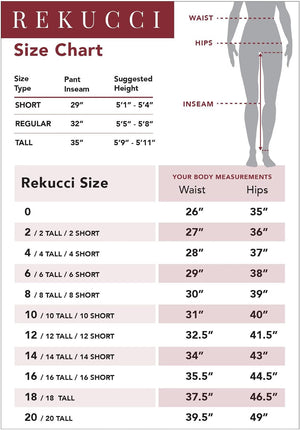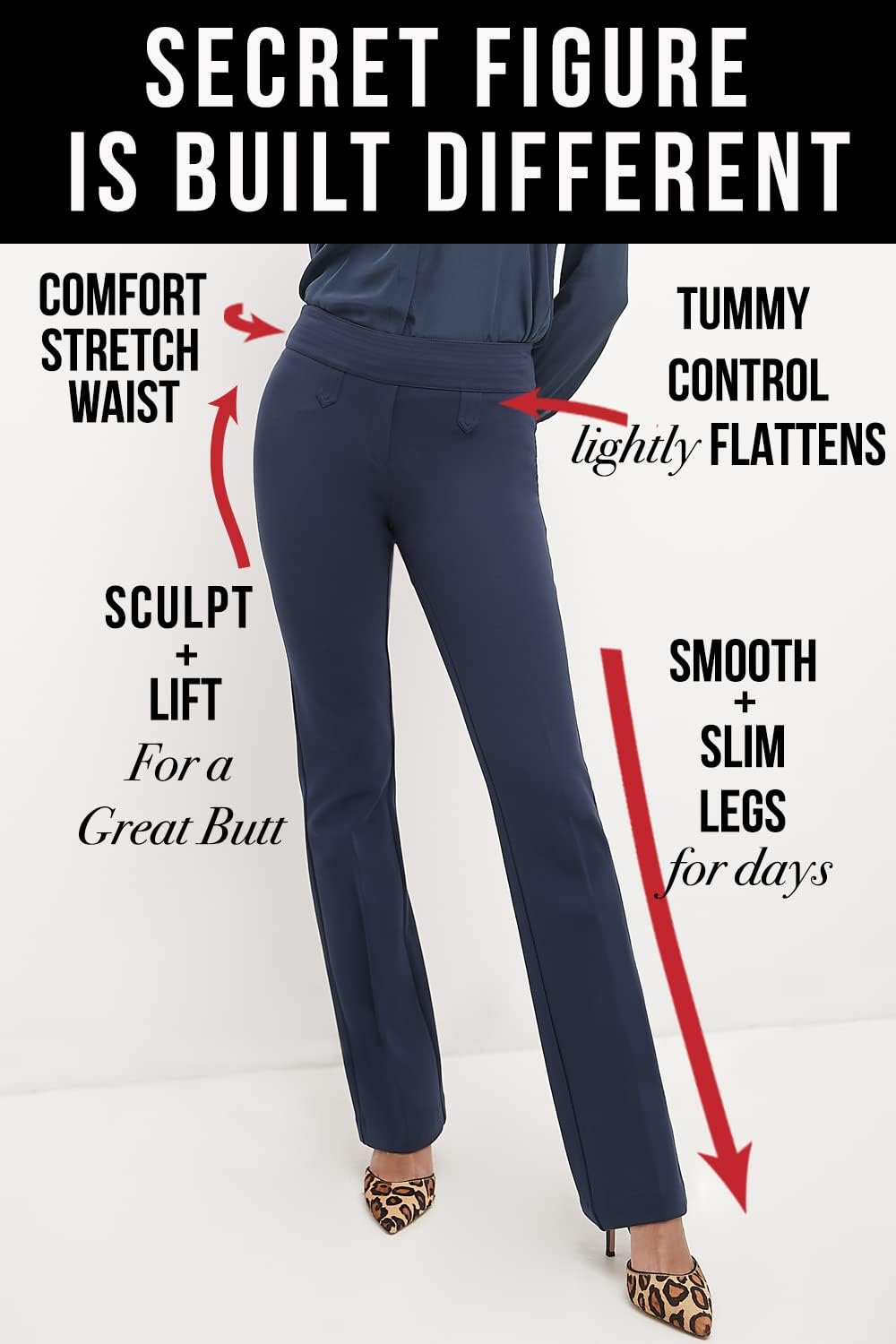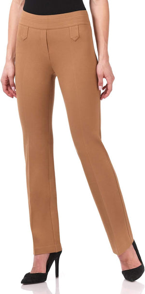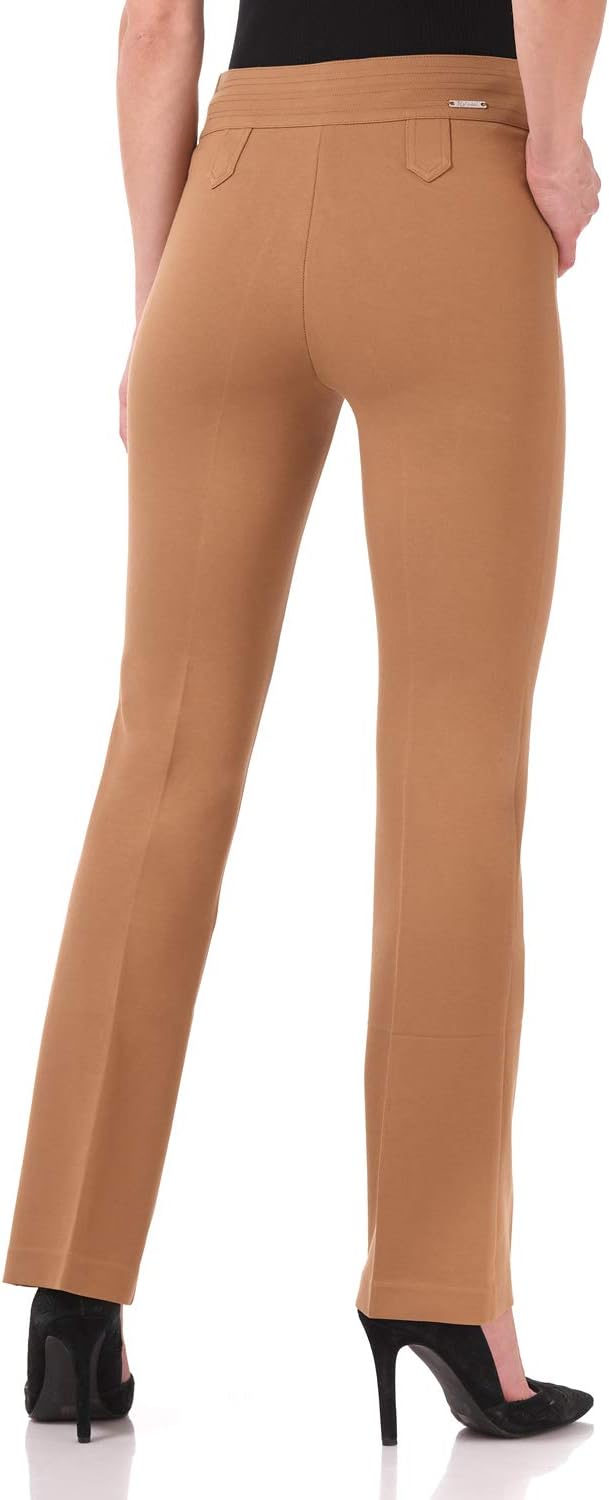 Our Rekucci Signature "Ease into Comfort" Pull-on pant, with contoured waistband, now in new Secret Figure Fit! *Secret Figure* is your secret weapon - secretly slimming your body, and flattening your tummy. Our front tummy control panel holds you in, contoured waistband smooths and flattens, while our incredible knit stretch fabric cradles your curves in all the right places. It feels like a yoga pant - but looks perfect for the office! The flattering bootcut shape visually lengthens the legs. Featuring decorative stitching on the waistband this pant will easily become your new favorite pair. Ideal for desk to dinner, or from yoga to cocktails, this pant is so comfortable and versatile we are sure you'll be wearing these pants everywhere. Crafted in our gutsy, beyond stretchy knit ponte fabric which gives this pant it's incredible compression power (think, you in without feeling uncomfortable). Thanks to the spandex it has tons of stretch and recovery, which ensures all day comfort and no bagging or sagging. Try the original office yoga pant and be amazed. Available in a wide range of colors, prints and textures. Available in sizes 2-18, and 3 lengths - regular, tall and petite we are confident you'll find something that looks and feels great.