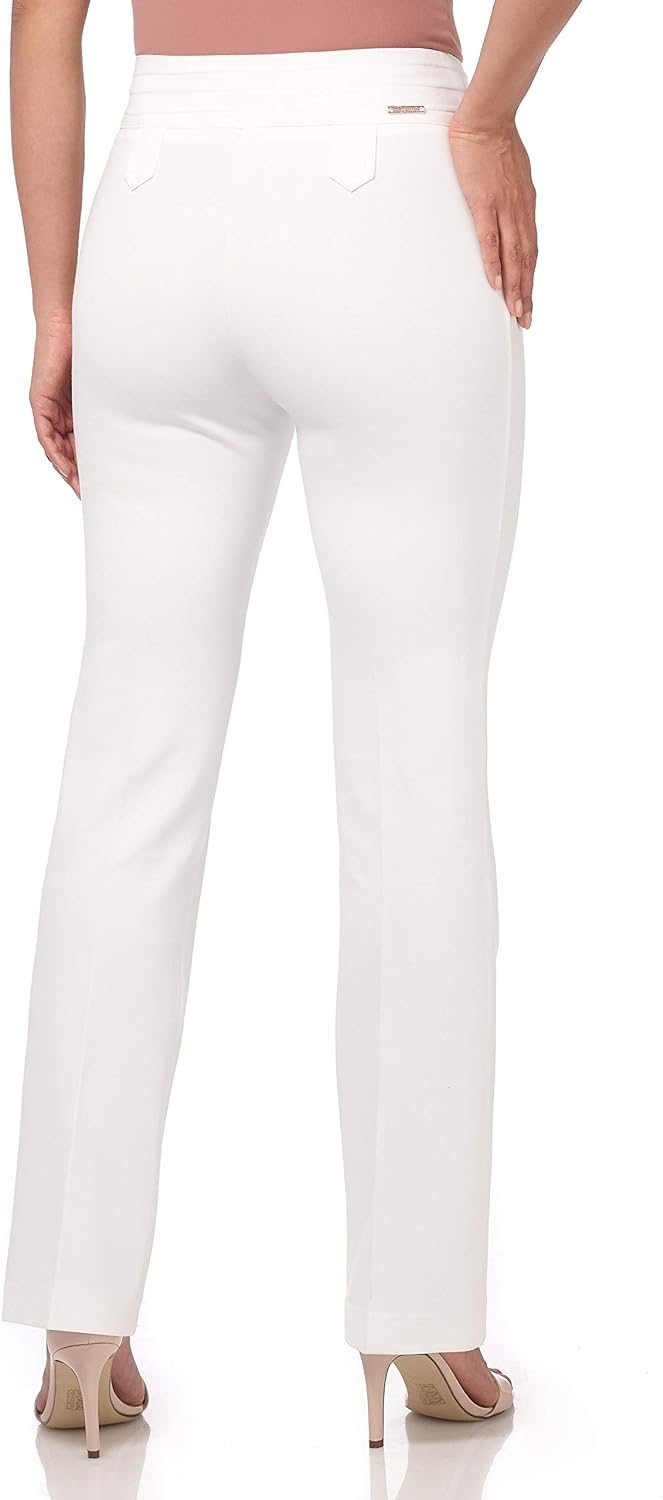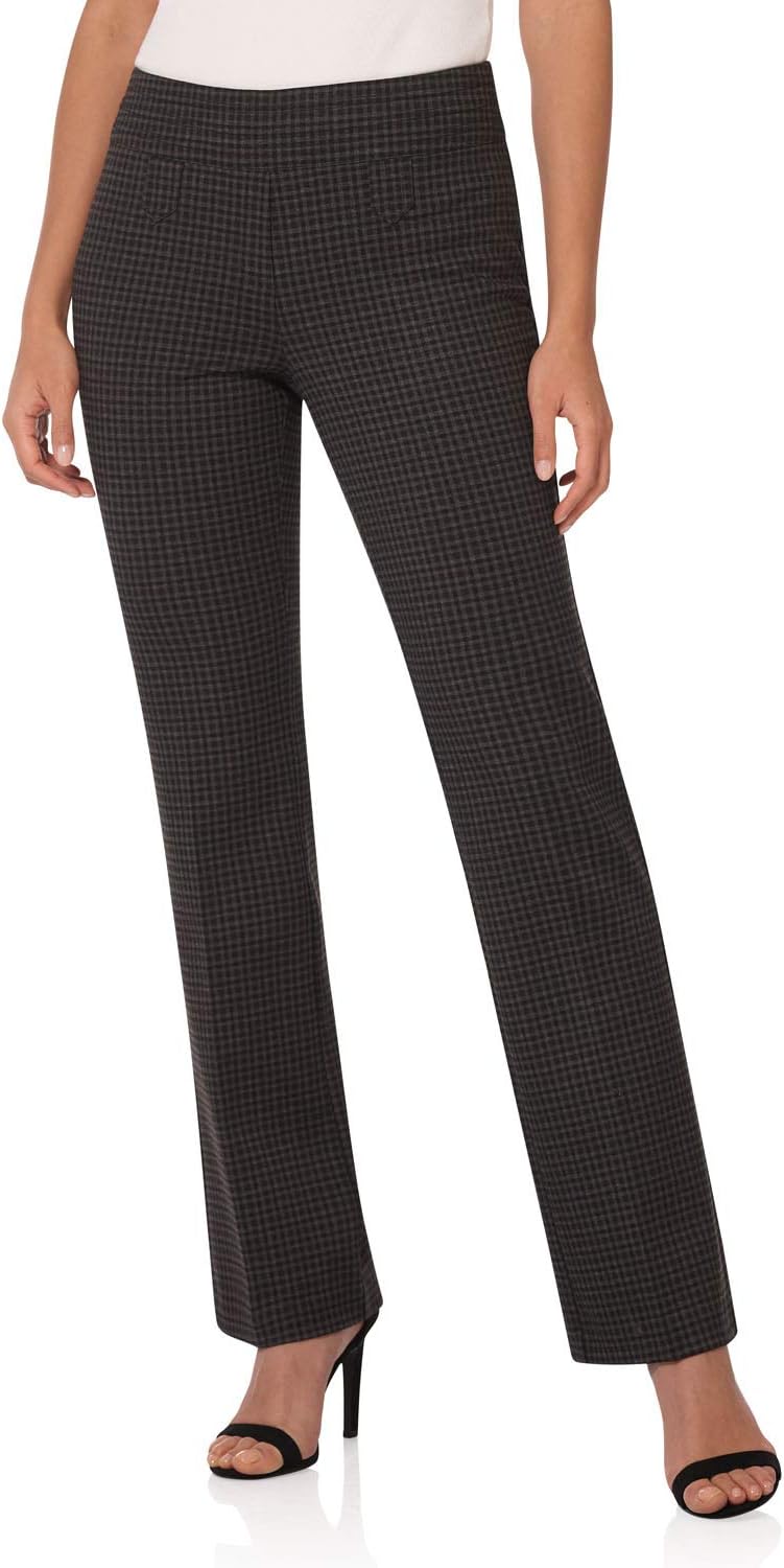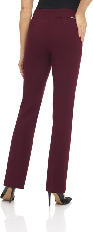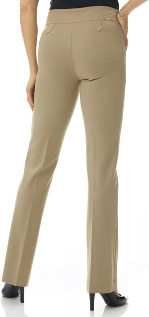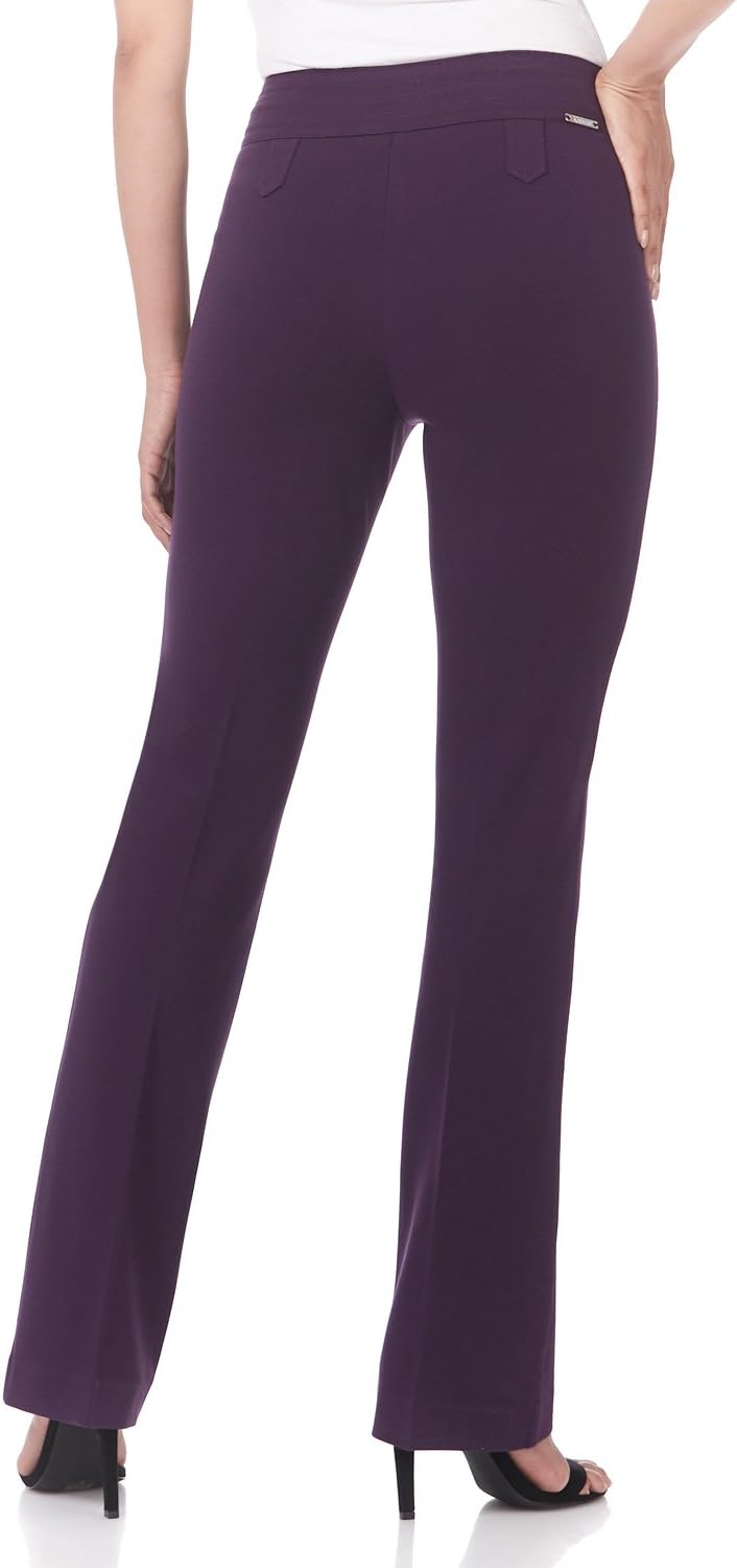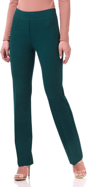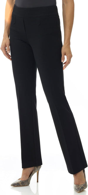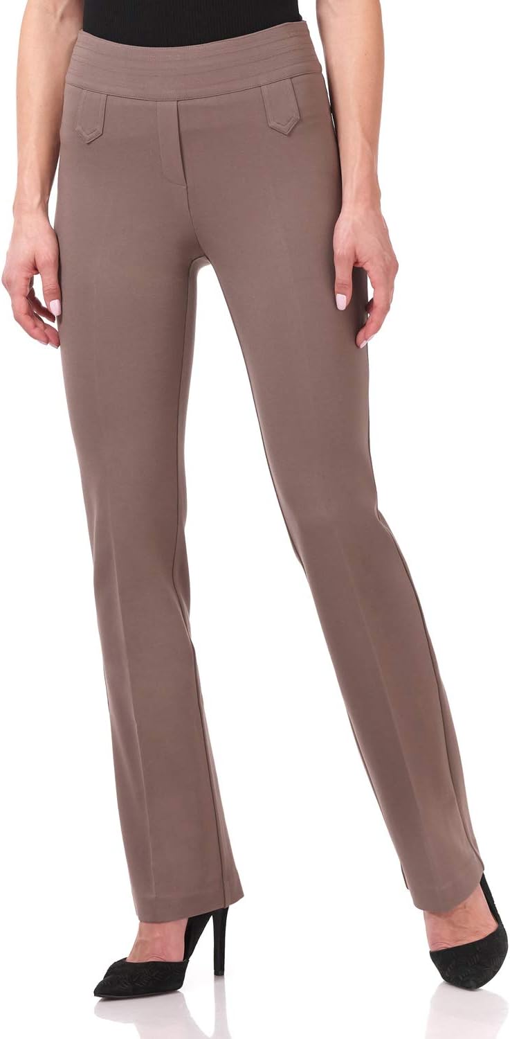 Our Rekucci Signature "Ease into Comfort" Pull-on pant, with contoured waistband, now in new Secret Figure Fit! *Secret Figure* is your secret weapon - secretly slimming your body, and flattening your tummy. Our front tummy control panel holds you in, contoured waistband smooths and flattens, while our incredible knit stretch fabric cradles your curves in all the right places. It feels like a yoga pant - but looks perfect for the office! The flattering bootcut shape visually lengthens the legs. Featuring decorative stitching on the waistband this pant will easily become your new favorite pair. Ideal for desk to dinner, or from yoga to cocktails, this pant is so comfortable and versatile we are sure you'll be wearing these pants everywhere. Crafted in our gutsy, beyond stretchy knit ponte fabric which gives this pant it's incredible compression power (think, you in without feeling uncomfortable). Thanks to the spandex it has tons of stretch and recovery, which ensures all day comfort and no bagging or sagging. Try the original office yoga pant and be amazed. Available in a wide range of colors, prints and textures. Available in sizes 2-18, and 3 lengths - regular, tall and petite we are confident you'll find something that looks and feels great.