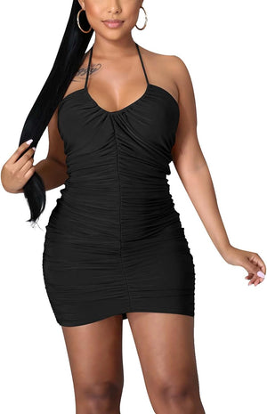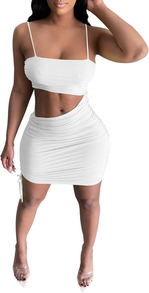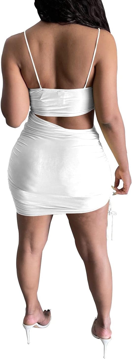 Remelon Womens Sexy Sleeveless Spaghetti Cutout Ruched Drawstring Bodycon Mini Club Dress Outfit