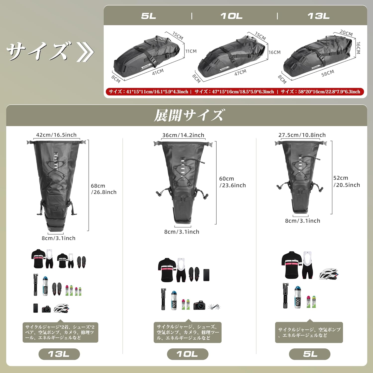 - Note: Only 13L with Air Valve. 10L and 13L with one lang buckle belt.(length 145cm, width 2.5cm, affordable 30kg). Suit for mid-long distance outdoor riding. It can be installed on folding bike, mountain bike, road bike and touring bike.