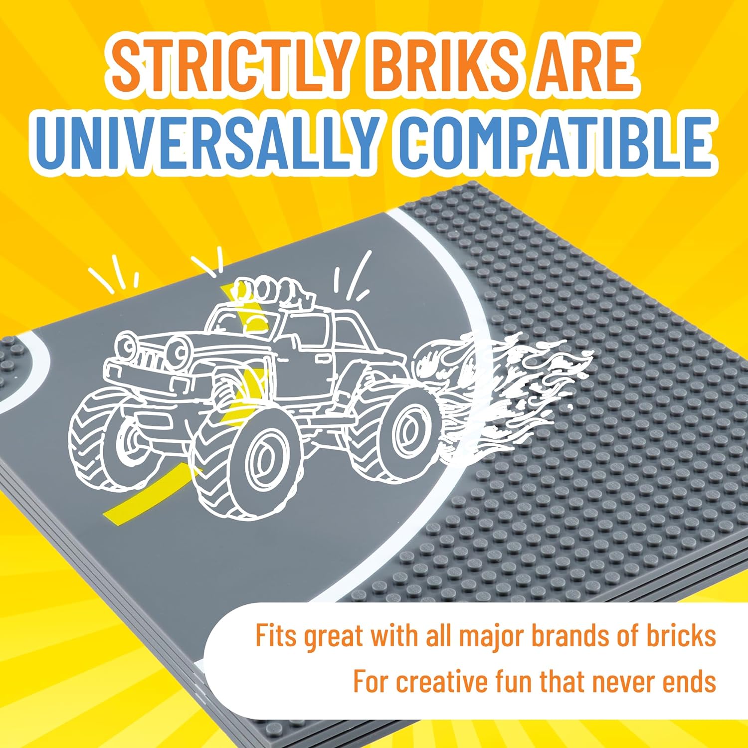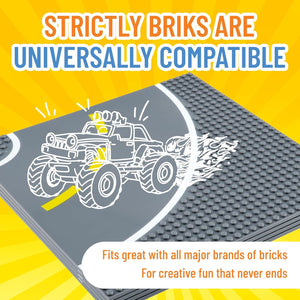 - UNLEASH YOUR CREATIVITY: With baseplates designed for cars on the road toys, you can build bustling cities and towns from the ground up. The smooth surface allows for seamless vehicle movement while surrounding pegs provide endless possibilities for vertical construction. These stackable baseplates offer even more options for building, including highways, freeways, and multi-level toy garages. With Strictly Briks, your imagination has no limits. Start building your dream world today!
