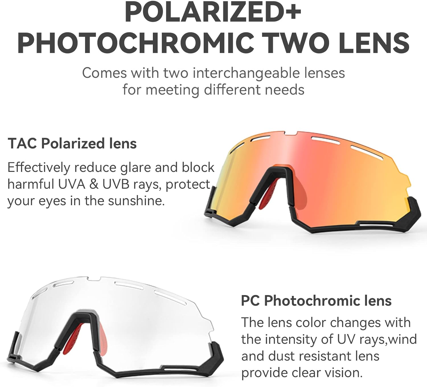 ROCKBROS Mountain Bike Glasses for Men Cycling Glasses with Interchangeable Polarized + Photochromic Lenses Sport Sunglasses, Black-red, Medium