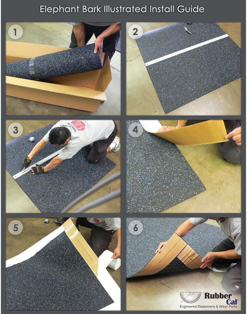 Rubber-Cal's "Elephant Bark" Rubber Flooring Rolls are a thick, durable product available in a width of 4 feet and in many length variations. With a thickness of 3/8-inch, this roll of rubber offers a superior flooring option that is made from recycled materials, can be used in numerous applications, and is an easy DIY project which makes it even more affordable! This black rolled flooring is an eco-friendly product made from recycled waste tires. The raw material is shredded into rubber crumb where non-rubber materials, like metal fibers, are removed. The tire crumb is then reconstituted by molding it using a polyurethane adhesive for sturdy recycled flooring. Since it is made from used tires, this rubber flooring is able to withstand harsh conditions, making it ideal for many demanding applications such as: mats for gym and fitness, outdoor flooring, rubber garage flooring, flooring in a basement, or heavy equipment floor mats. In addition to being a versatile product, the "Elephant Bark" is easy to install! Using a double-sided carpet tape on the perimeter of the product, you can have it laid out in an instant. This recycled flooring is a suitable option made from used tires for an eco-friendly roll of rubber that fits any application. It can be used for indoor or outdoor flooring due to the sturdiness of the material. Its easy installation makes a simple DIY project that can be done by almost anyone! For a reliable and efficient product, lay down the "Elephant Bark" on your floors today!