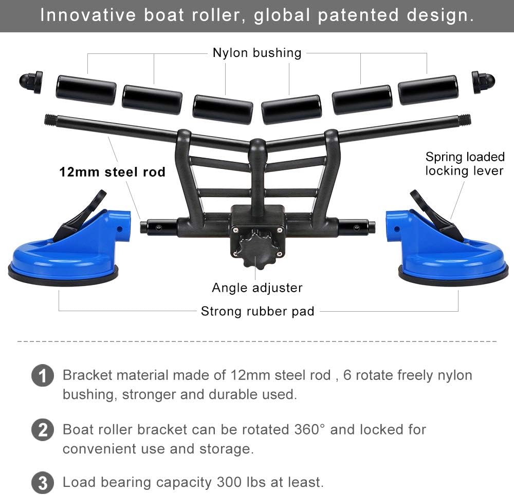 SELEWARE Innovative Boat Roller Loader with Heavy-Duty Suction Cups Assist for Mounting Kayaks and Canoes to Car Tops, Angle Adjustable, Load up to 300 lbs, Steel and Nylon Bushing
