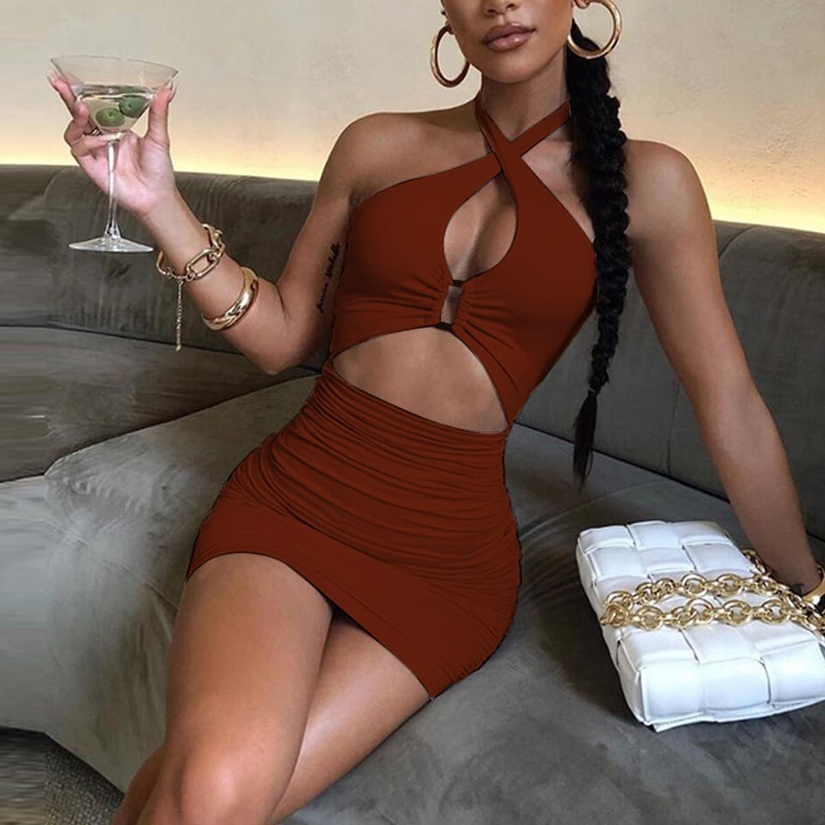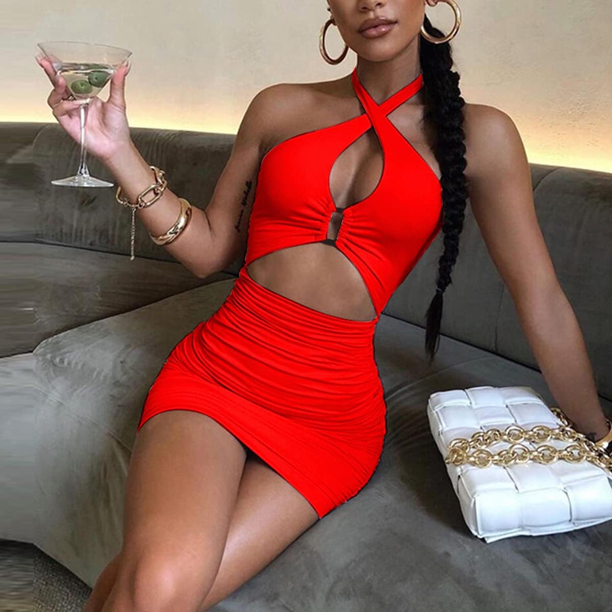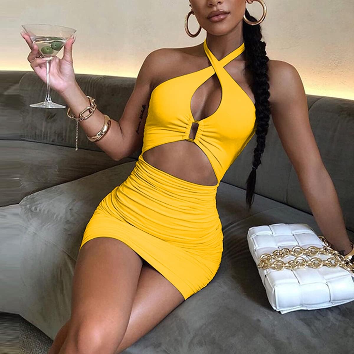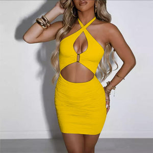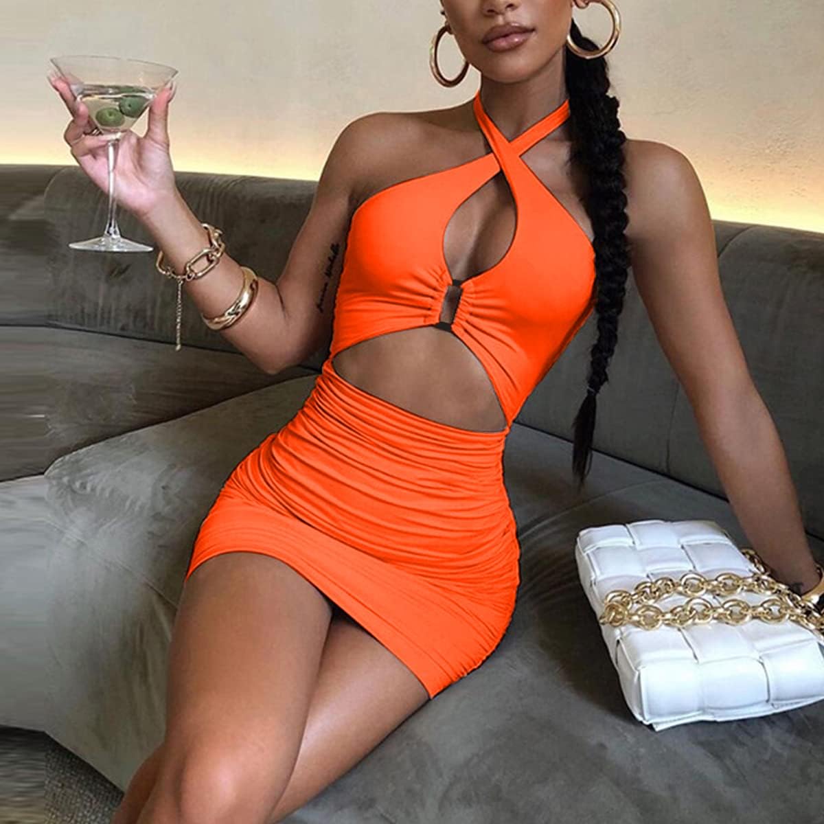 SHESEEWORLD Women's Sexy Club Sleeveless Halter Neck Ruched Bodycon Mini Party Dress Clubwear