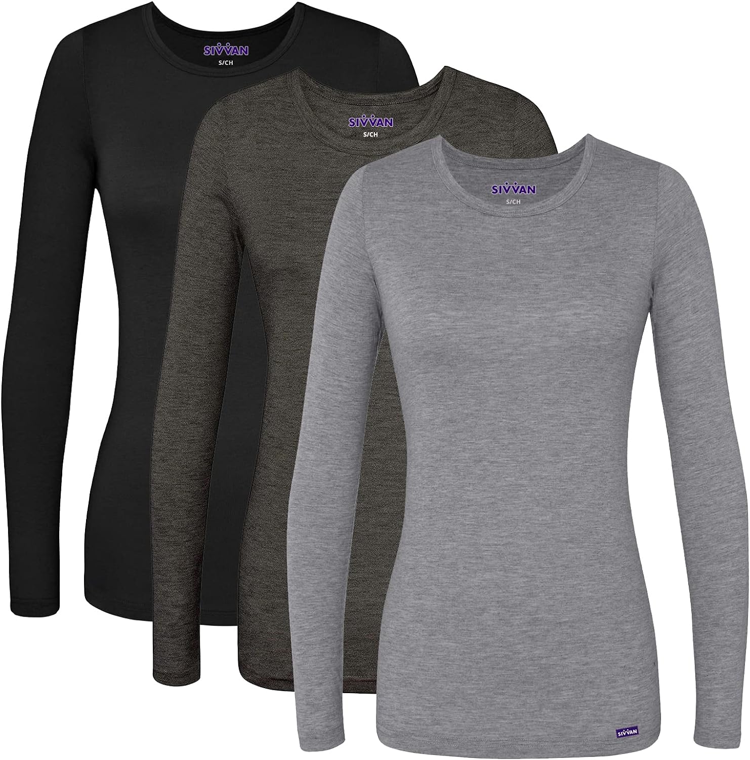 Sivvan Scrubs for Women - Long Sleeve Comfort Underscrub Tee Multicolor 3-Pack - S85003M - Black/Dark Marl Gray/Heather Charcoal - S