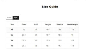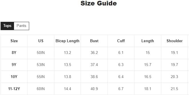 11-12Y: Bicep Length: 14.4", Bust: 40.9", Cuff: 6.7", Tops Length: 18.1", Shoulder: 21.5", Sleeve Length: 18.7", Hip Size: 29.1", Thigh: 17.8", Waist Size: 24.4-34.6"