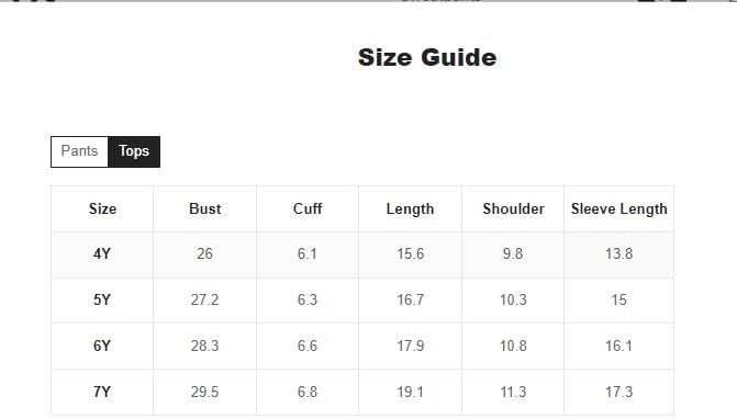 8Y: Bicep Length: 13.2", Bust: 36.2", Cuff: 6.1", Tops Length: 15", Shoulder: 19.1", Sleeve Length: 15.6", Hip Size: 24.4", Thigh: 15", Waist Size: 20.5-29.9",