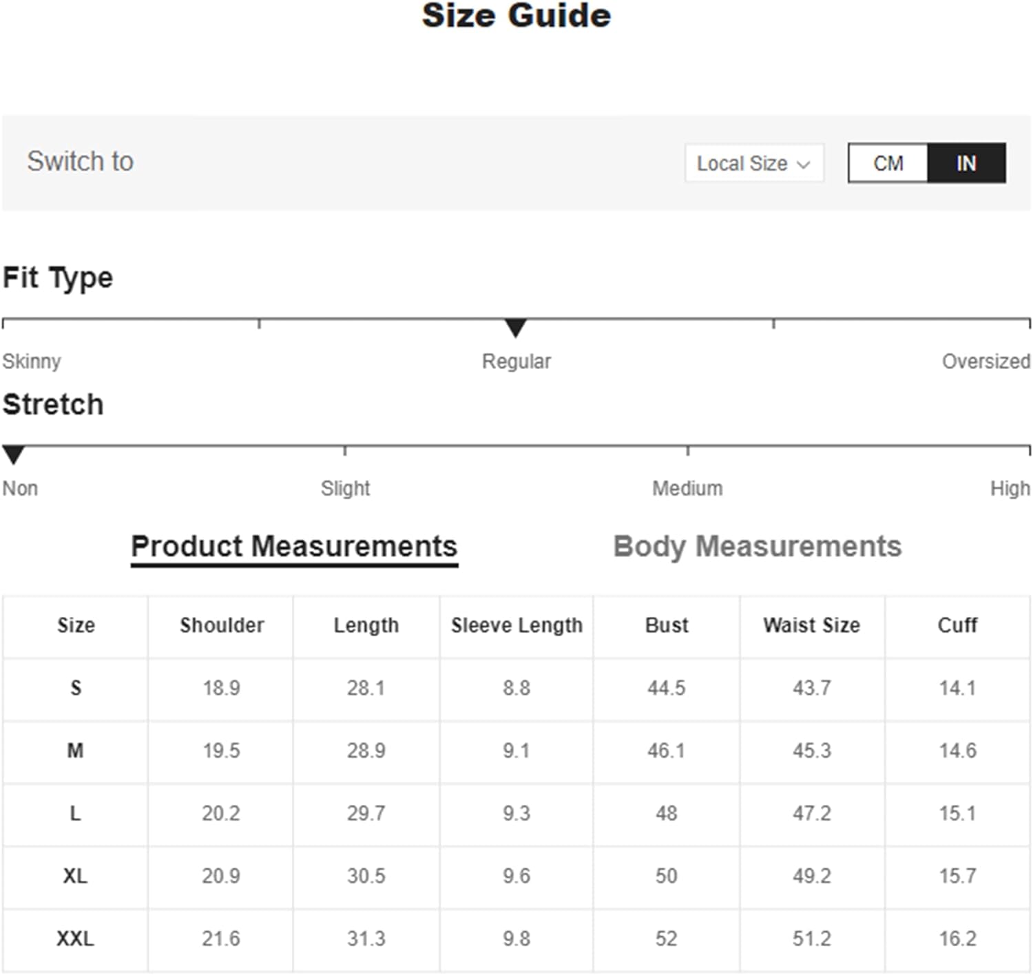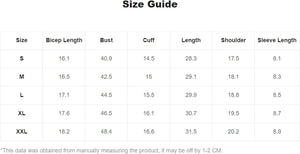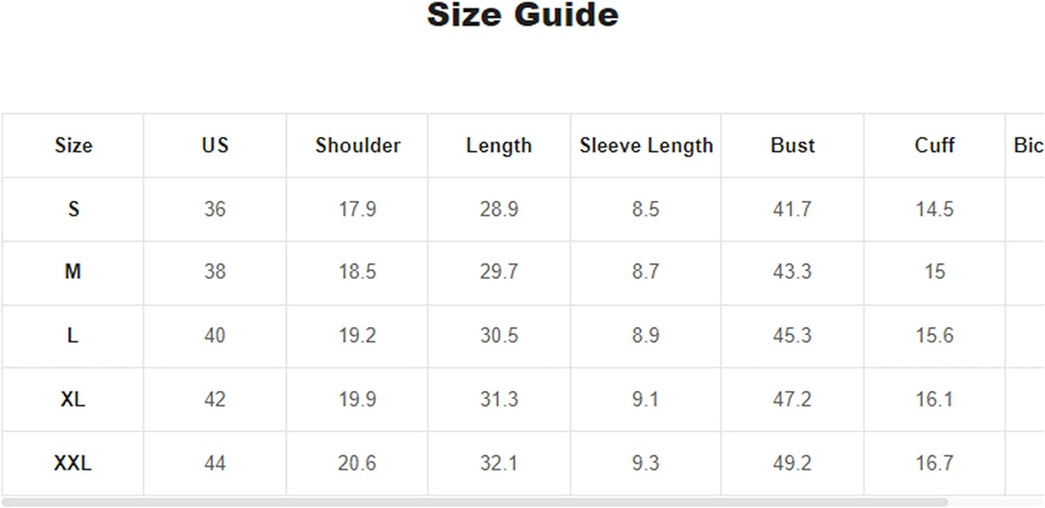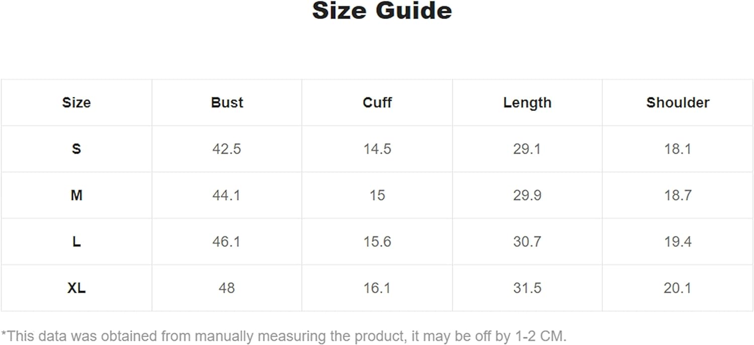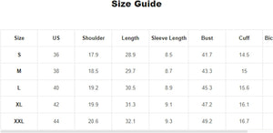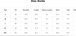Large: Shoulder: 19.3", Bust: 47.2", Length: 29.5", Sleeve Length: 8.1",