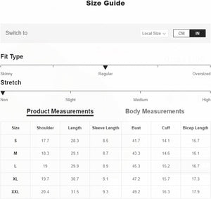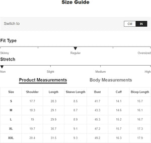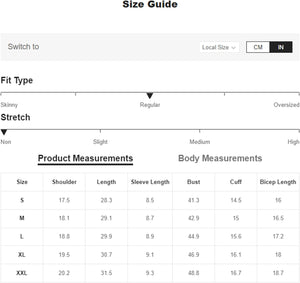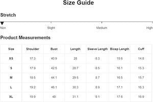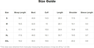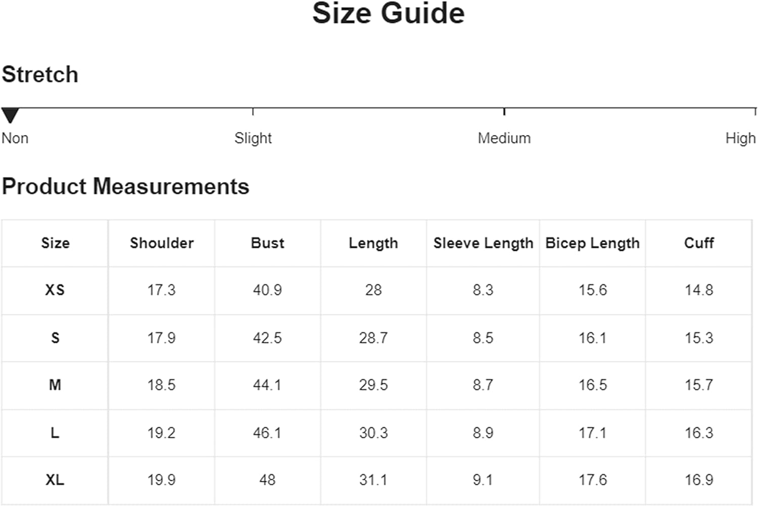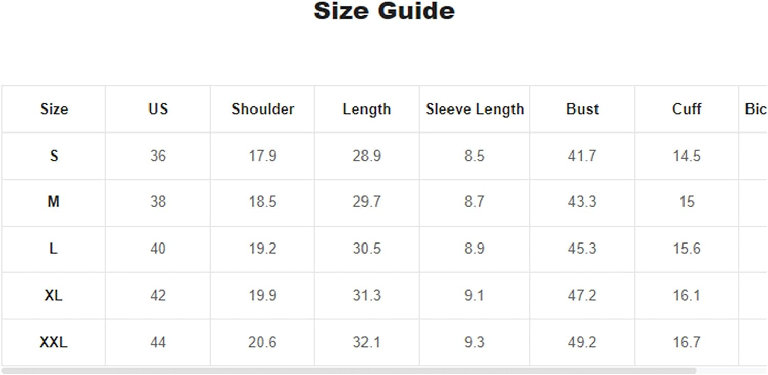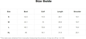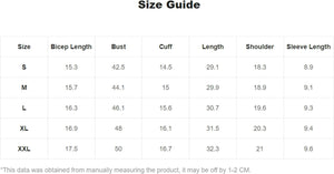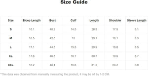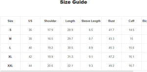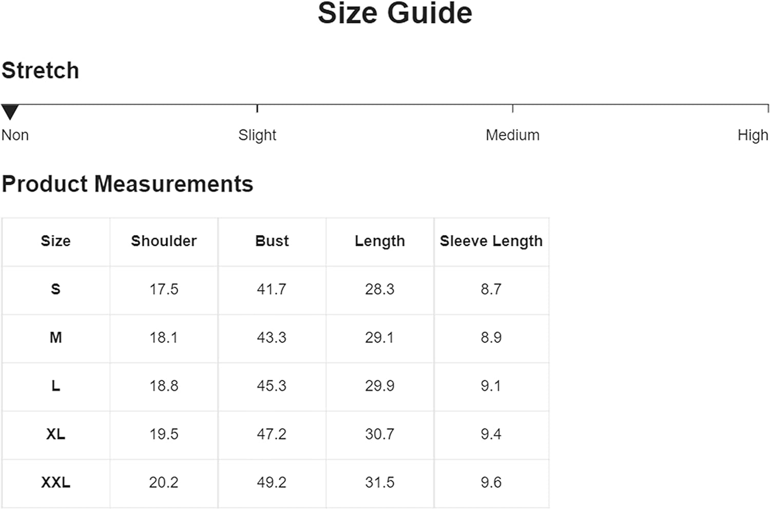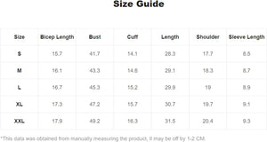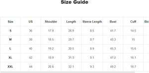 X-Large: Shoulder: 20.1", Bust: 48.8", Length: 30.3", Sleeve Length: 8.3"