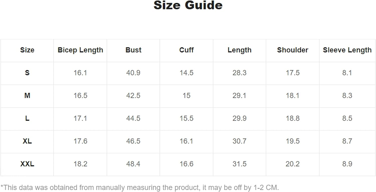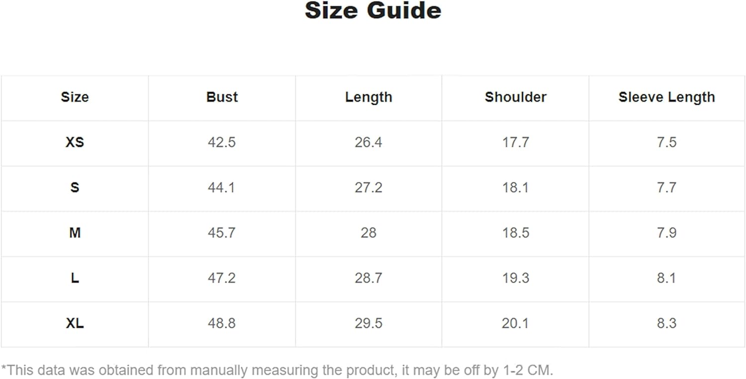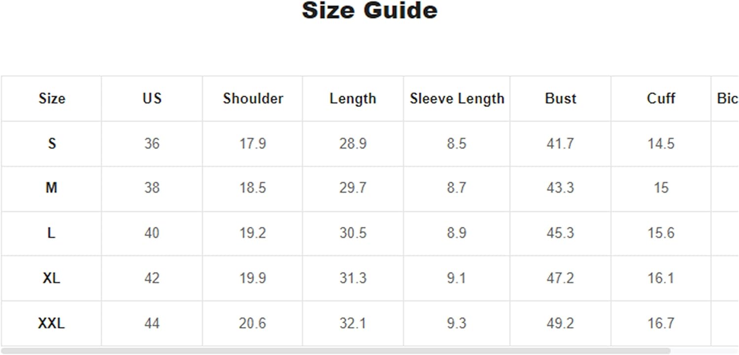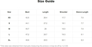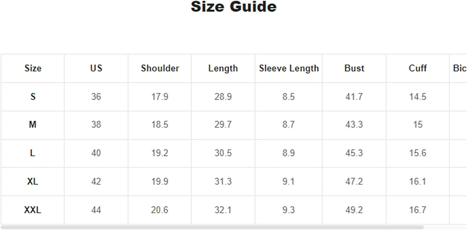 Small: Shoulder: 17.7", Bust: 44.1", Length: 28", Sleeve Length: 7.7",