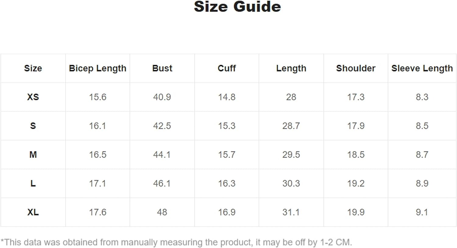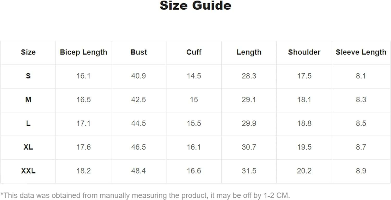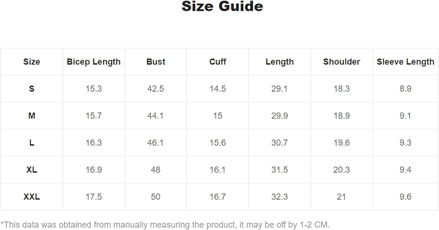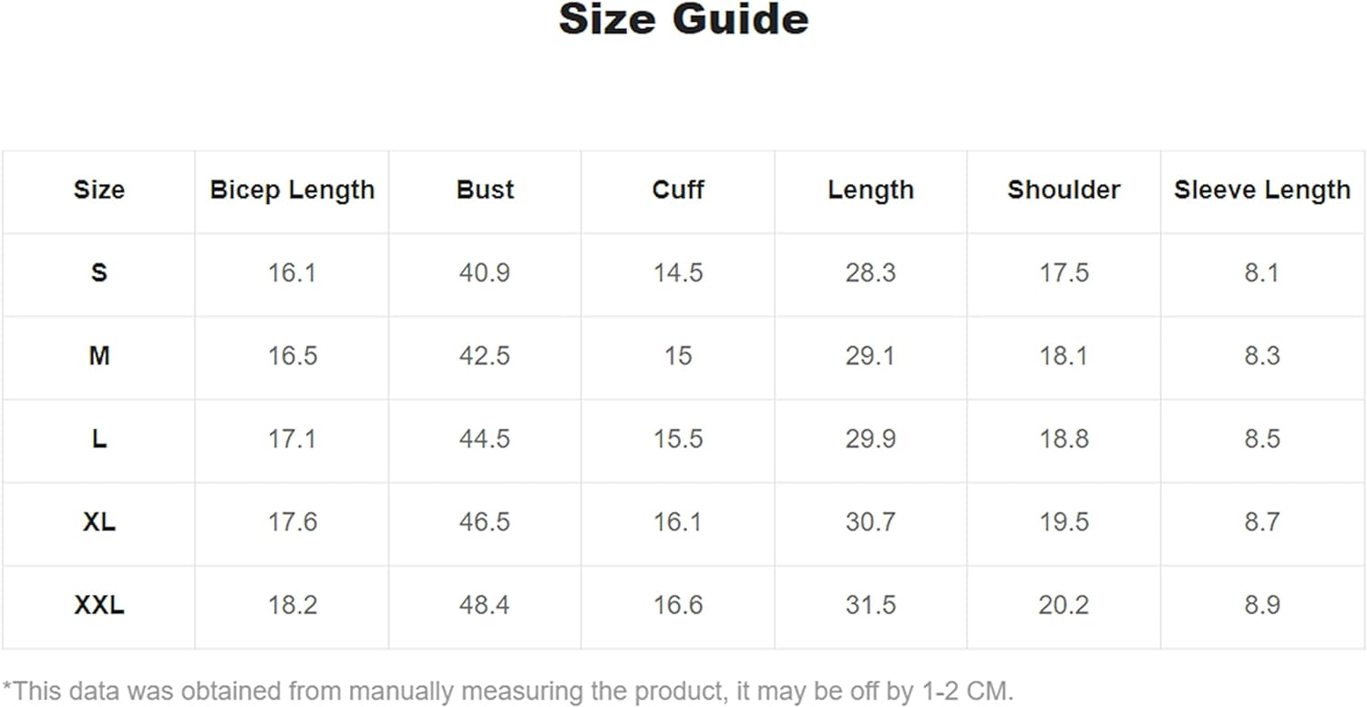 Small: Shoulder: 17.7", Bust: 44.1", Length: 28", Sleeve Length: 7.7",