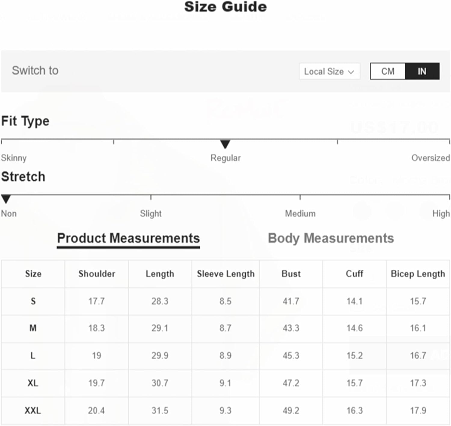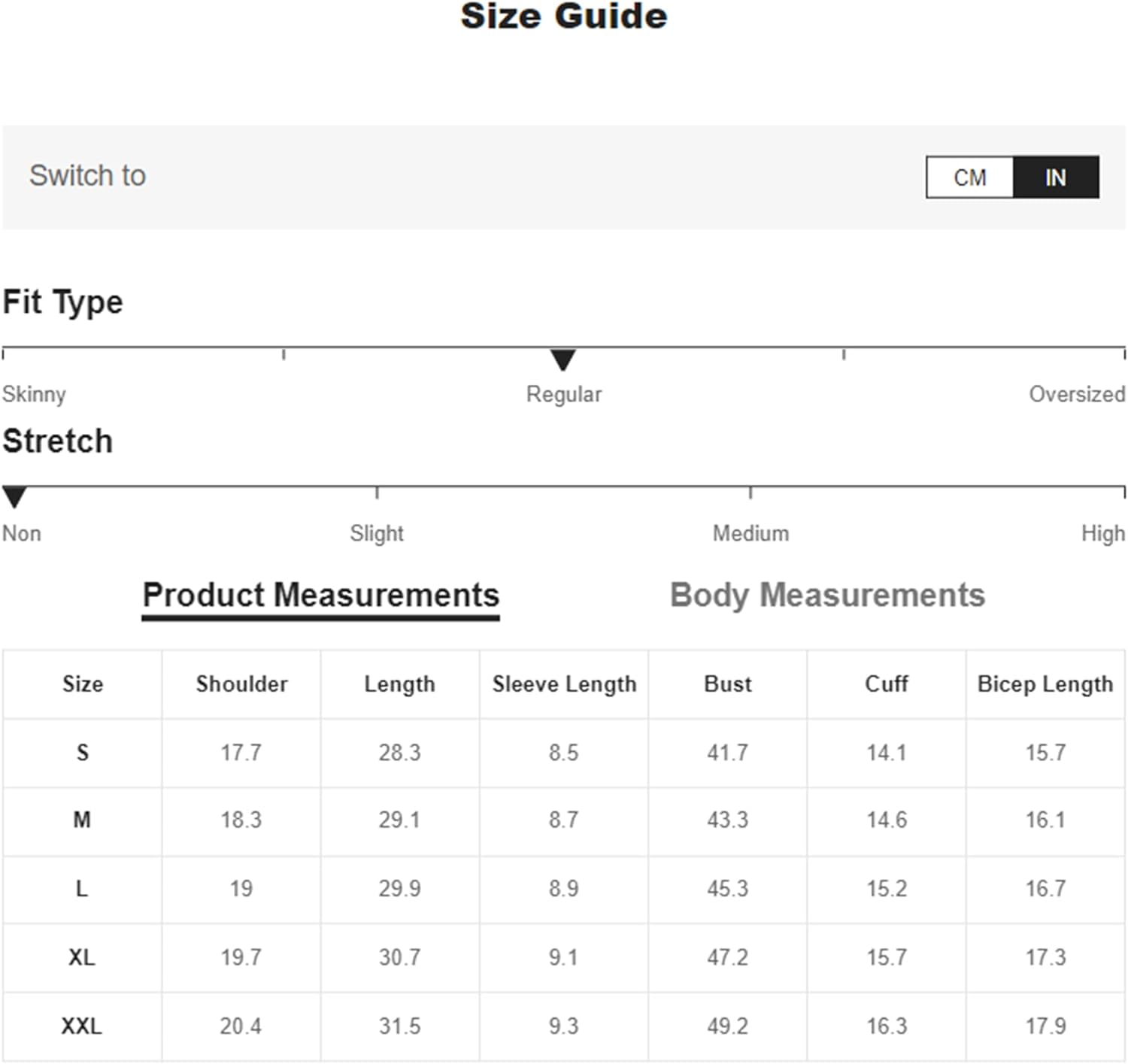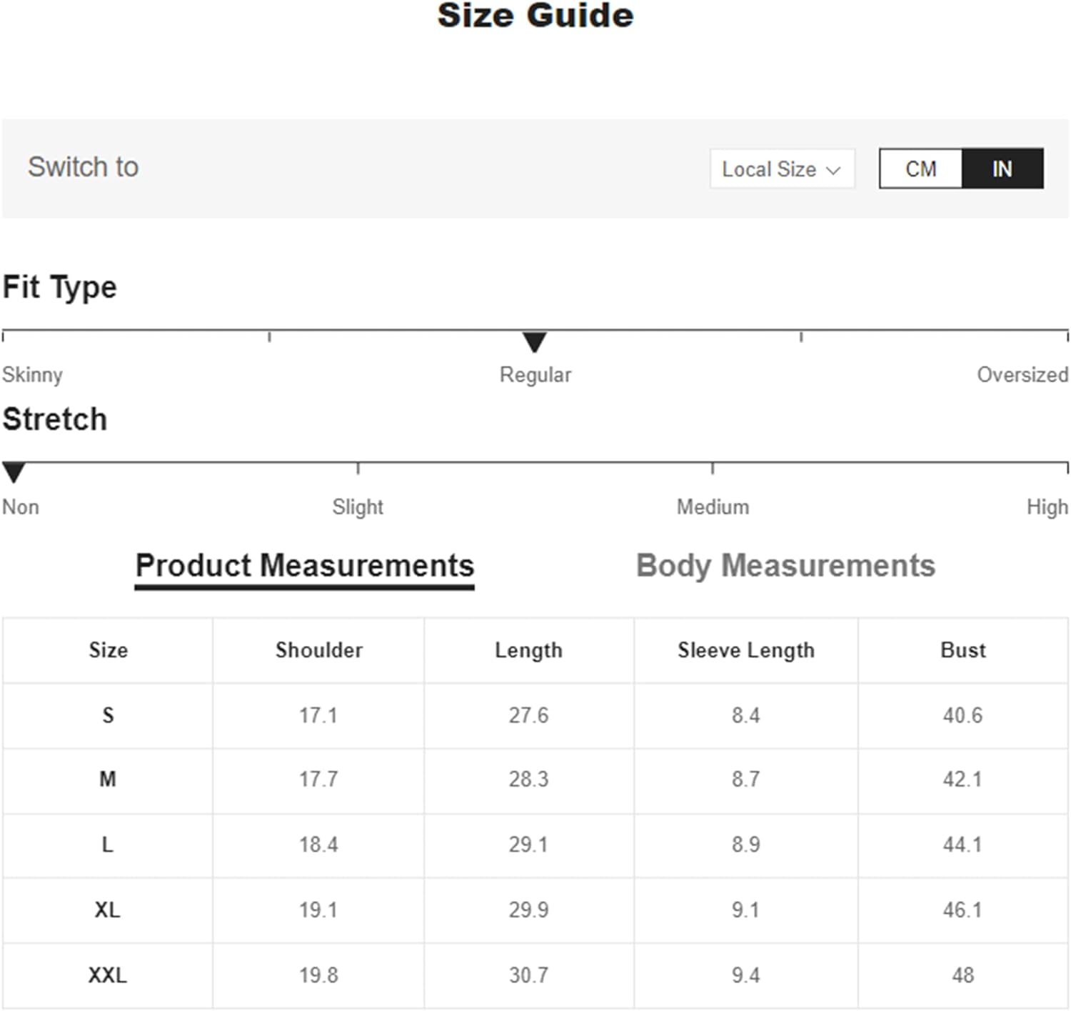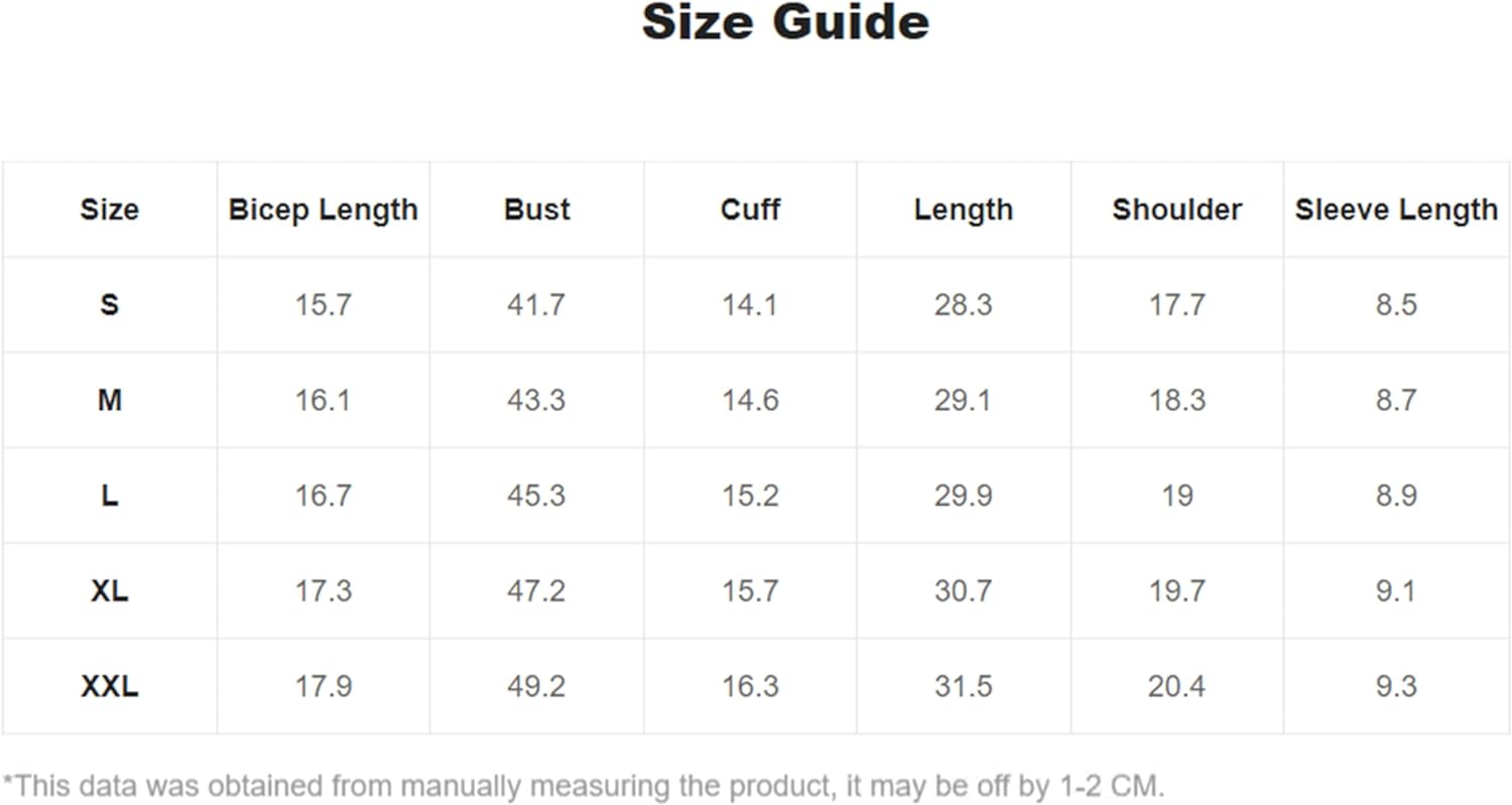 Small: Shoulder: 17.7", Bust: 44.1", Length: 28", Sleeve Length: 7.7",