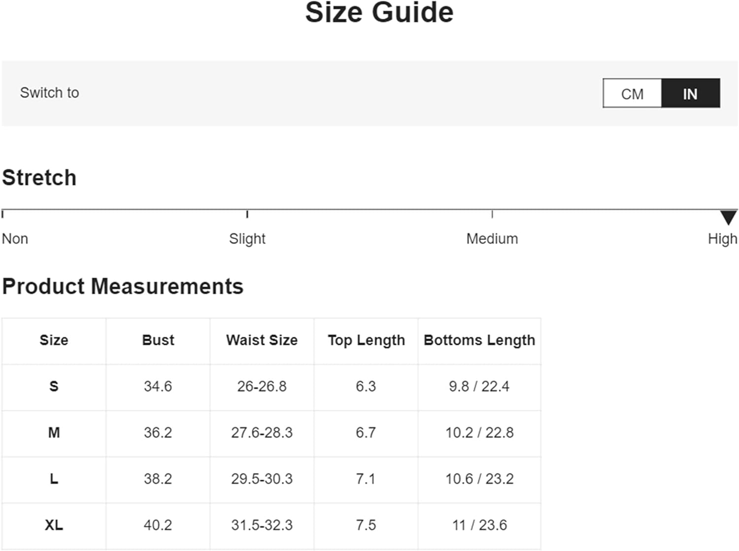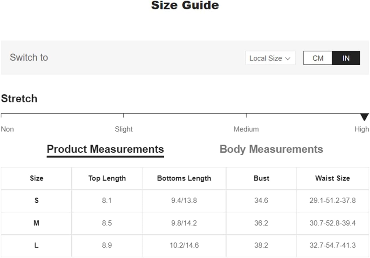 Small: Waist Size: 26.8-26.8-37", Top Length: 7.9", Bottoms Length: 19.7", Underbust: 26-33.1",