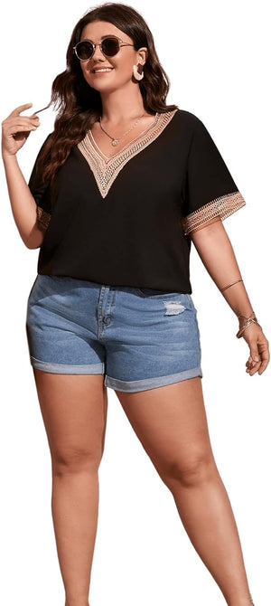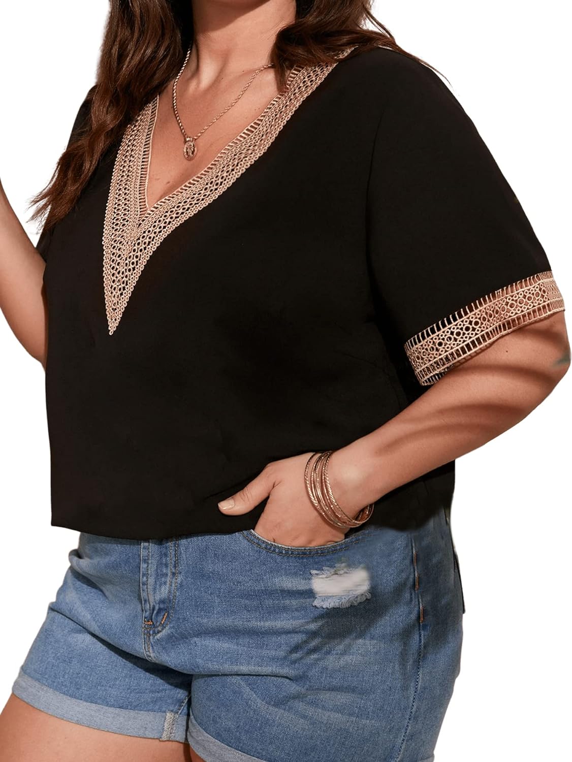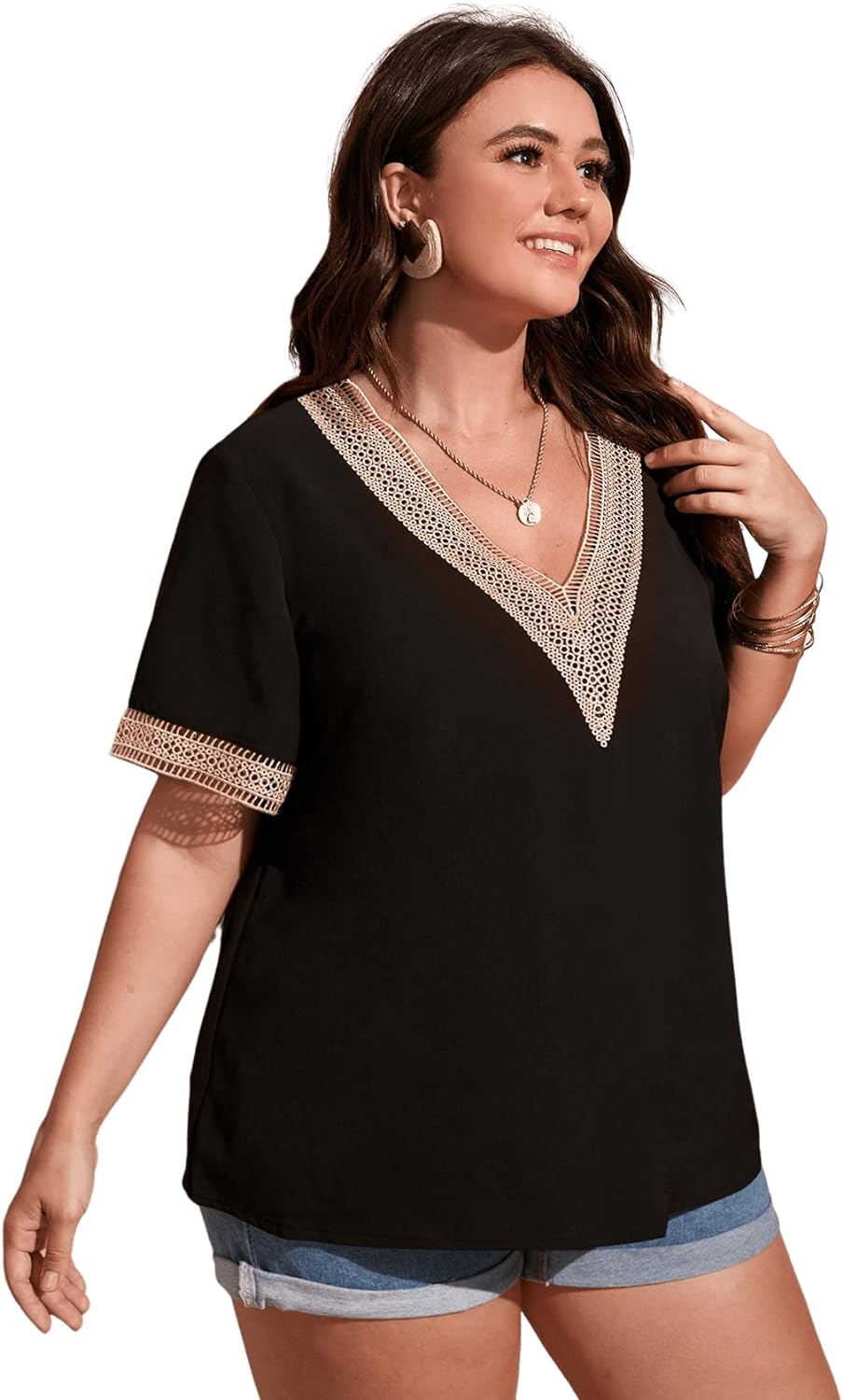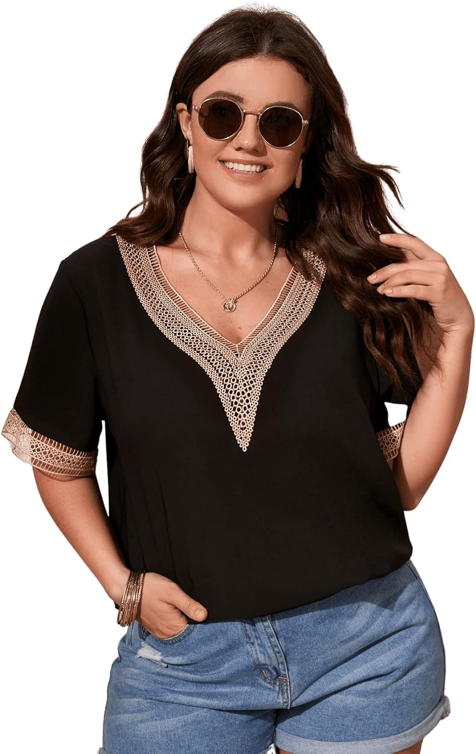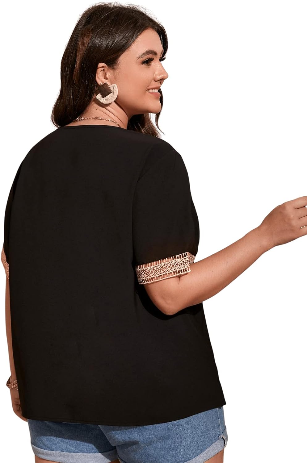 SOLY HUX Women's Plus Size Lace Trim V Neck Short Sleeve Casual Work Blouse Tops