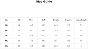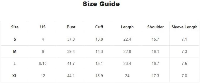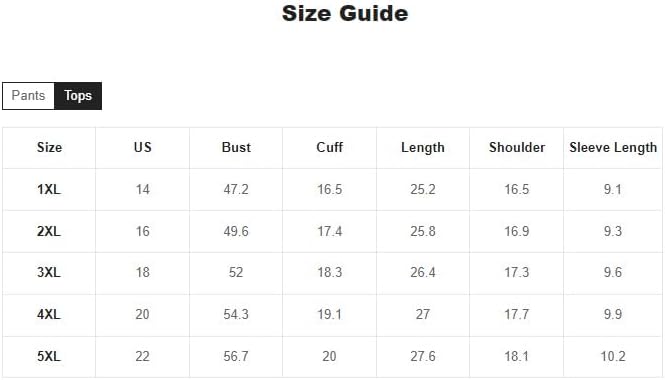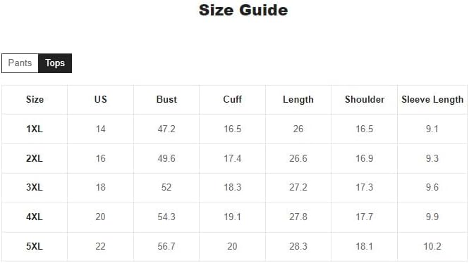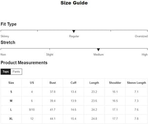 Large: Shoulder: 16.3", Sleeve Length: 7.5", Top Length: 23.4", Shorts Length: 12.2", Bust: 42.5", Waist Size: 27.6", Hip Size: 45.7", Thigh: 27.3", Cuff: 16.2"