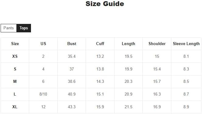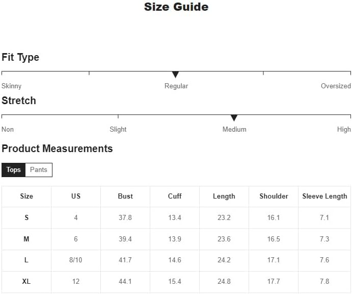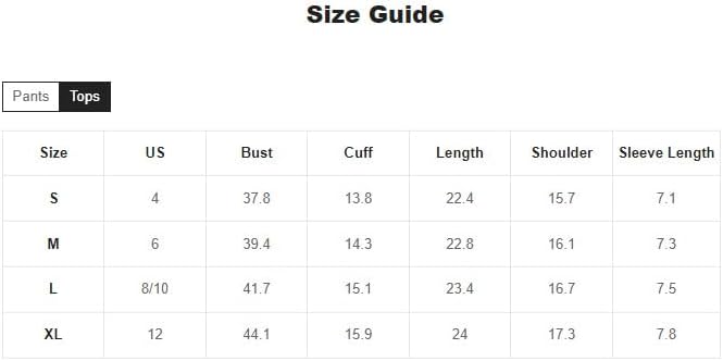 Medium: Shoulder: 15.7", Sleeve Length: 7.3", Top Length: 22.8", Shorts Length: 11.7", Bust: 40.2", Waist Size: 25.2", Hip Size: 43.3", Thigh: 26.1", Cuff: 15.4",