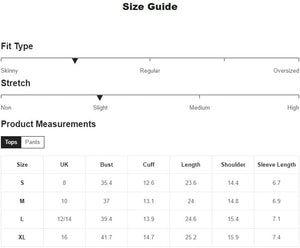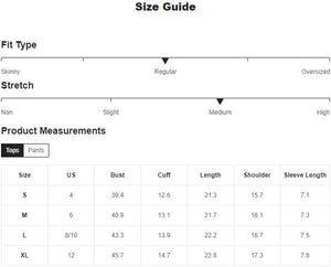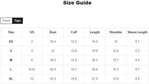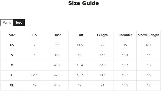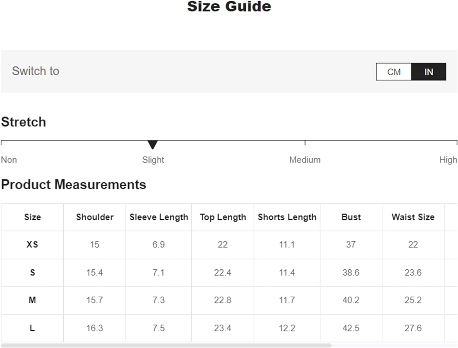 X-Small: Shoulder: 15", Sleeve Length: 6.9", Top Length: 22", Shorts Length: 11.1", Bust: 37", Waist Size: 22", Hip Size: 40.2", Thigh: 24.3", Cuff: 14.5",