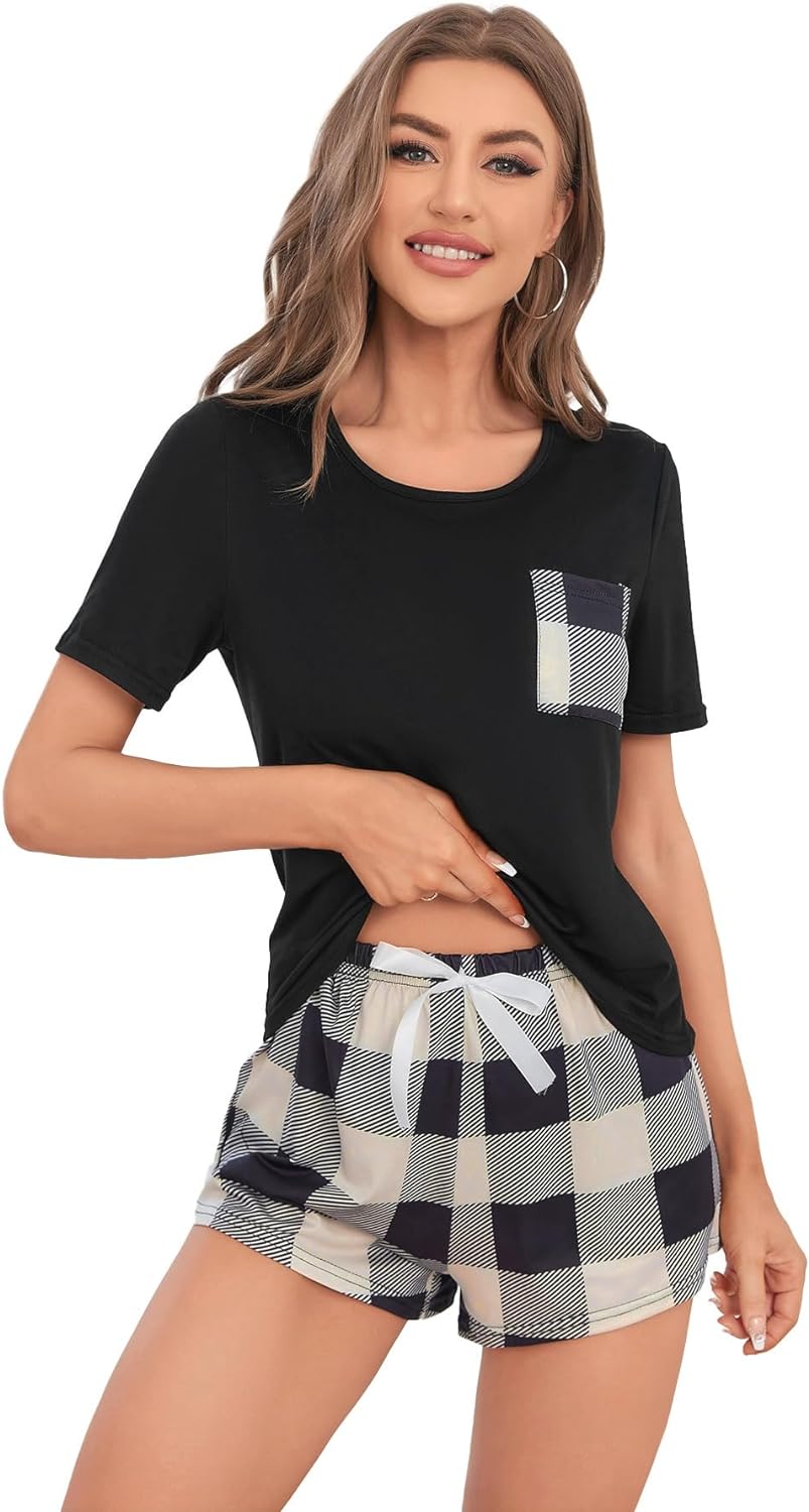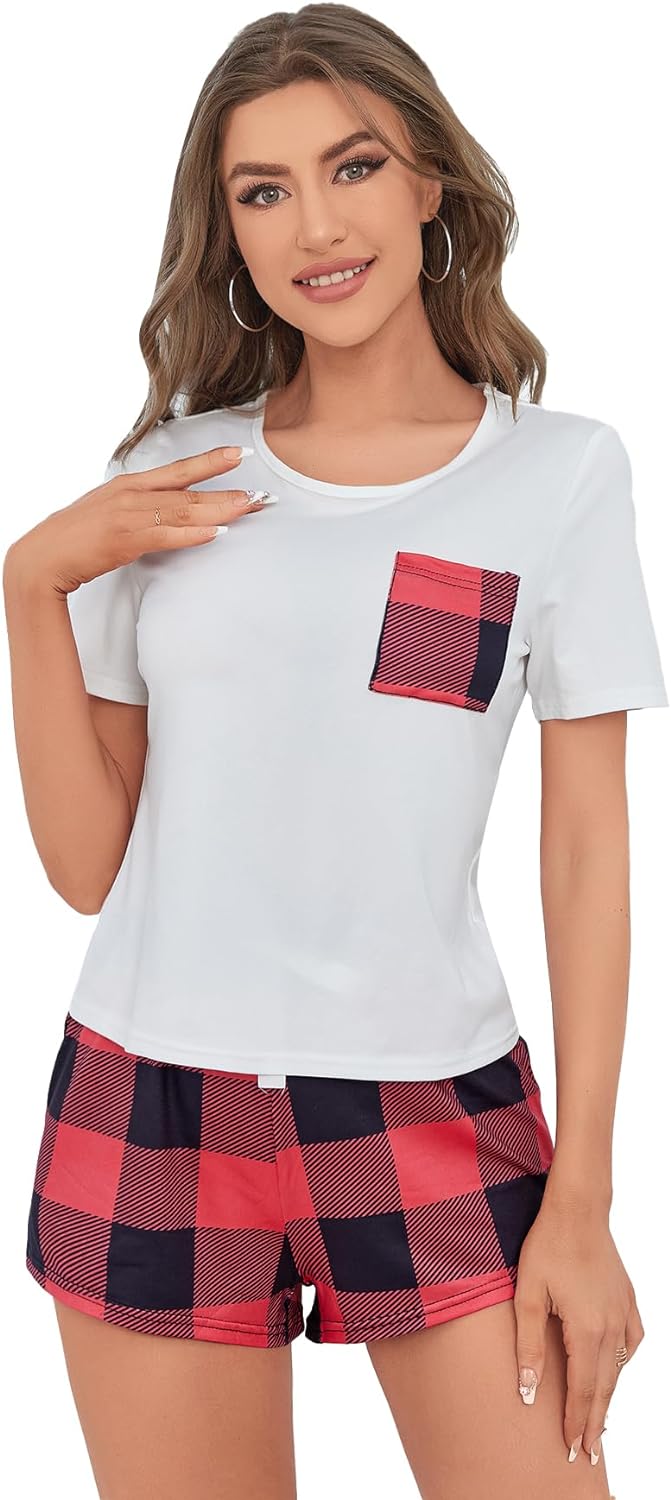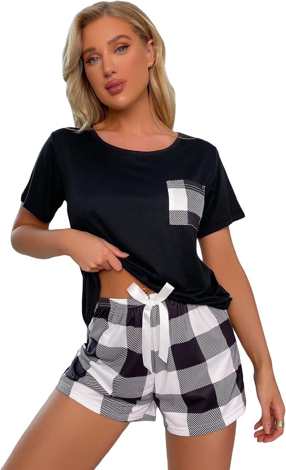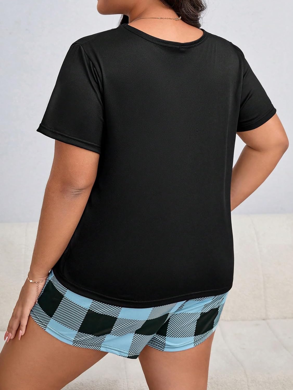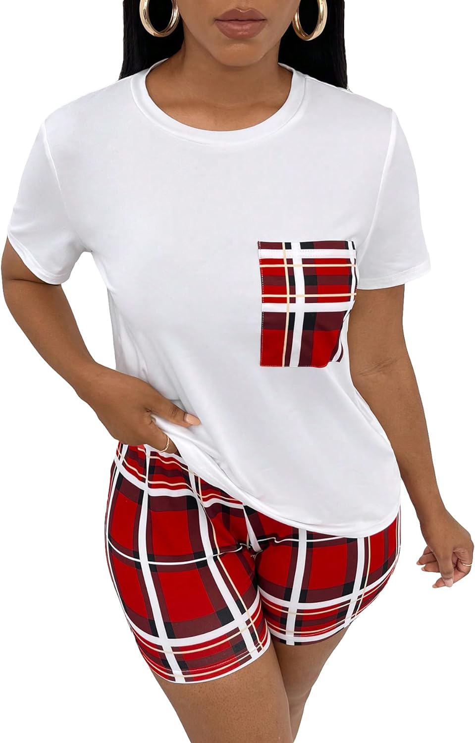 SOLY HUX Women's Short Sleeve Tee Top and Plaid Shorts Lounge Pajama Set Sleepwear