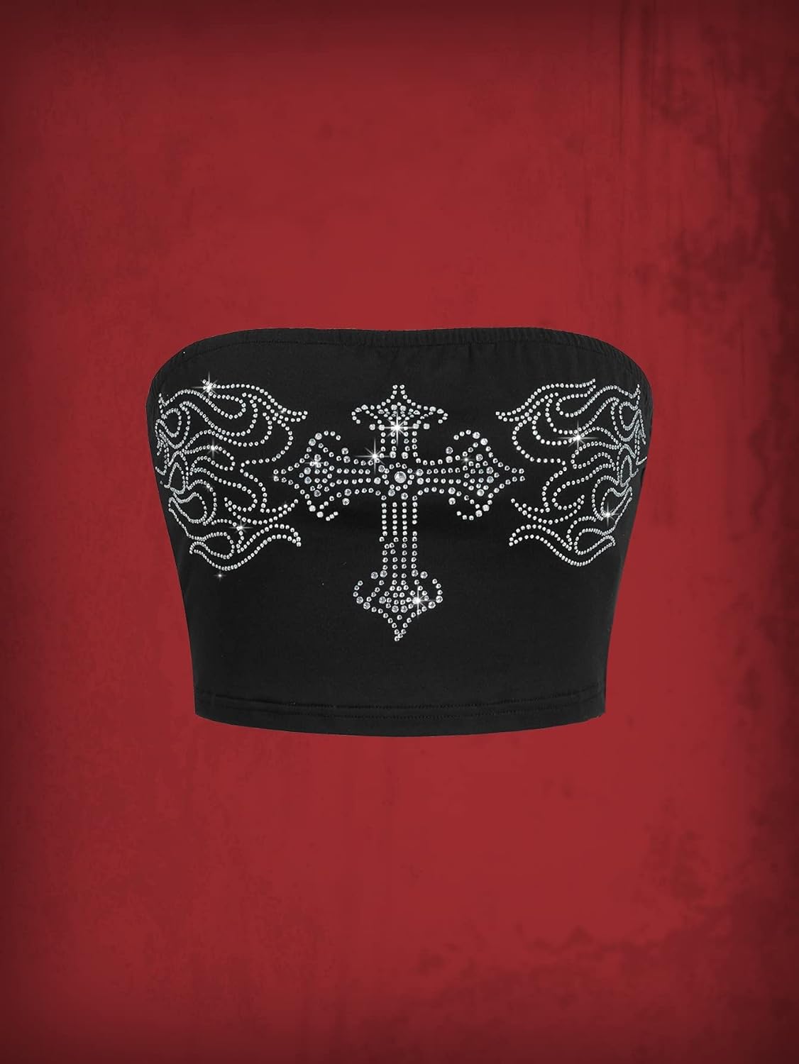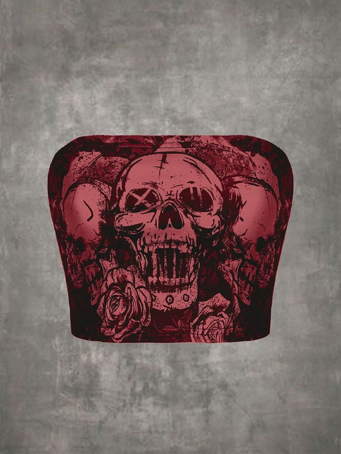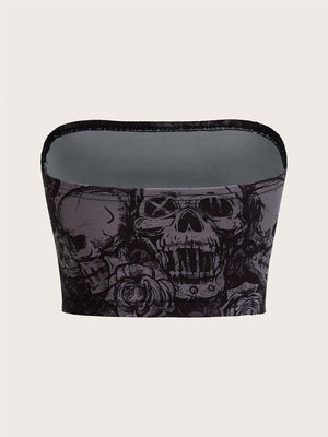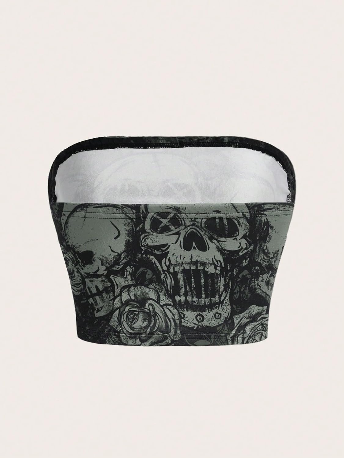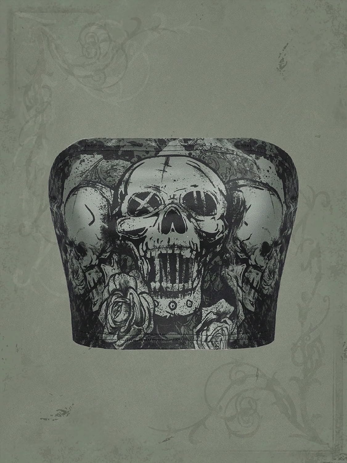 SOLY HUX Women's Skull Floral Print Tube Crop Top Sleeveless Strapless Bandeau Y2K Tops