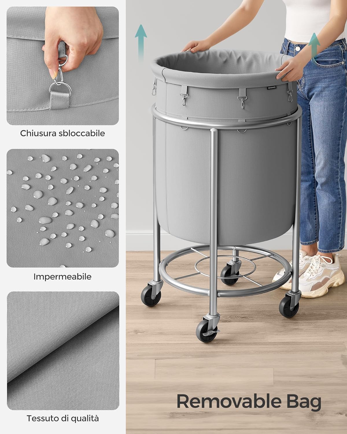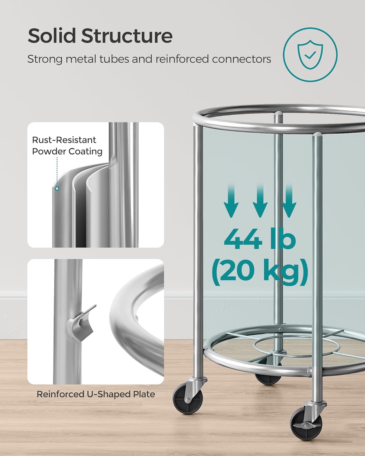 SONGMICS Laundry Basket with Wheels, Rolling Laundry Hamper, 29 Gal., Round Laundry Cart with Steel Frame and Removable Bag, 4 Casters and 2 Brakes, Gray and Silver URLS002G01