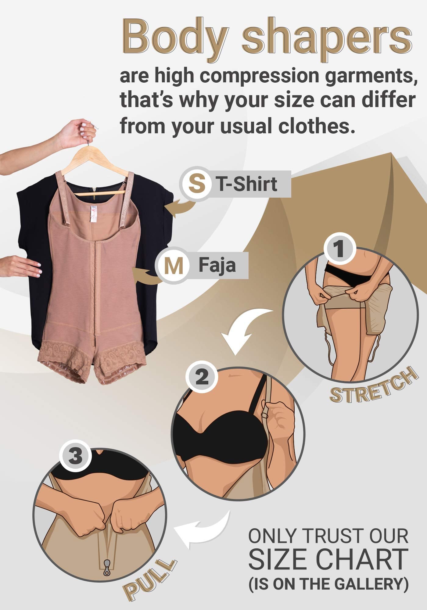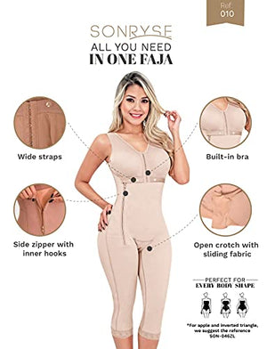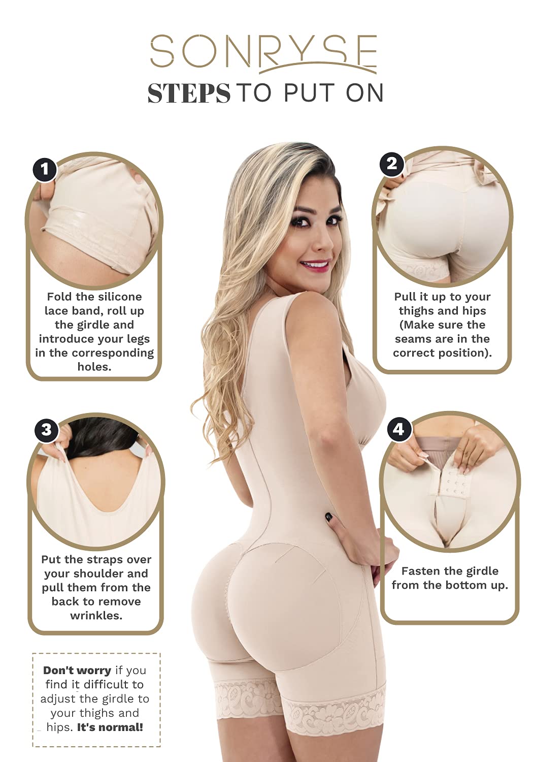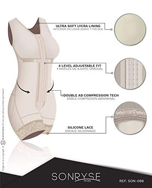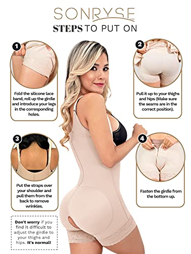 CHECK SIZE CHART BEFORE THE PURCHASE: Fajas’ sizes are different from usual clothes, always measure your waist and hips to find your size. Hips measures for BEGINNERS: XS (35-37"), S (37.1-39.5"), M (39.6-41.8"), L (41.9-44"), XL (44.1-46.5"), 2XL (46.6-48.9"), 3XL (49-51.2"), 4XL (51.3-53.5") If you are a regular faja user, find your size in the column EXPERT. It will seem smaller than it really is, STRETCH IT! We have great videos with NOT SO OBVIOUS TIPS (visit our Store to find them) 👗 TRANSFORM YOUR BODY: Get a total makeover with this high compression post surgery faja. In 5 minutes give your back support and feel comfortable with this csection postpartum girdle. Our stage 2 faja post surgery bbl & lipo is ideal as a postoperative girdle, postpartum shapewear, faja for tummy tuck and lipo, and liposuction compression garments. The SONRYSE colombian girdles for slimming will contour your silhouette while keeps your skin from irritation due to its superior shaping tech. 👗 BETTER THAN NO OTHER: Being light years away from any other brand of body shaper for women, our compression garment comes with double adjustment and superior fabrics. This shapewear full body faja provides an excellent combination of durability and comfort. When it comes to fajas girdles for women, our tummy tuck compression garment for women outlasts every shapewear. When you buy SONRYSE, you're not buying another Colombian fajas for women. Get 100% Colombian export quality. 👗 ULTIMATE CARE: Our post surgery compression garment with invisible seams, a comfy Lycra lining, and Powernet exterior hugs your body as a second skin. It adjusts perfectly to your body. Our faja post bbl stage 2 goes beyond a regular csection postpartum and post op compression garment for women since it features SKINVITACARE, a component with properties for a gentle skin touch while shaping. We know how valuable comfort is in our liposuction compression garments post surgery. 👗 NO HAY FAJA COLOMBIANA COMO ÉSTA: Consigue una figura soñada con estas fajas colombianas reductoras y moldeadoras. Delinea tus curvas gracias a estas poderosas fajas levanta gluteos, que ofrecen más compresión y beneficios. Utilízala como fajas reductoras y moldeadoras para mujeres, faja colombiana post surgery, fajas colombianas postparto, fajas moldeadora para mujer de uso diario.