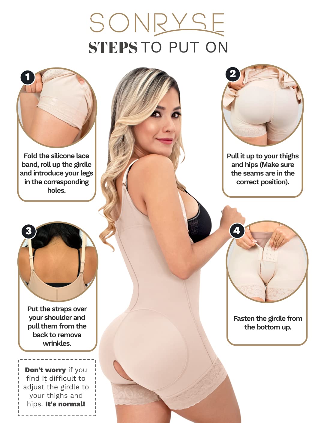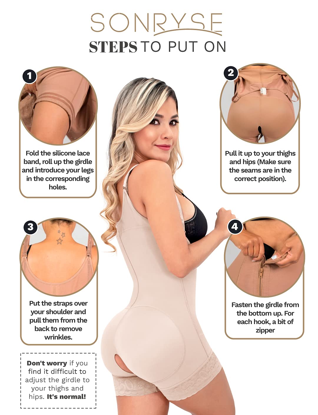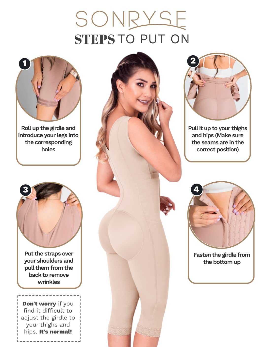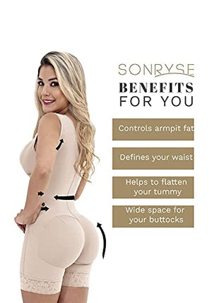 CHECK SIZE CHART BEFORE THE PURCHASE: Fajas’ sizes are different from usual clothes, always measure your waist and hips to find your size. Hips measures for BEGINNERS: XS (35-37"), S (37.1-39.5"), M (39.6-41.8"), L (41.9-44"), XL (44.1-46.5"), 2XL (46.6-48.9"), 3XL (49-51.2"), 4XL (51.3-53.5") If you are a regular faja user, find your size in the column EXPERT. It will seem smaller than it really is, STRETCH IT! We have great videos with NOT SO OBVIOUS TIPS (visit our Store to find them) 👗 TRANSFORM YOUR BODY IN 5 MINUTES: A total makeover instantly with this girdle bbl stage 1 faja garment after surgery. In 5 minutes give your back support and be comfortable with the greatest post surgery compression shapewear garment in the market. Our Sonryse 086 body shaper is also great as: liposuction compression garments, postoperative or postpartum girdle, BBL faja garment after surgery, csection postpartum girdle, lipo faja or post tummy tuck faja stage 1. 👗 BETTER THAN NO OTHER BBL FAJA: Being light years away from any other brand of girdle colombian shapewear for women, our faja colombiana postpartum comes with double ab adjustment and superior fabrics. This colombian stage 1 and 2 fajas for women provides an excellent combination of durability and comfort. When it comes to a shapewear bodysuit, our fajas colombianas post surgery outlasts every body shaper for women. 👗 ULTIMATE CARE: Our butt lifter shapewear for women with invisible seams, a comfy Lycra lining, and Powernet exterior hugs your body as a second skin. It adjusts perfectly to your body. Our Colombian girdles for slimming faja goes beyond a regular faja post liposuction since it features SKINVITACARE, a component with properties for a gentle skin touch while shaping. We know how valuable comfort is in our womens shapewear bodysuit after liposuction or giving birth. 👗 NO HAY FAJA COLOMBIANA PARA MUJER COMO ÉSTA: Consigue una figura soñada con estas fajas colombianas reductoras y moldeadoras. Delinea tus curvas gracias a estas poderosas fajas colombianas levanta gluteos, que ofrecen más compresión y beneficios. Utilízala como fajas moldeadoras colombianas, faja postparto, fajas shapewear, faja levanta gluteos para mujer, fupa faja.