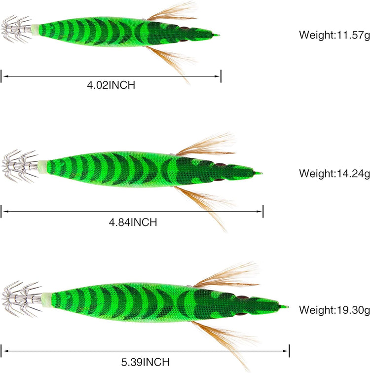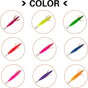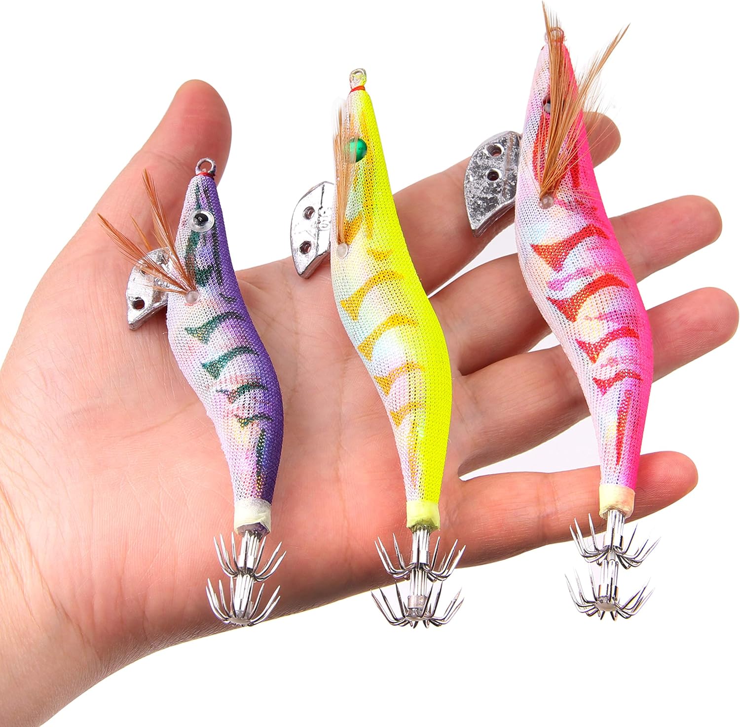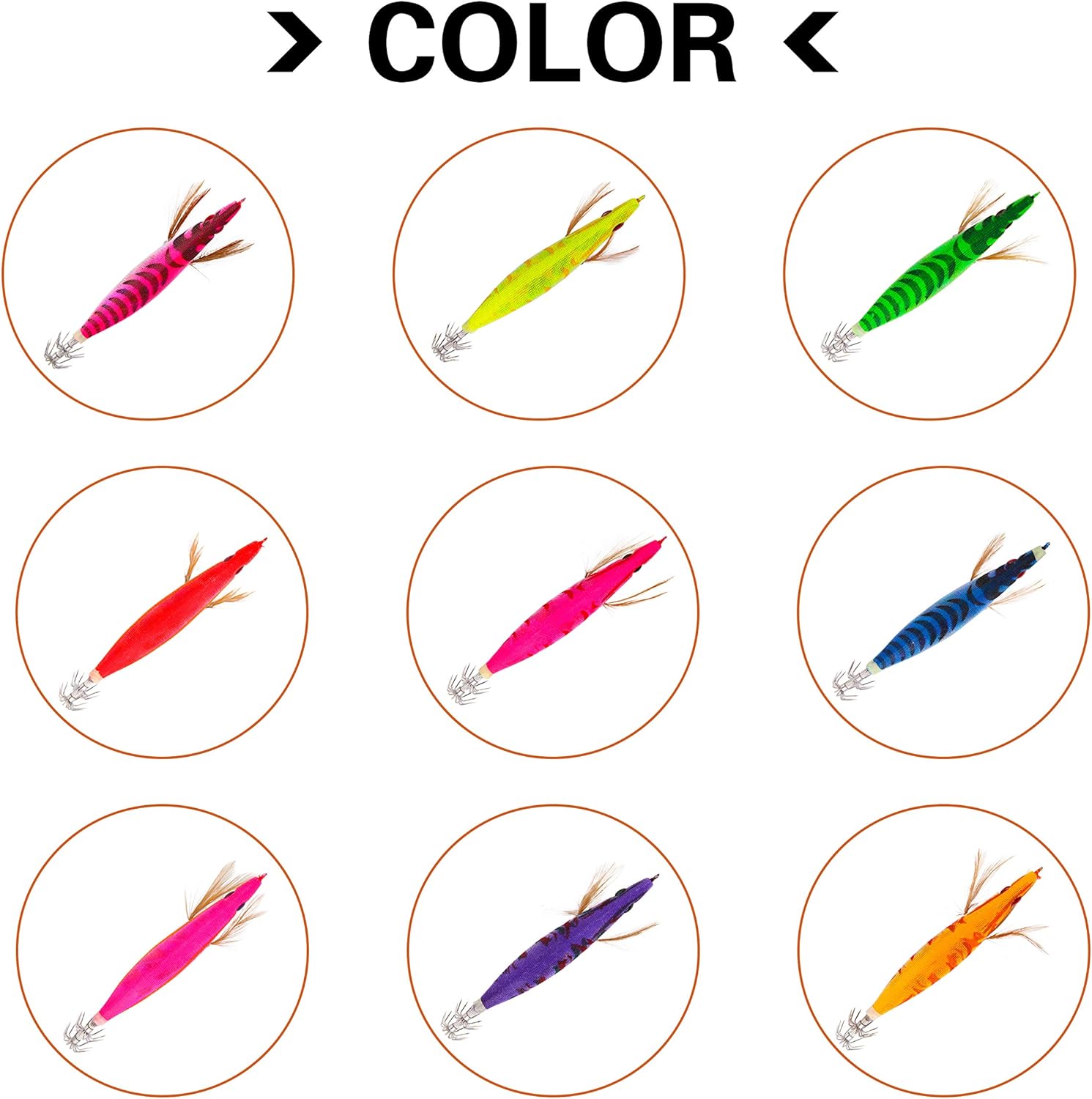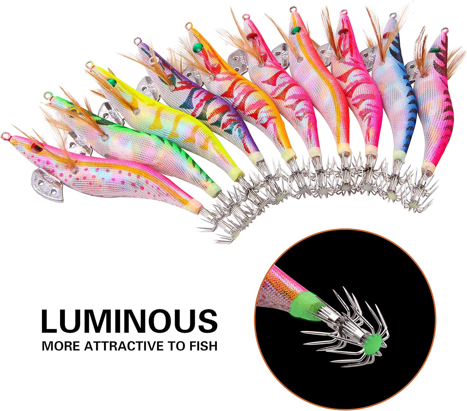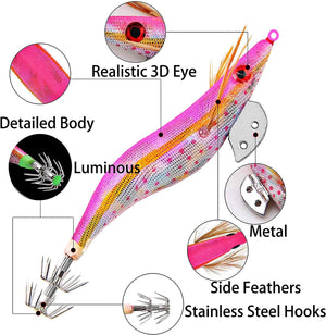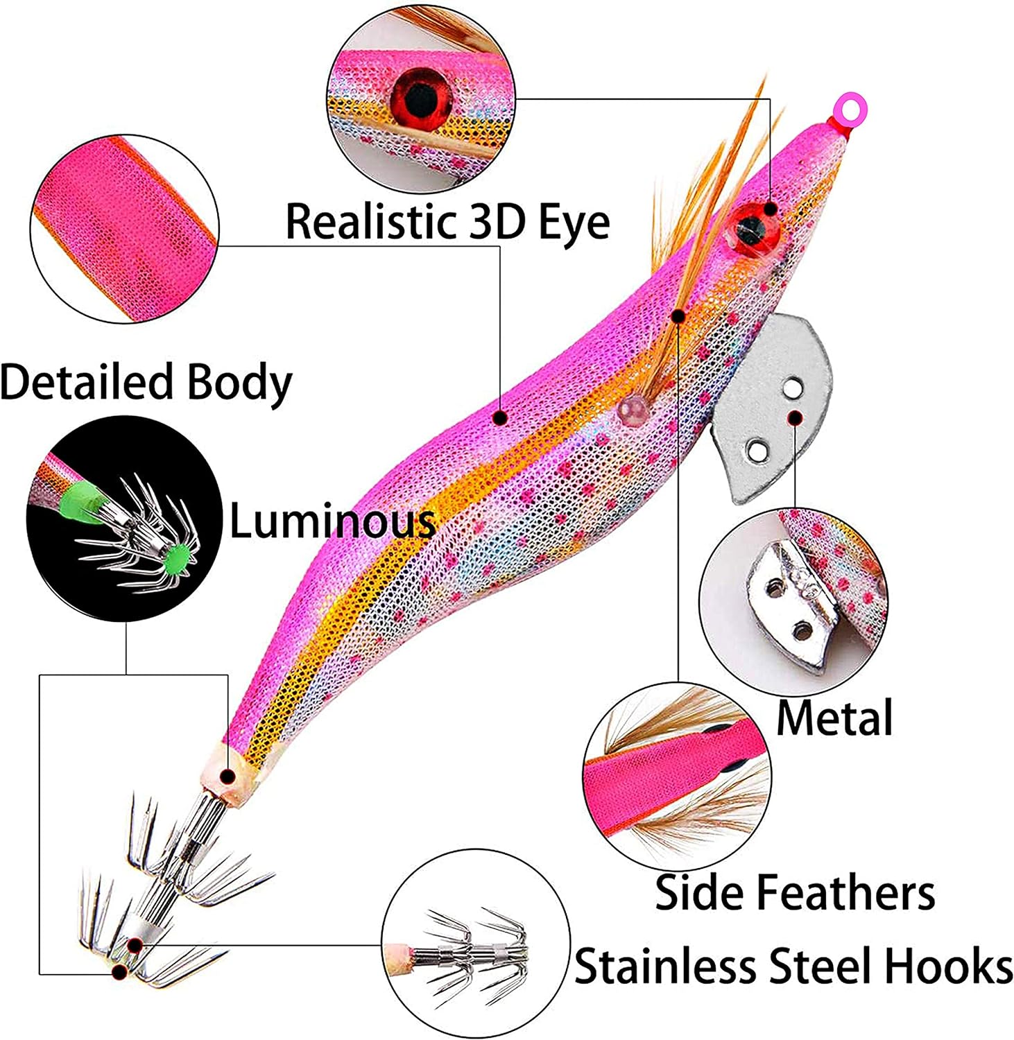 - 🎣【Lifelike And Attractive】Squid jig hard fishing lures with unique realistic 3D emulated eyes, luminous tail, various bright color, lifelike swimming action can attract big fishes. Stainless steel squid jig hooks, sharp and strong, dual-layer sharp hooks make it impossible for fish to escape when fighting big squids.