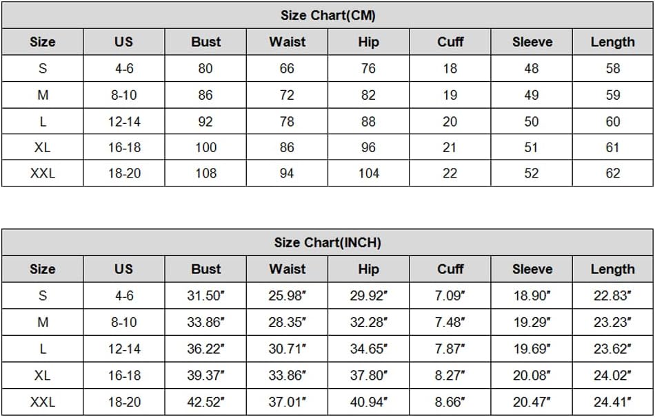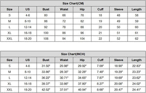 Size:XL: Bust: 37.8"-44.9", Waist:31.5"-39.4",Sleeve:18.9",Length:21.7"