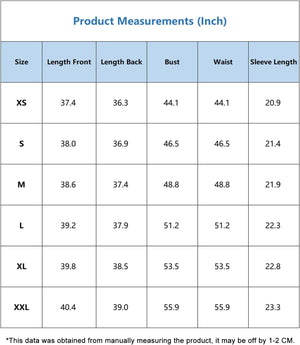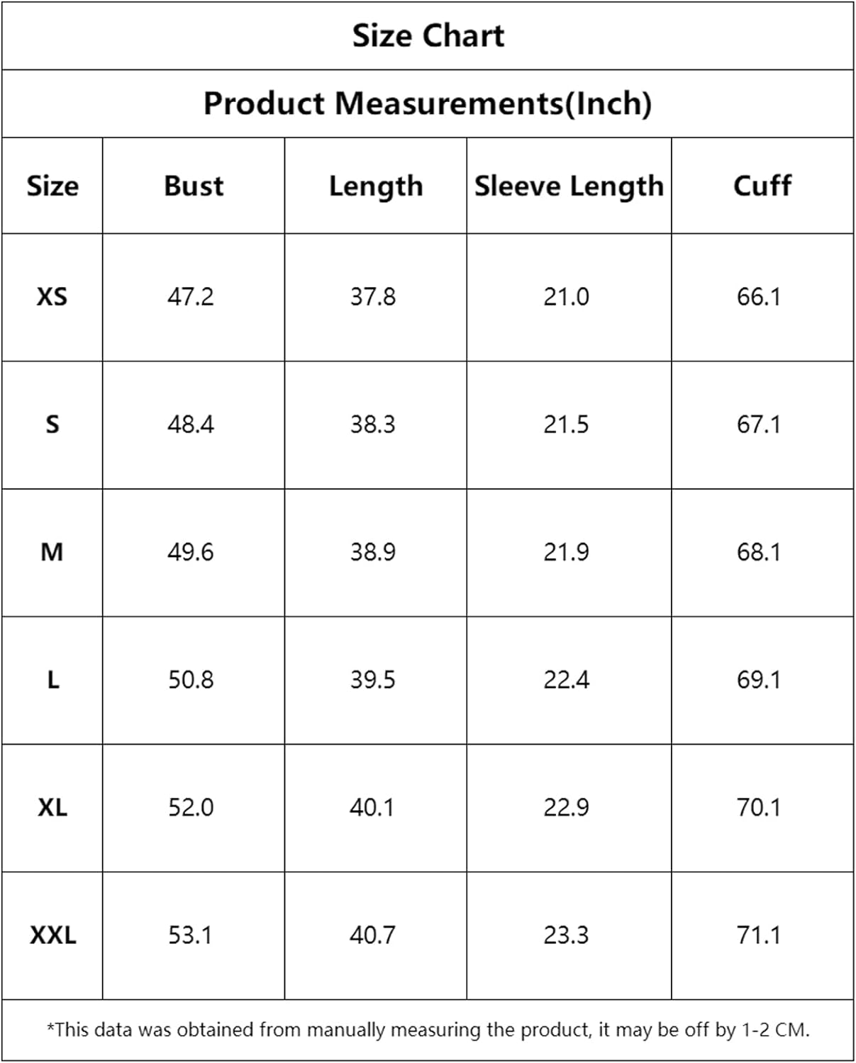 XL: Length: 34.3 inch, Sleeve Length: 19.7 inch, Bust: 50.4 inch