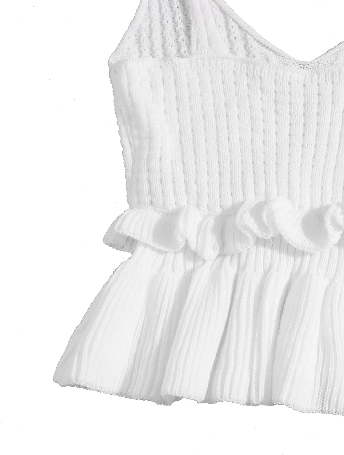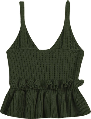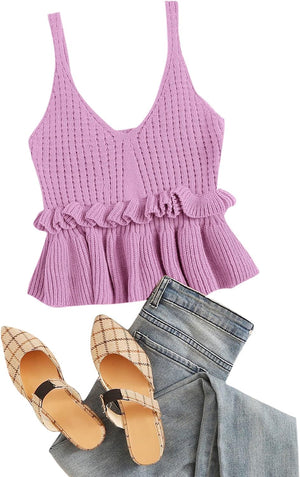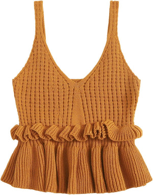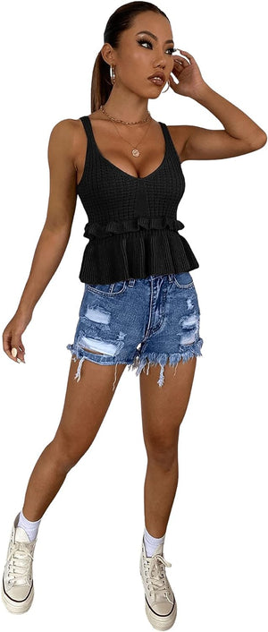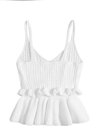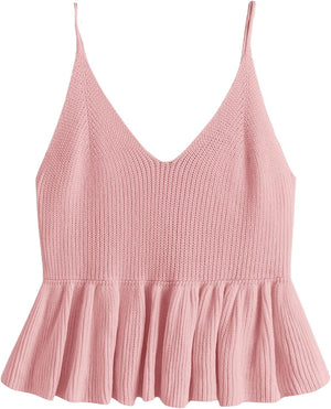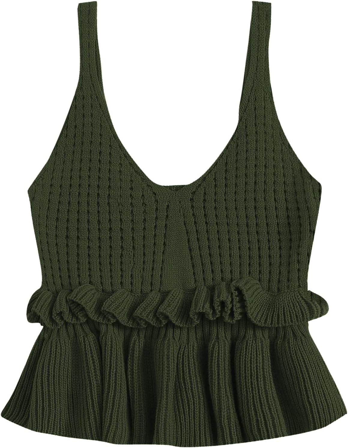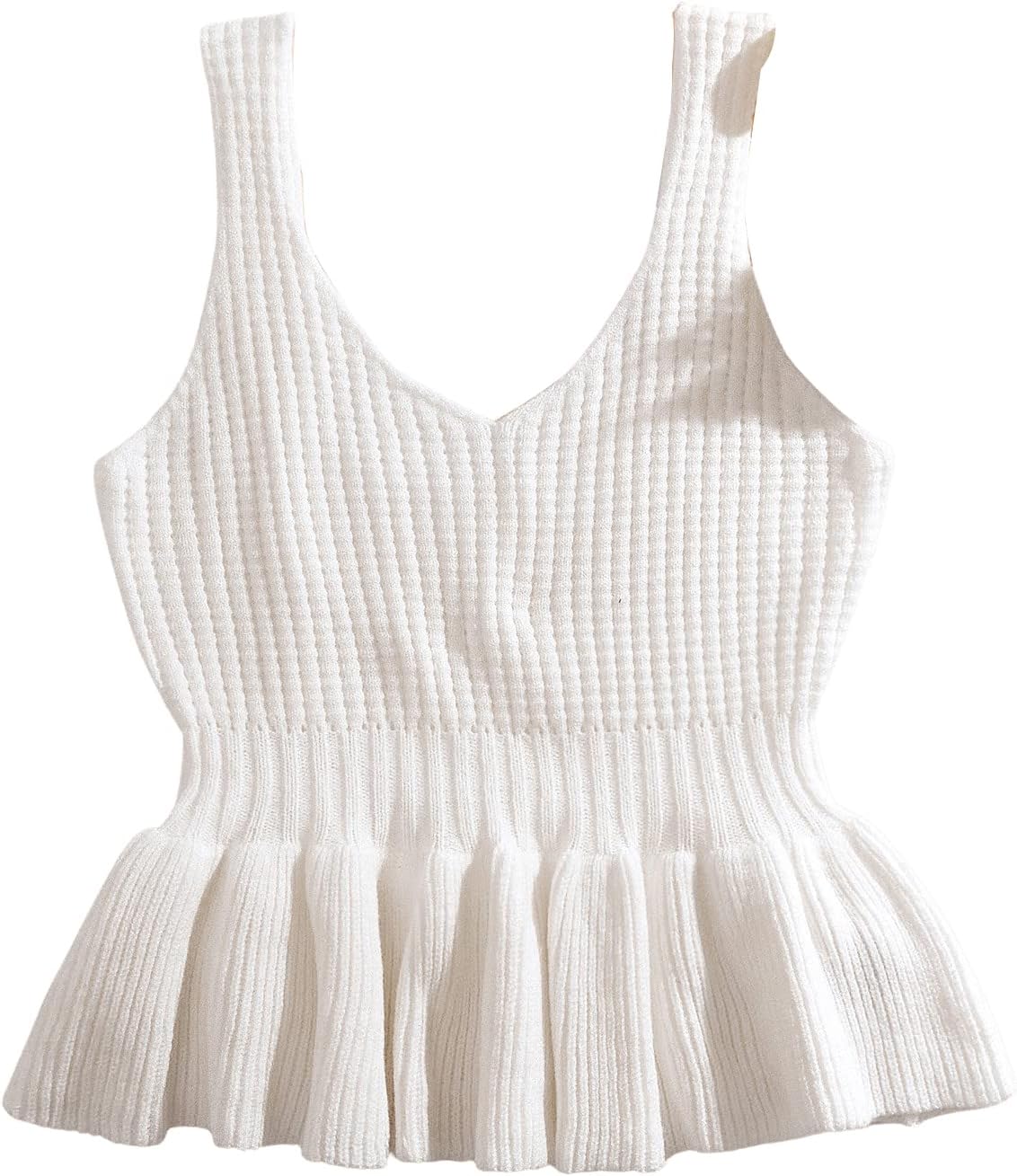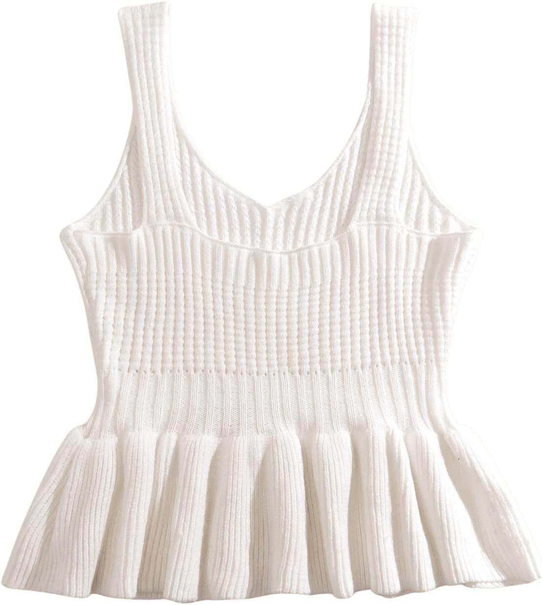 SweatyRocks Women's Casual Knit Top Sleeveless Ruffle Hem V Neck Peplum Crop Tank Top