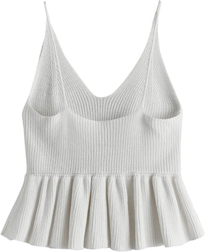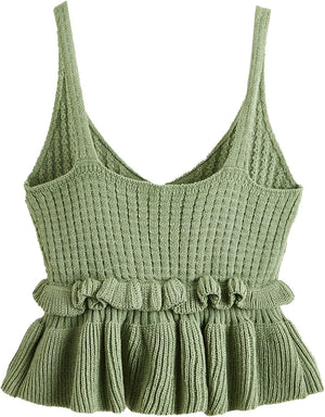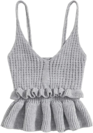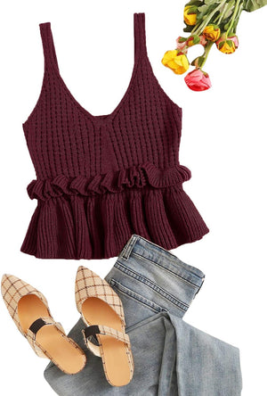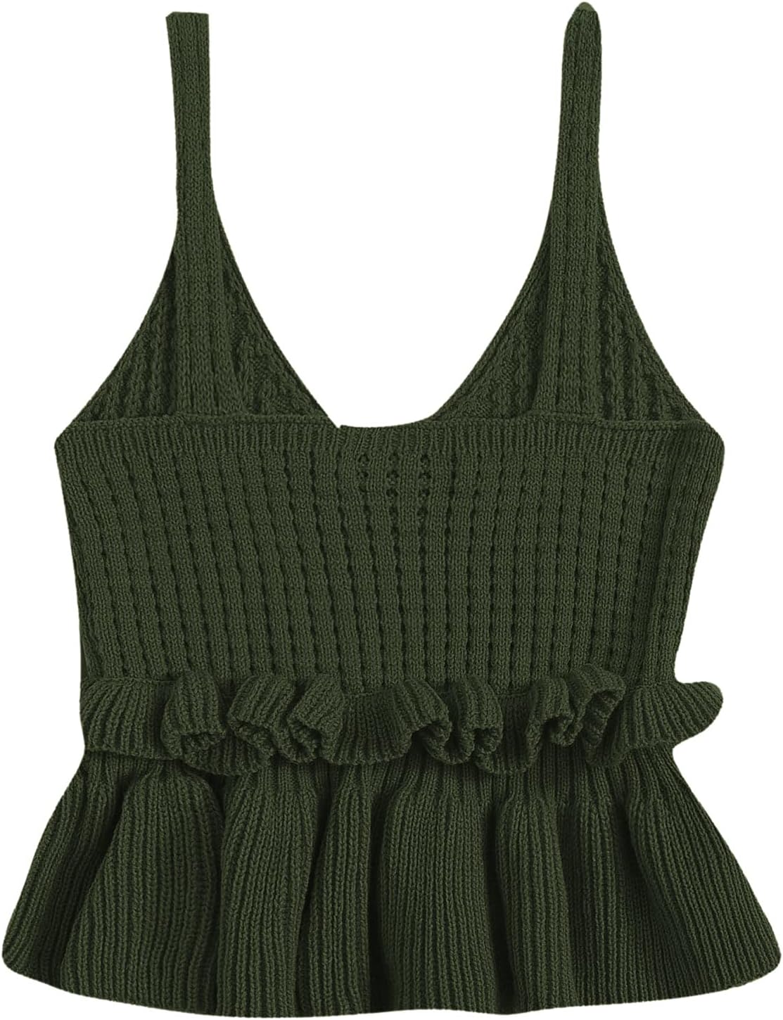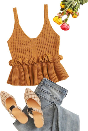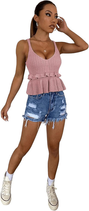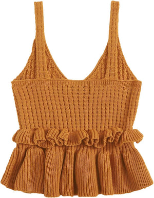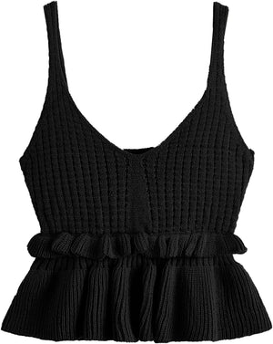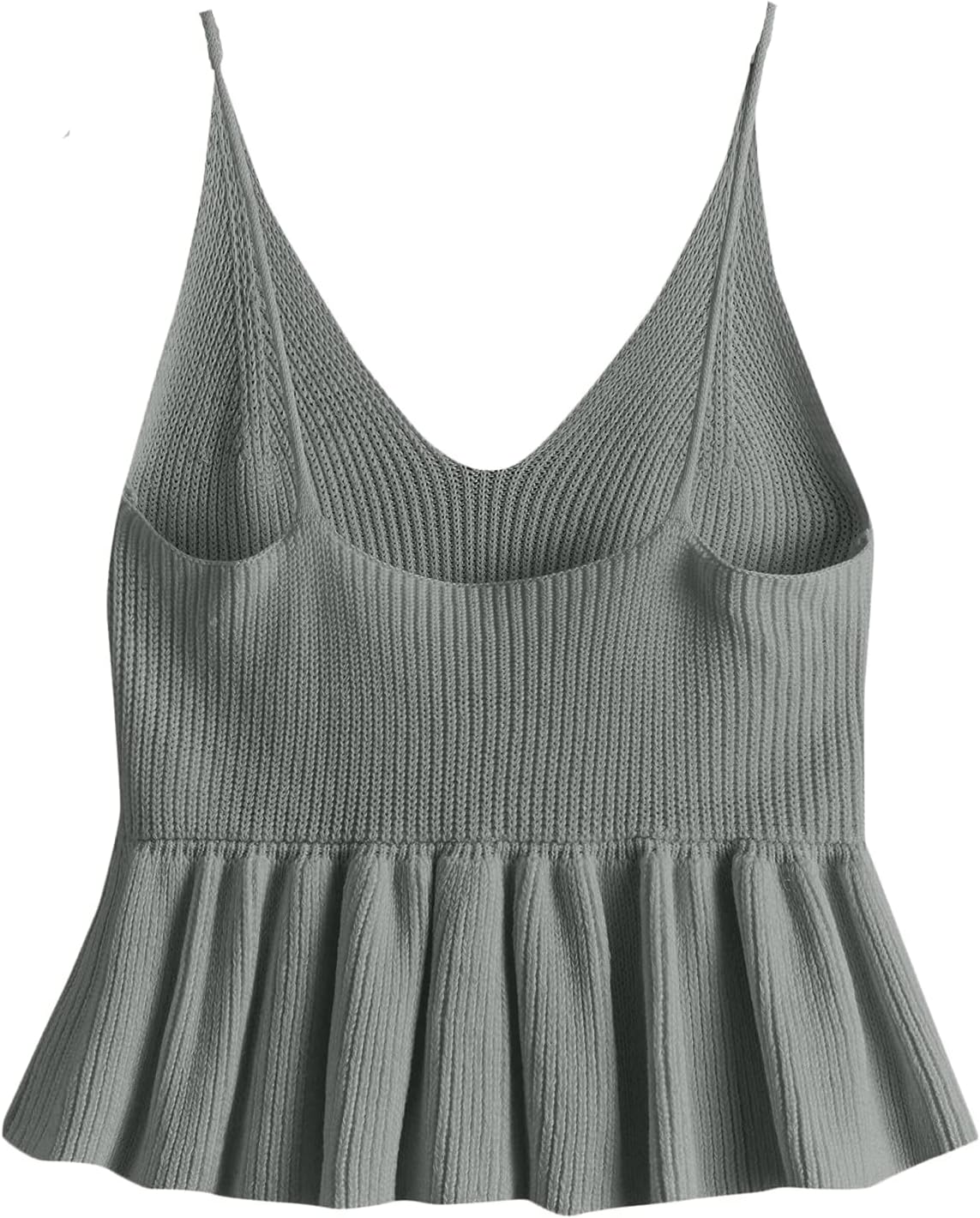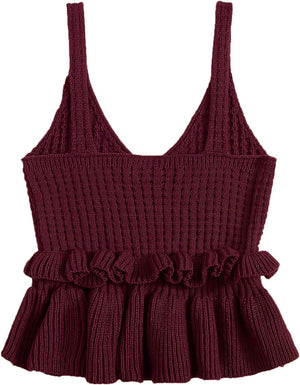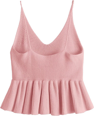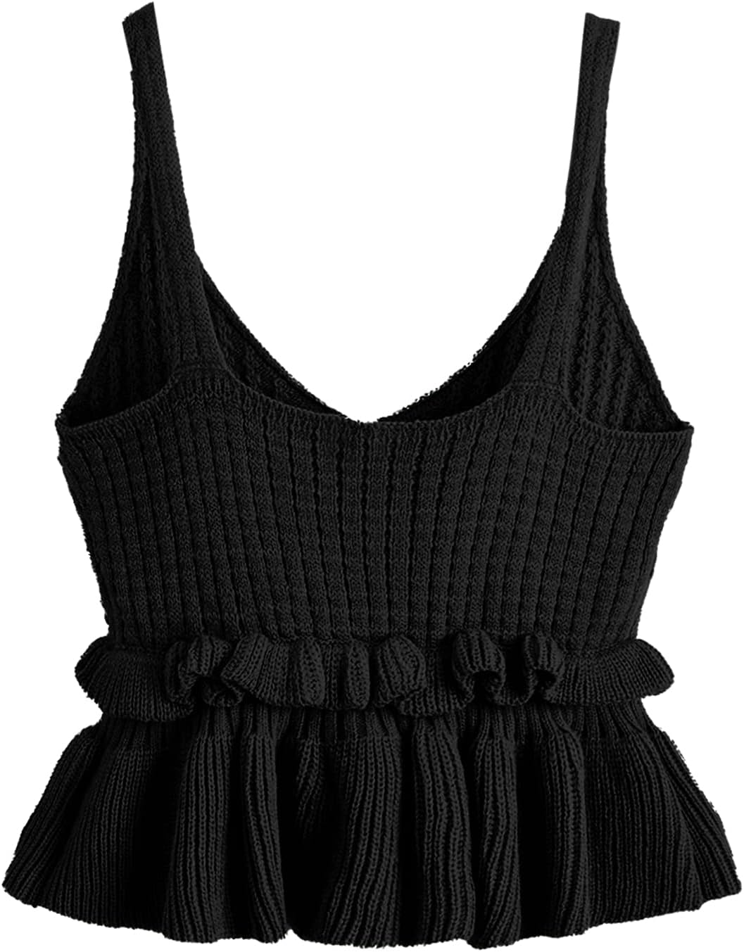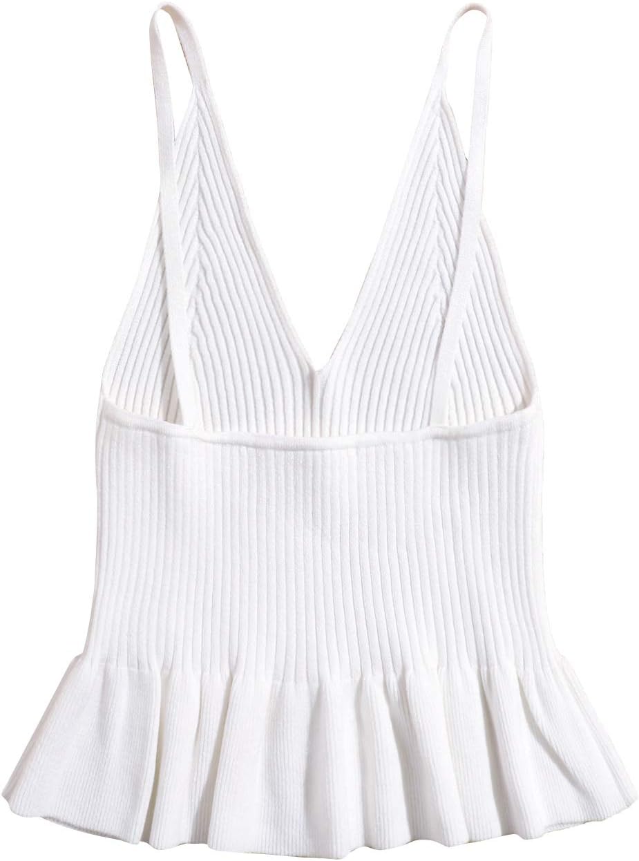 SweatyRocks Women's Casual Knit Top Sleeveless Ruffle Hem V Neck Peplum Crop Tank Top