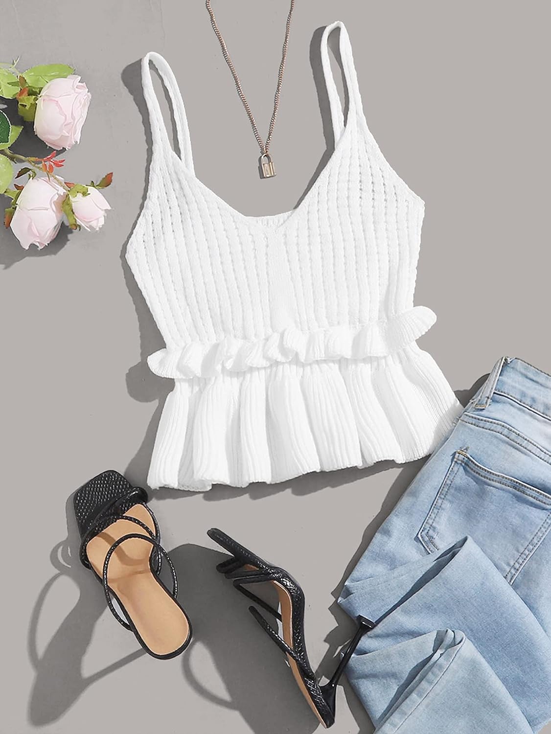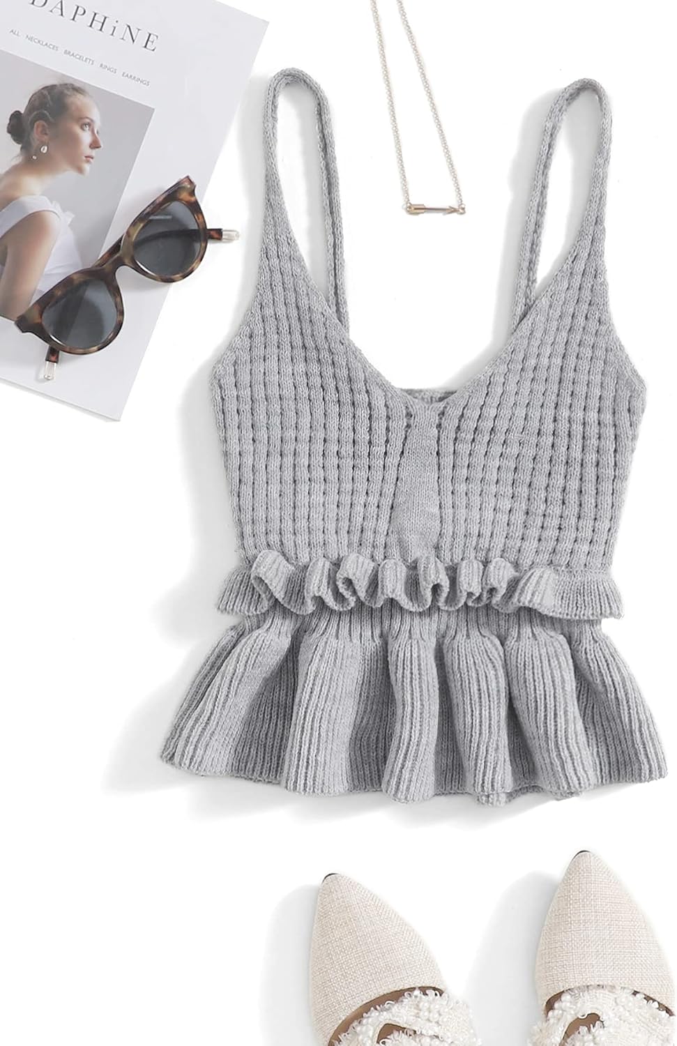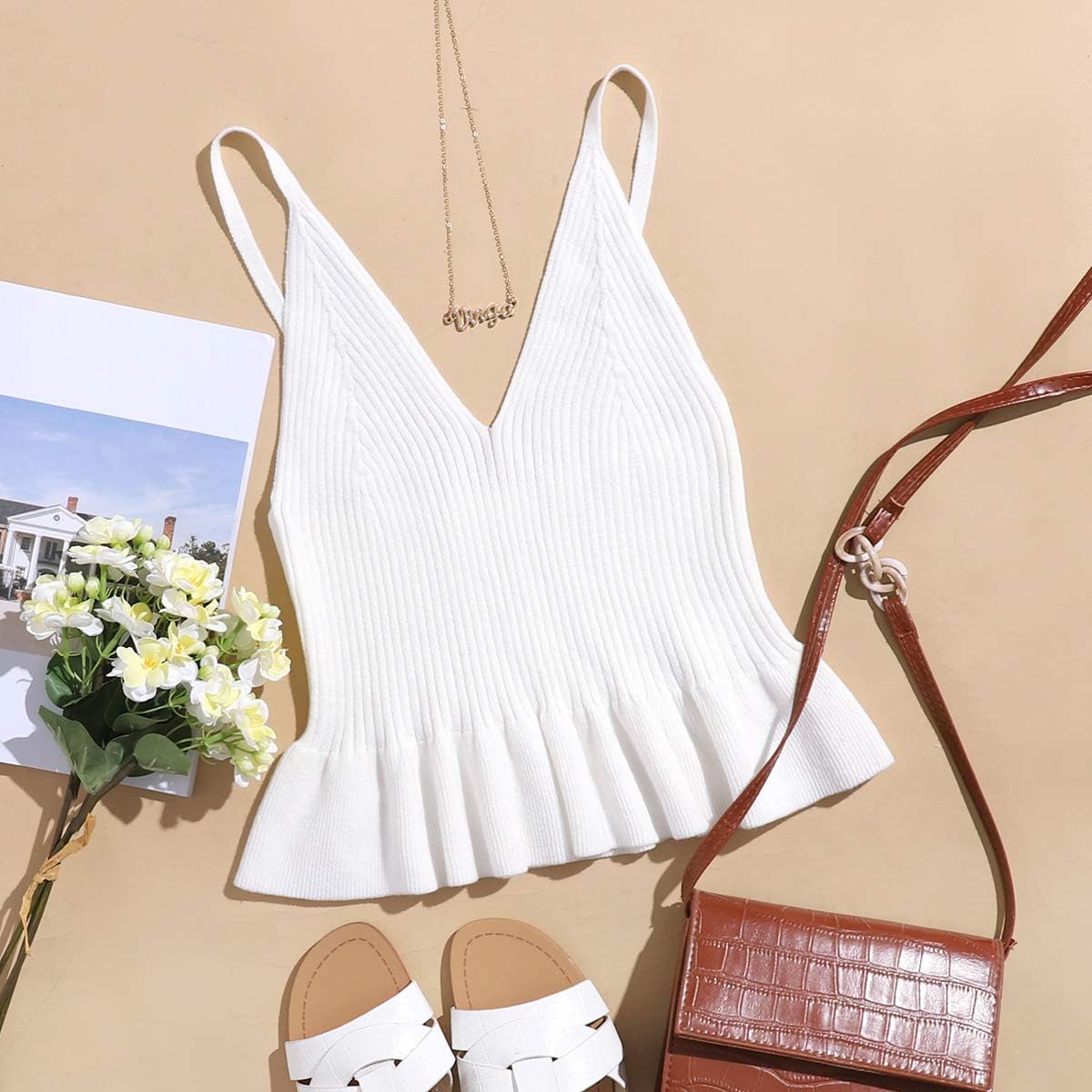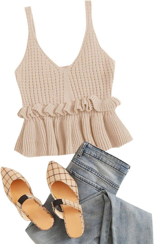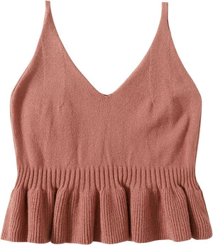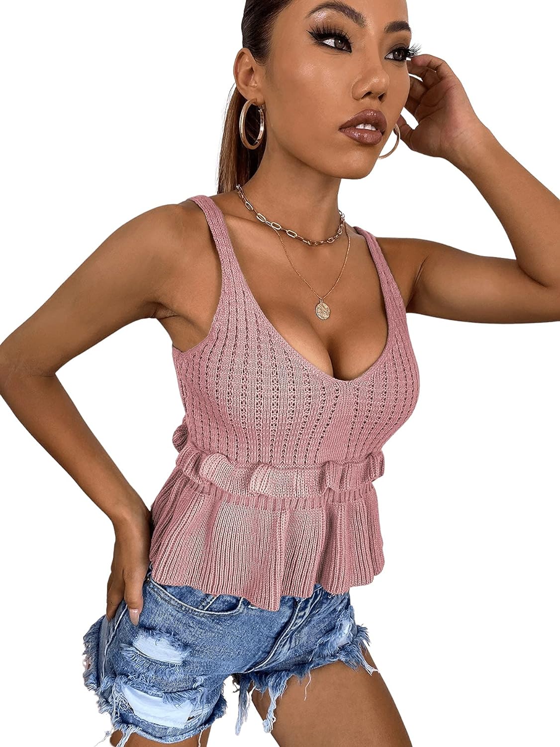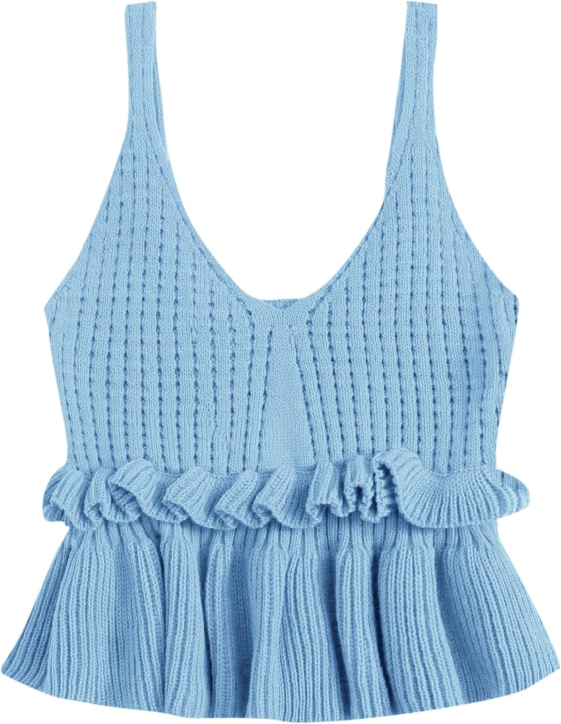 SweatyRocks Women's Casual Knit Top Sleeveless Ruffle Hem V Neck Peplum Crop Tank Top