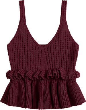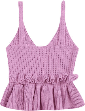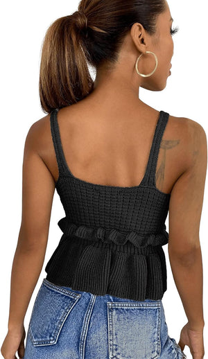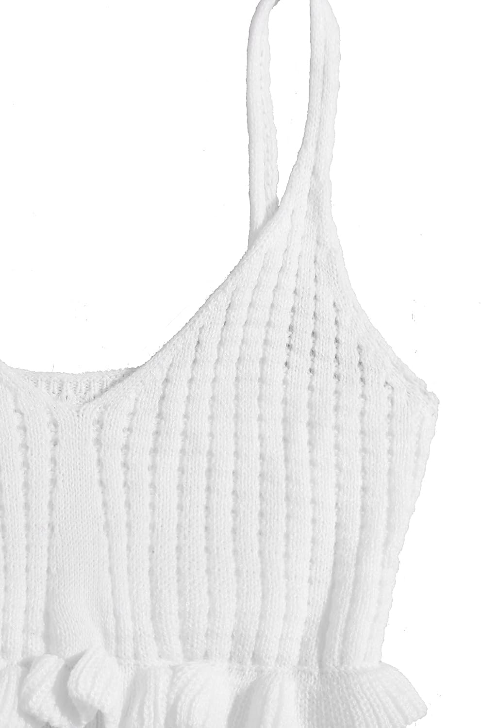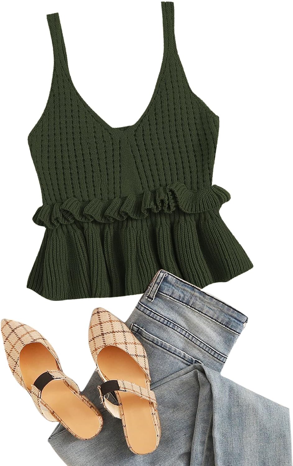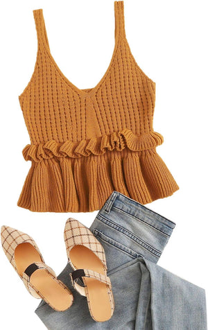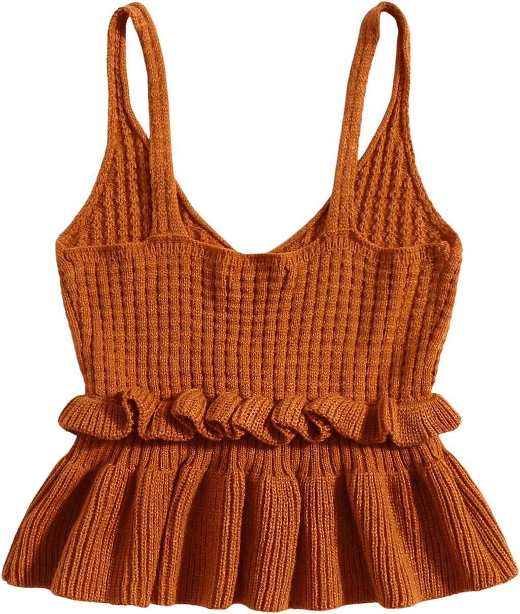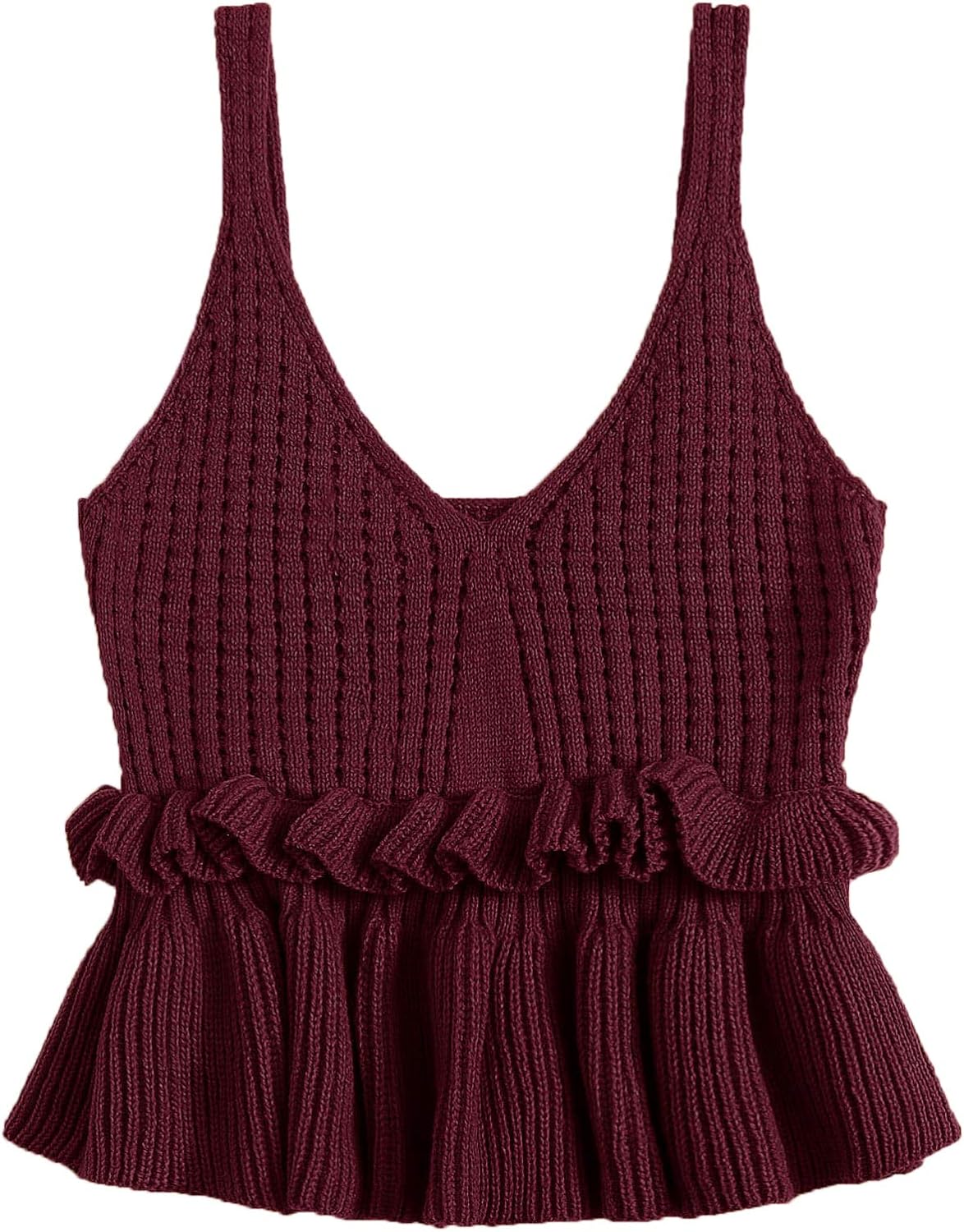SweatyRocks Women's Casual Knit Top Sleeveless Ruffle Hem V Neck Peplum Crop Tank Top
