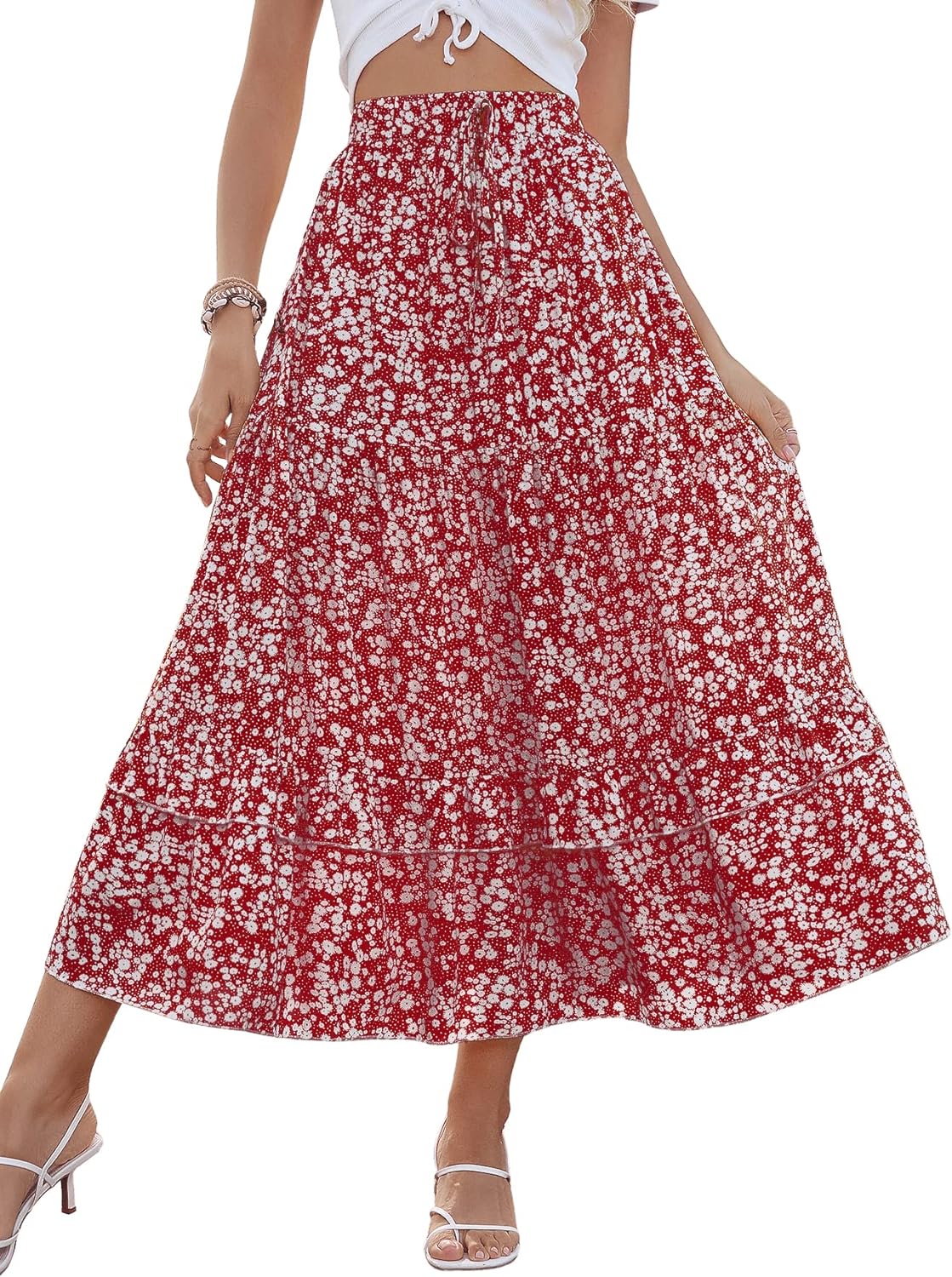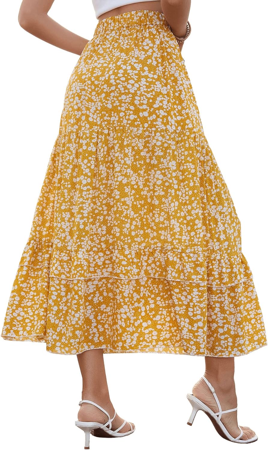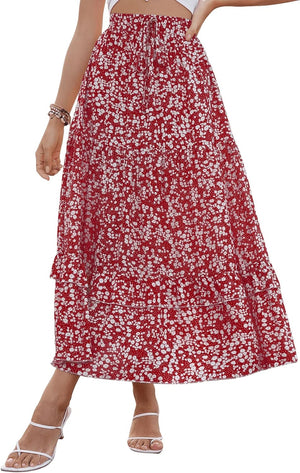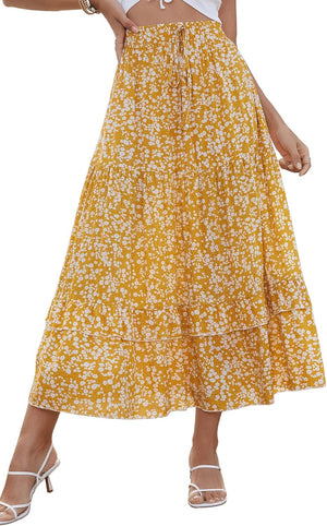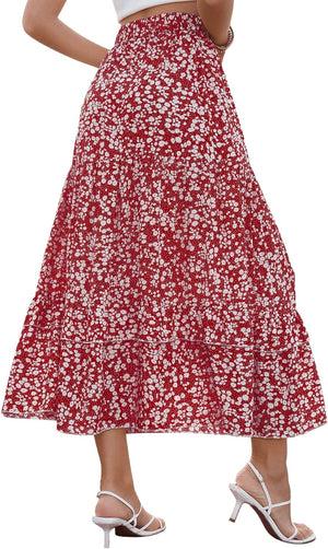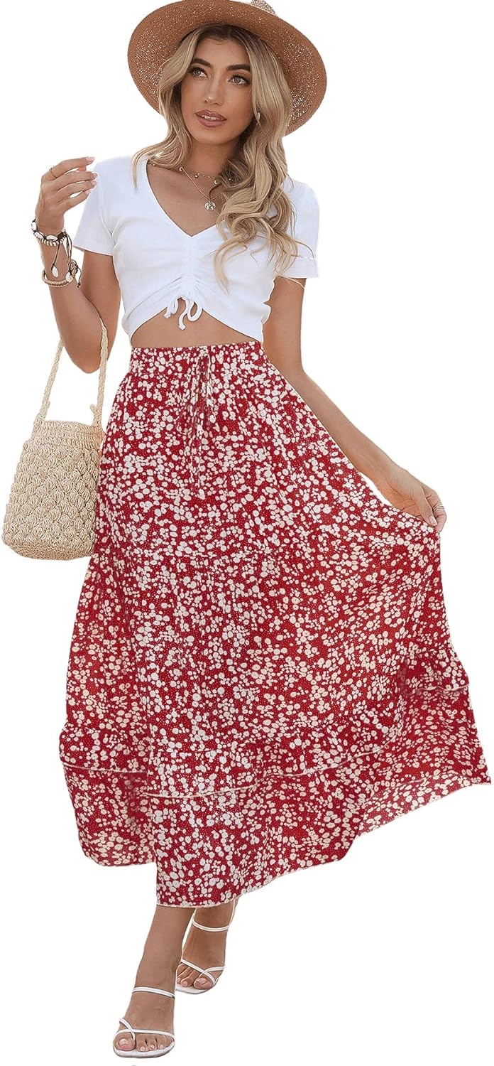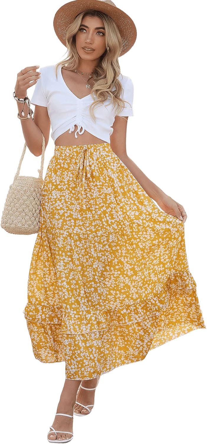 SweatyRocks Women's Elastic High Waist Layered Ruffle Hem Bohemian Floral Flared Maxi Skirt