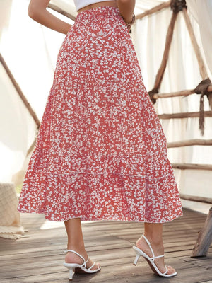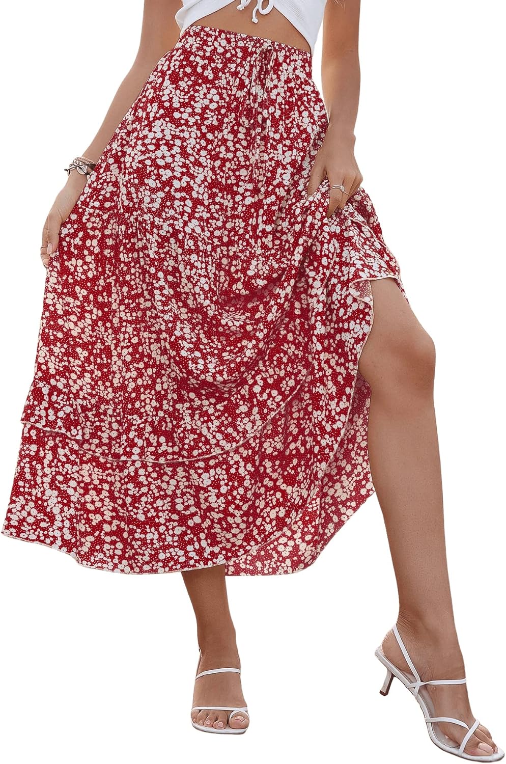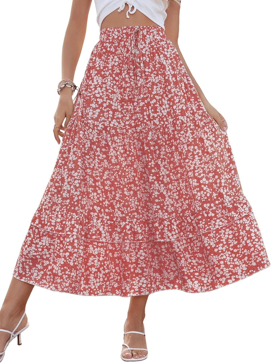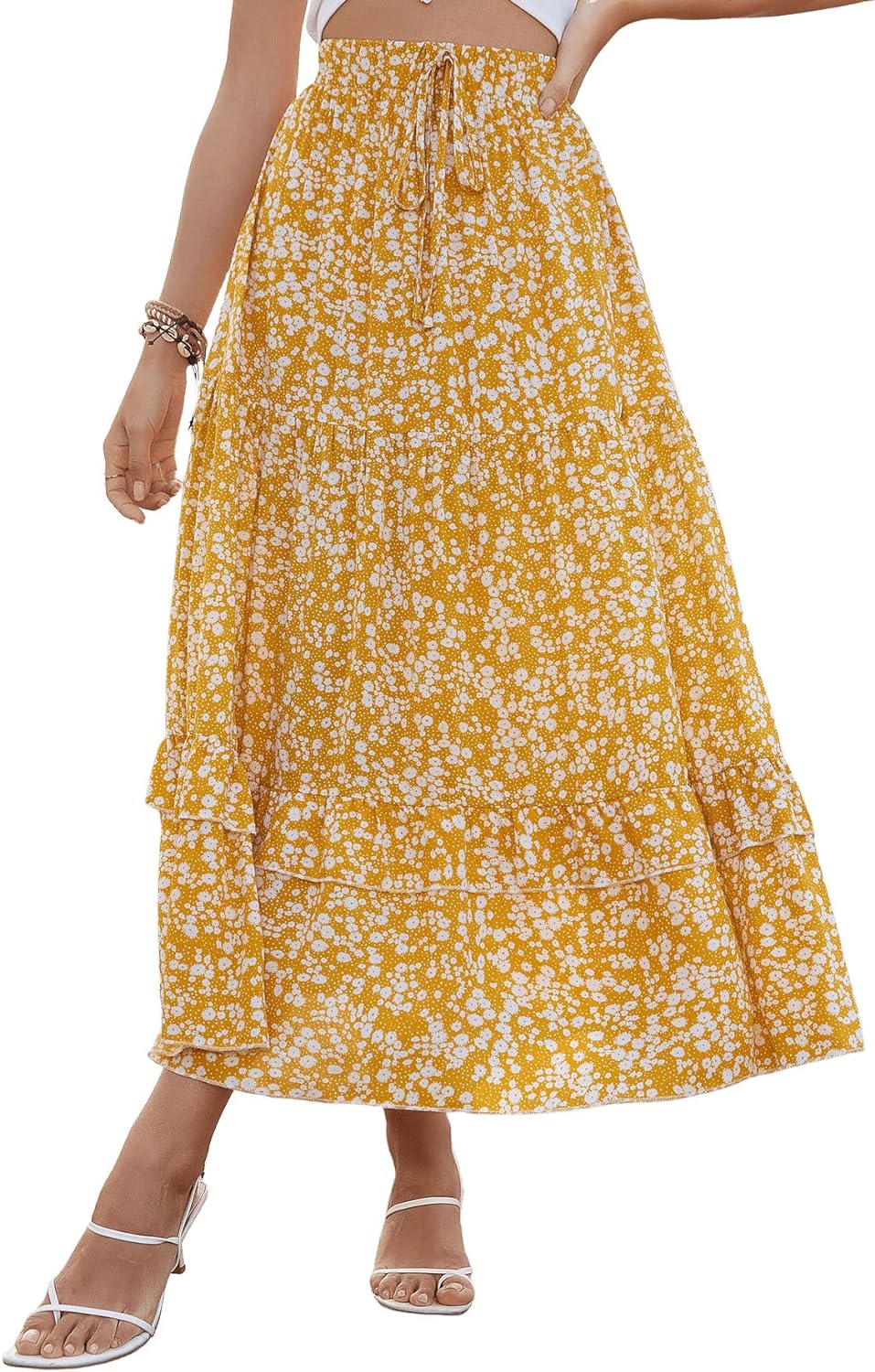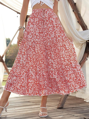 SweatyRocks Women's Elastic High Waist Layered Ruffle Hem Bohemian Floral Flared Maxi Skirt