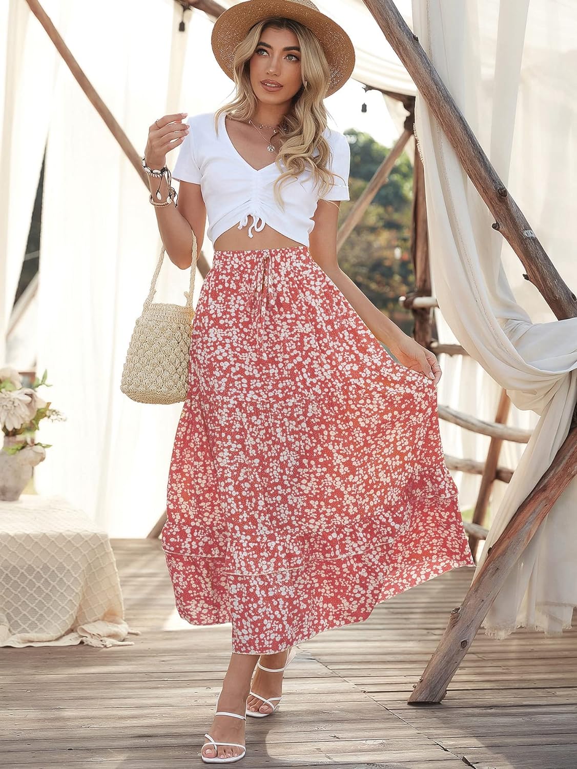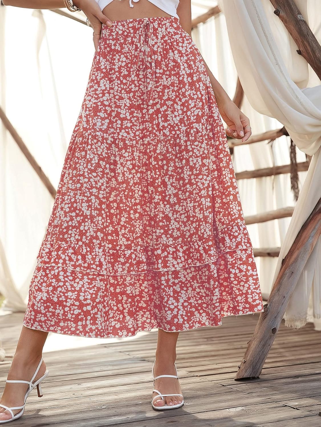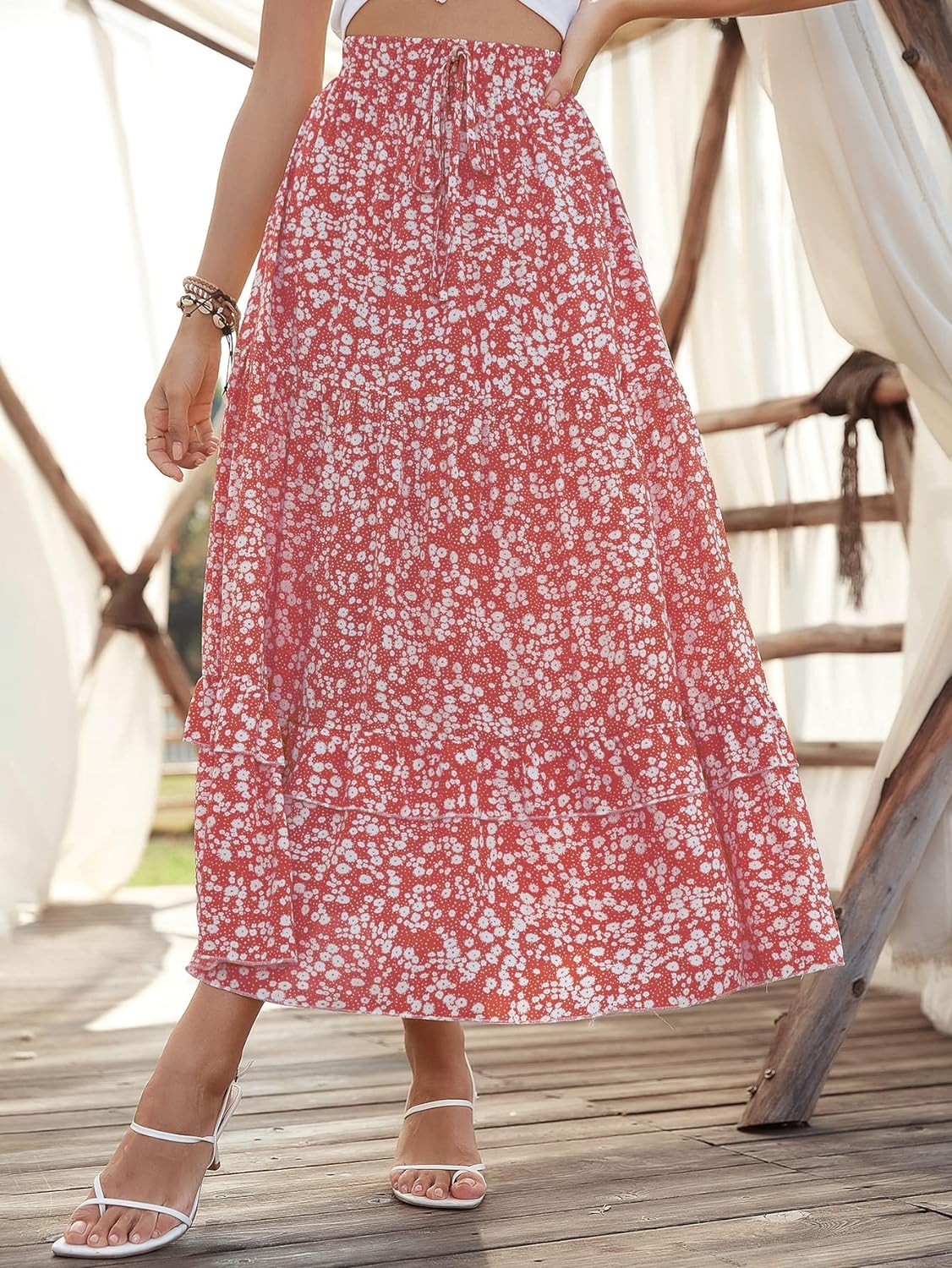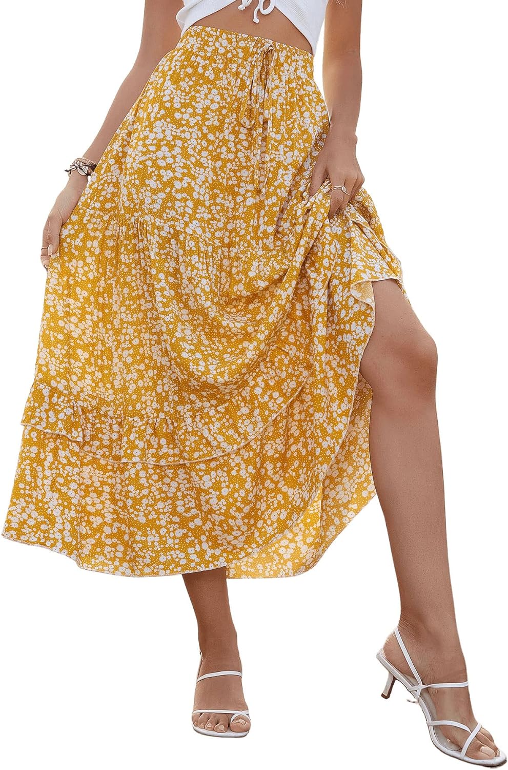 SweatyRocks Women's Elastic High Waist Layered Ruffle Hem Bohemian Floral Flared Maxi Skirt