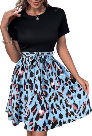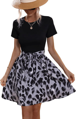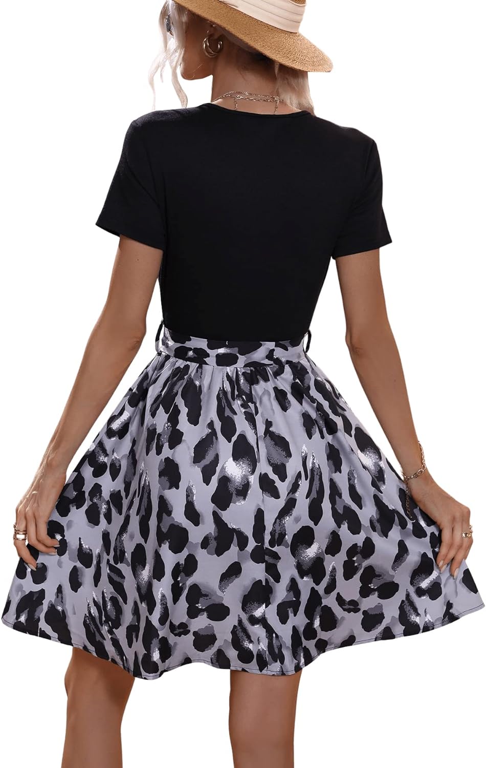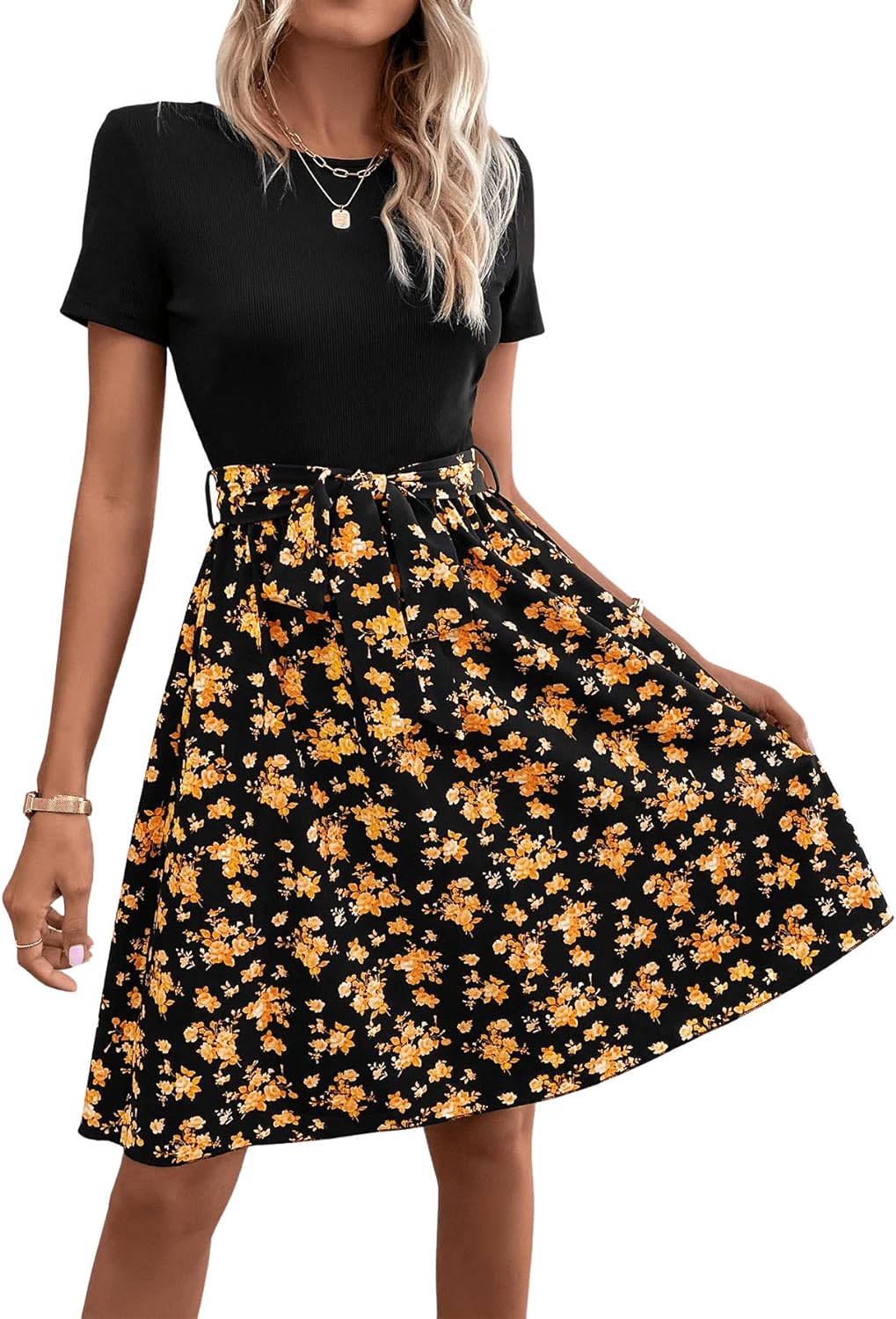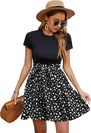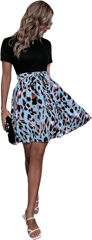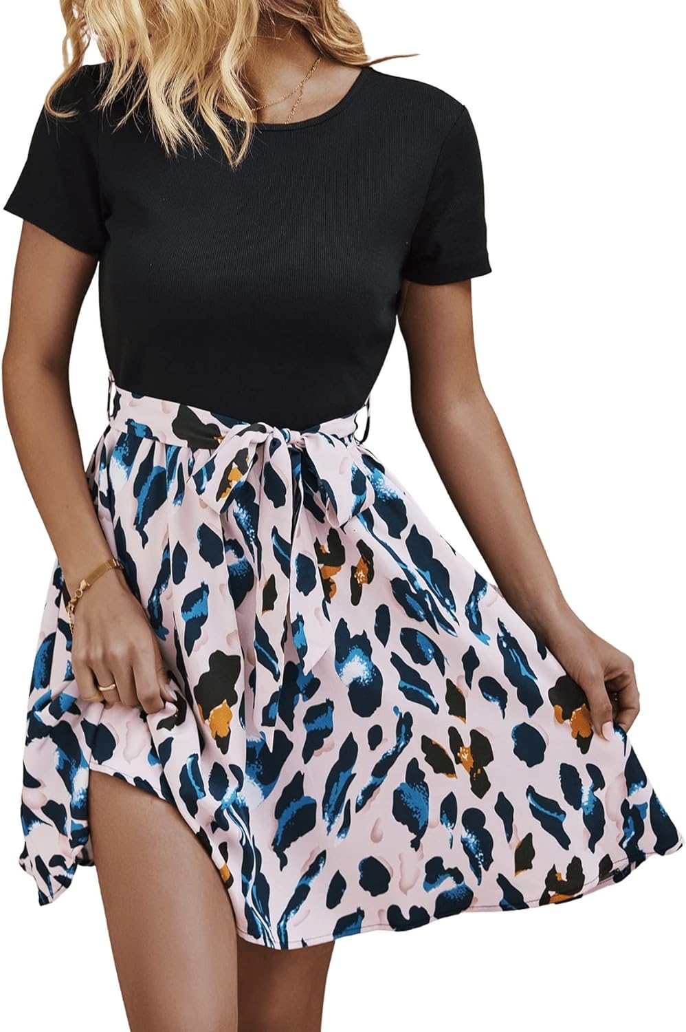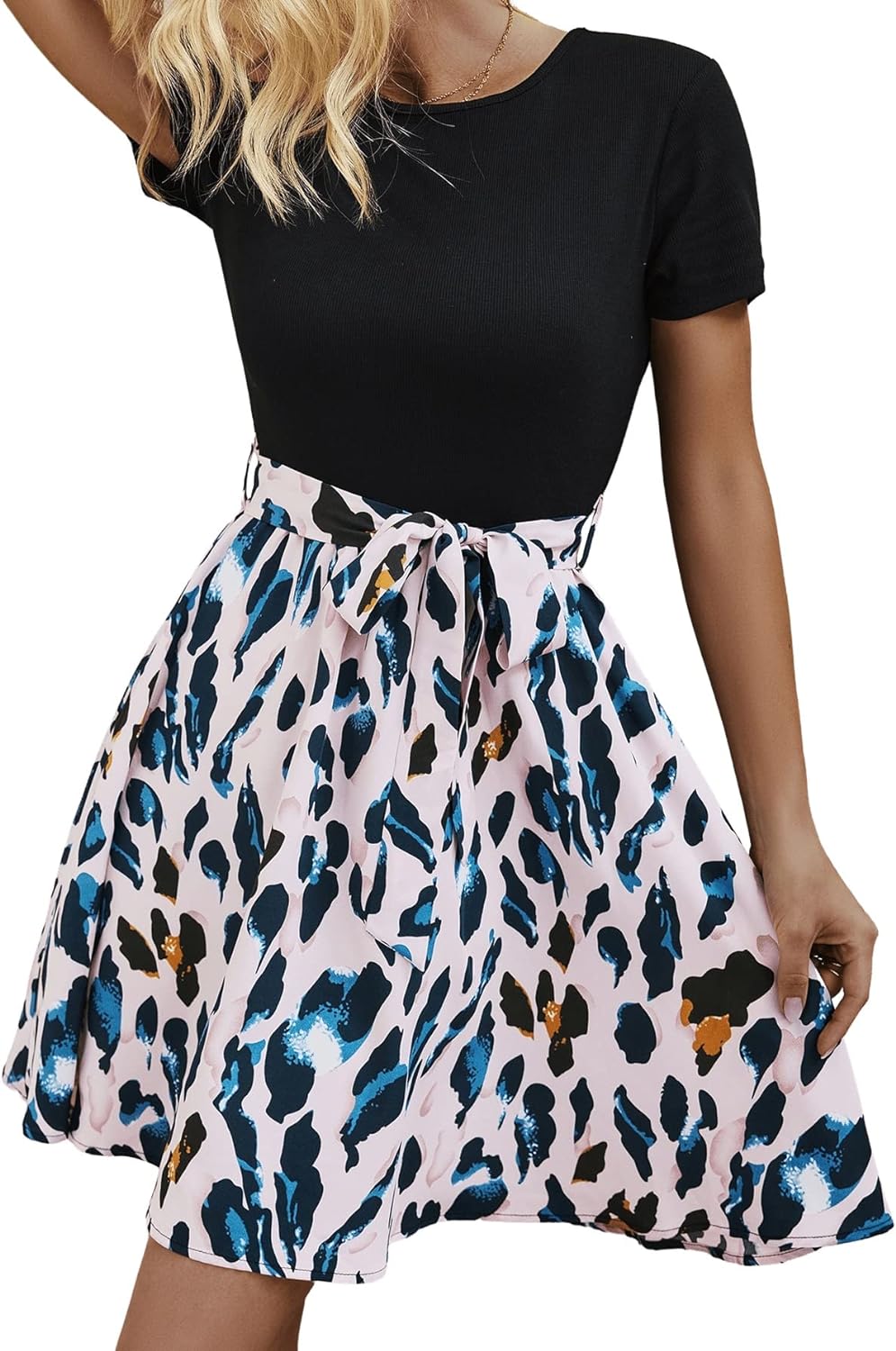 SweatyRocks Women's Graphic Short Sleeve Belted Mini Dress A Line Flared Skater Dresses