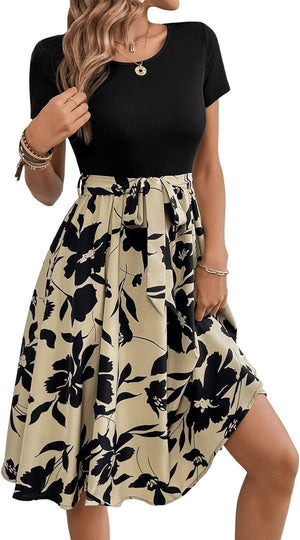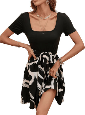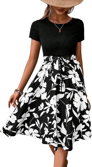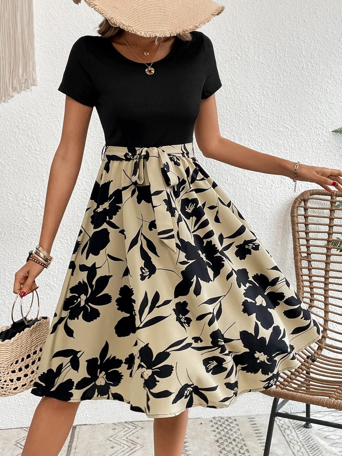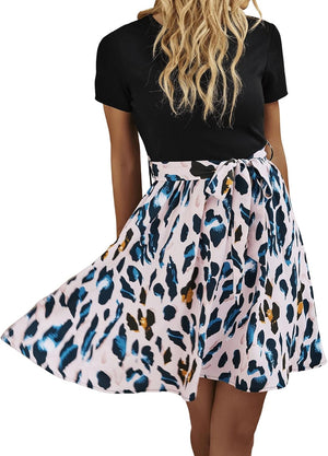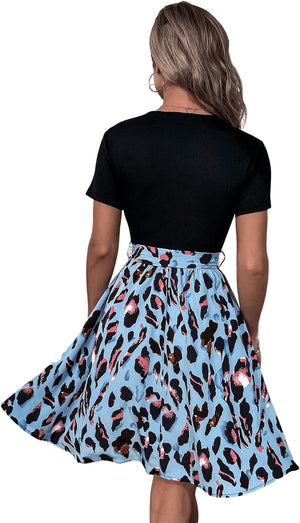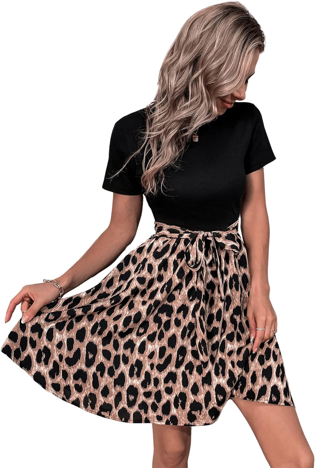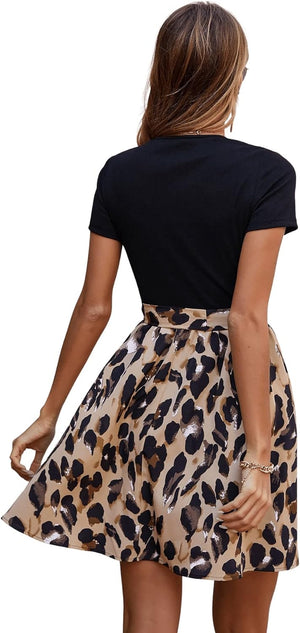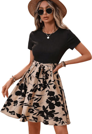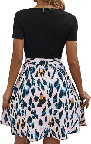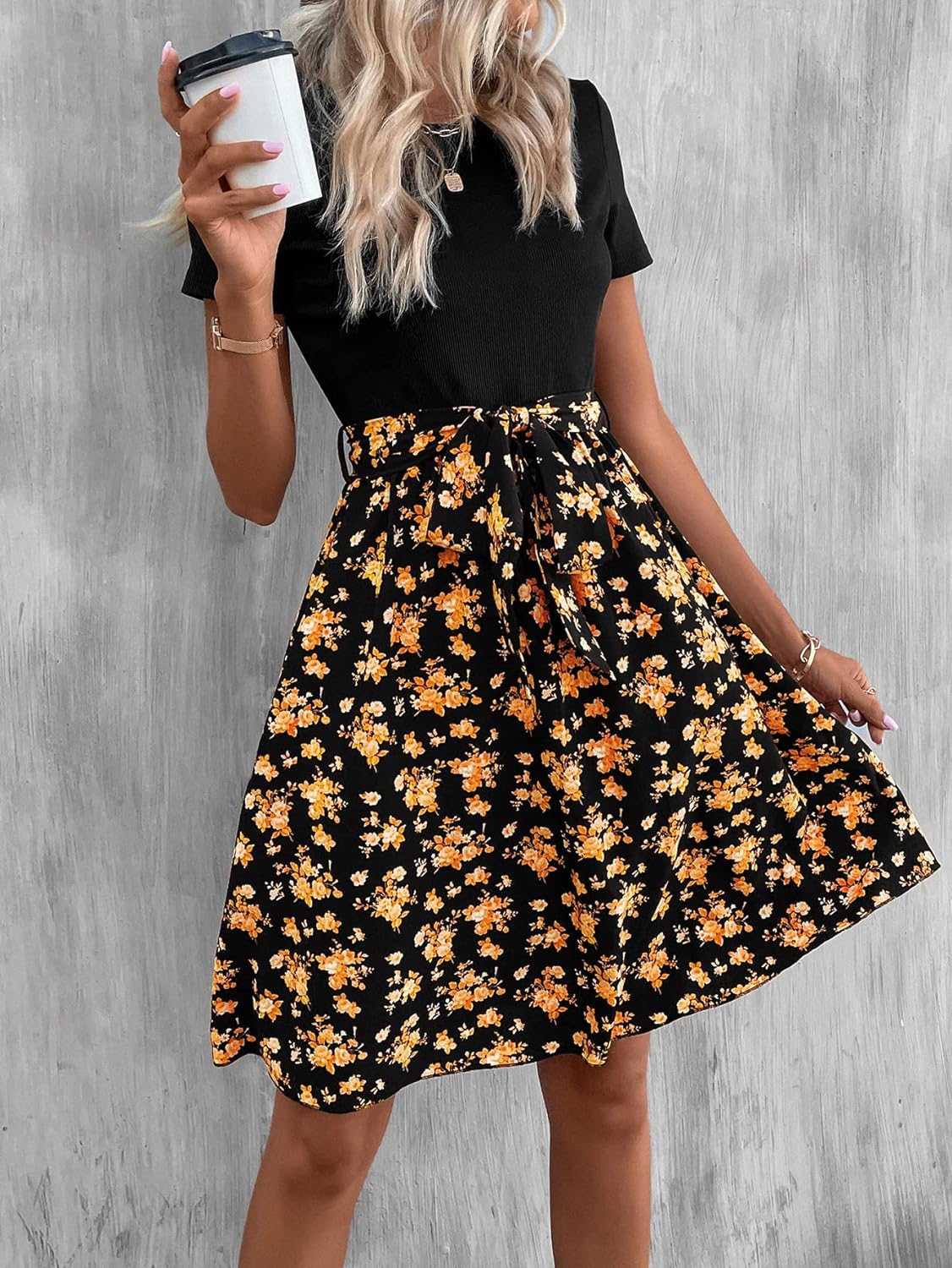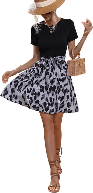 SweatyRocks Women's Graphic Short Sleeve Belted Mini Dress A Line Flared Skater Dresses