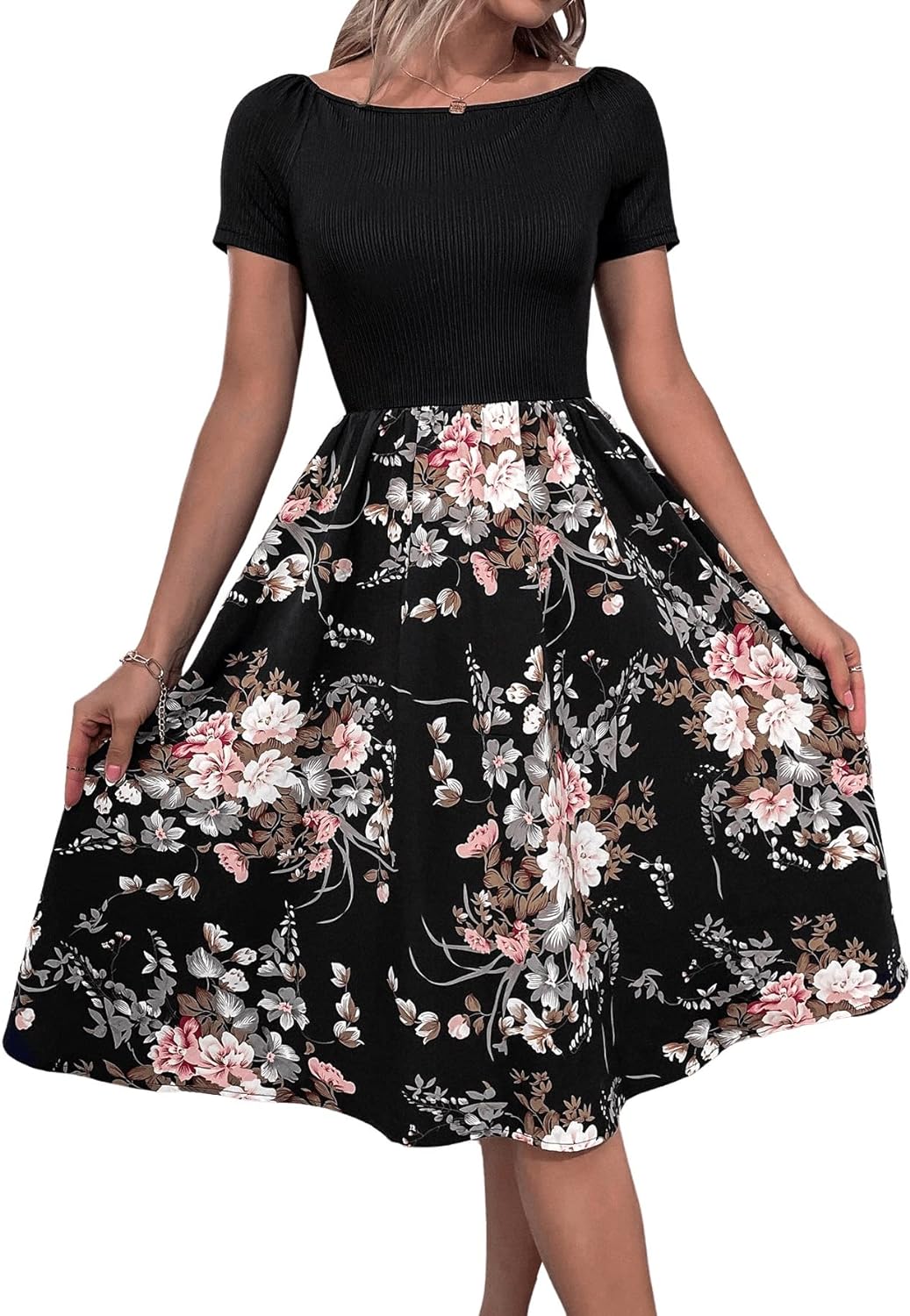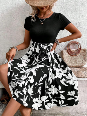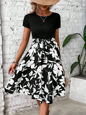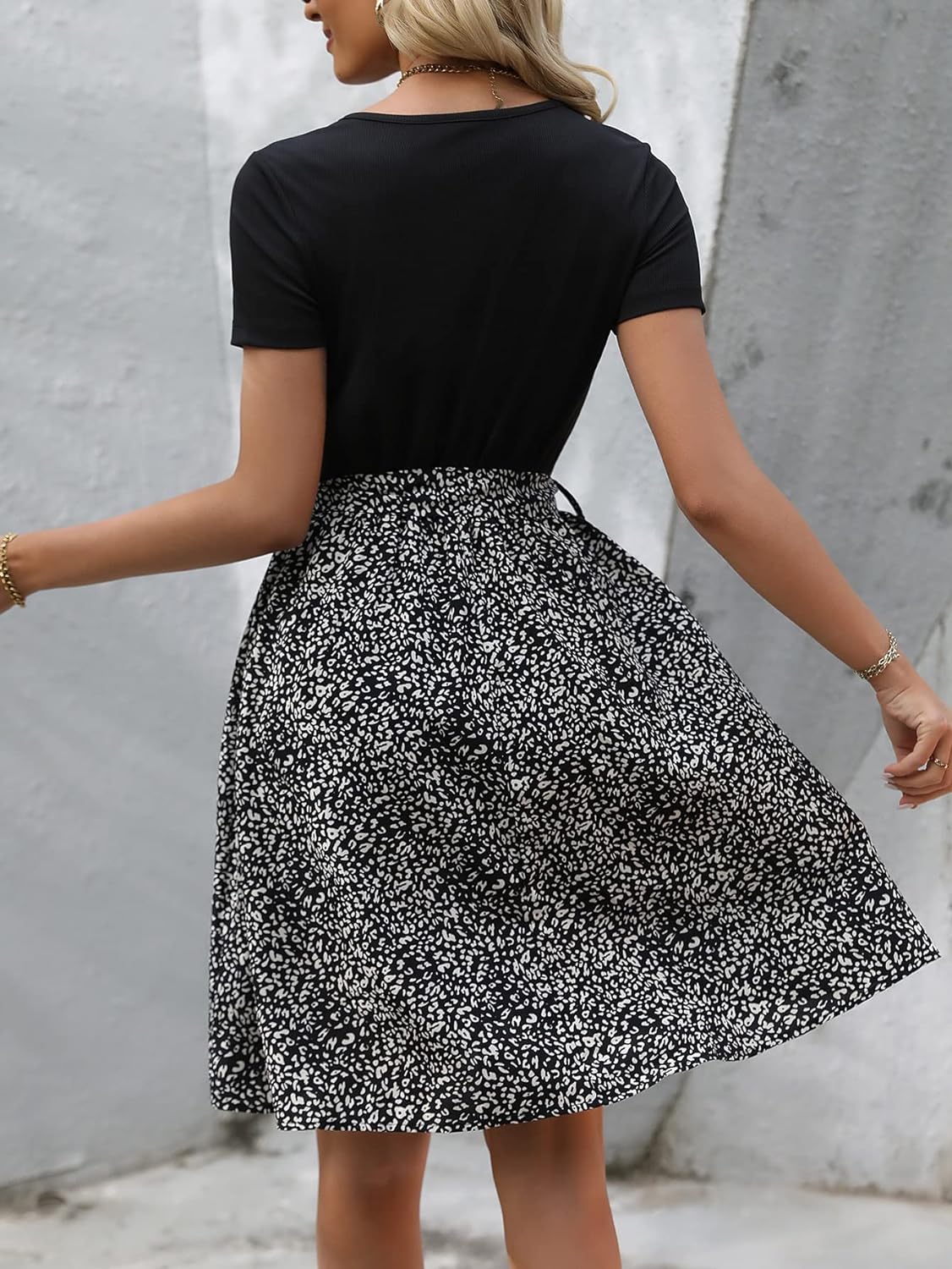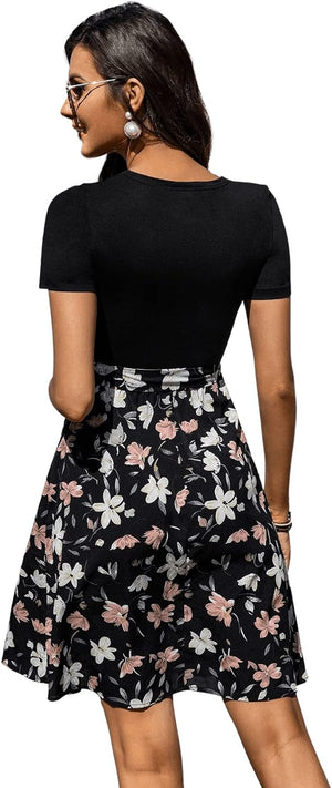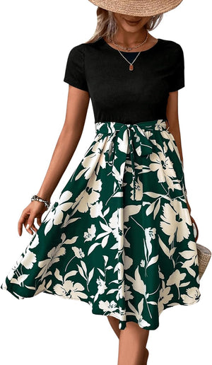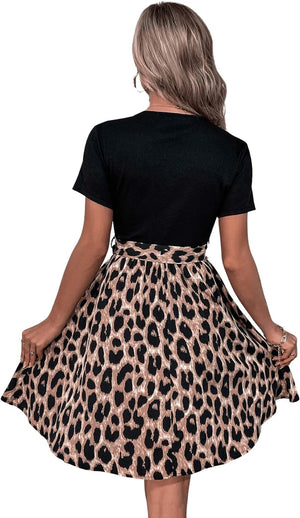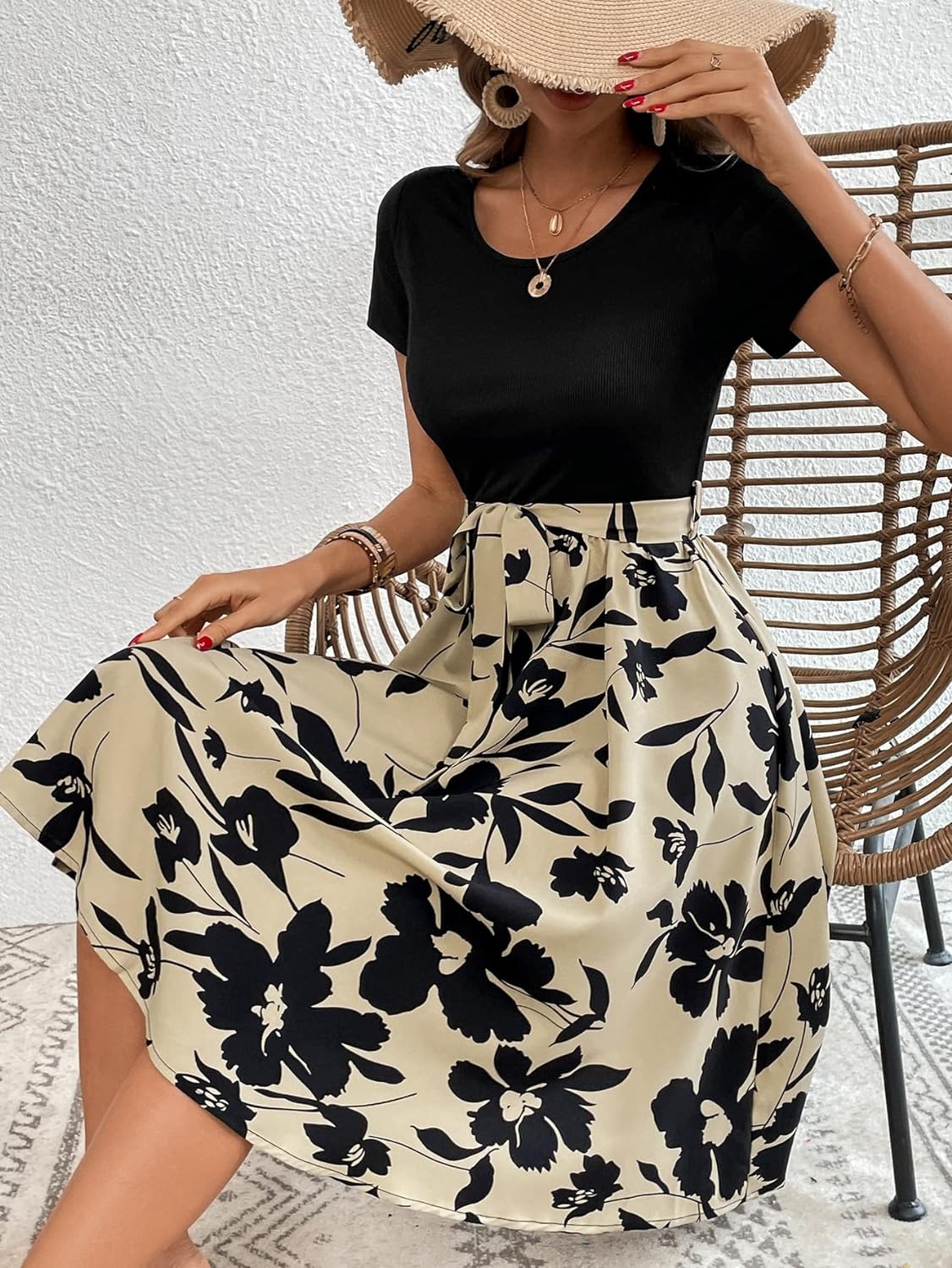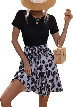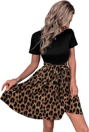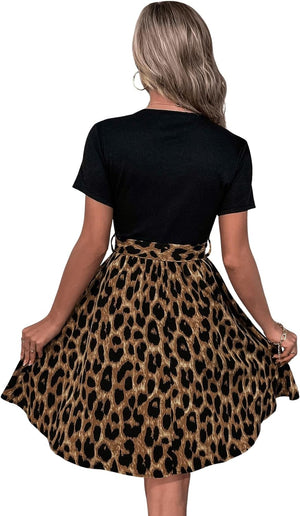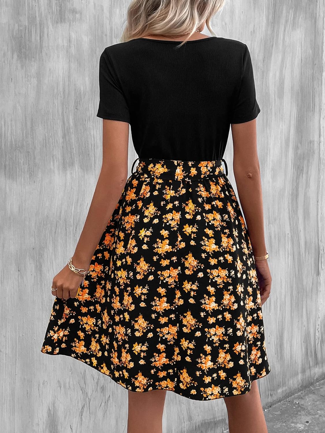 SweatyRocks Women's Graphic Short Sleeve Belted Mini Dress A Line Flared Skater Dresses