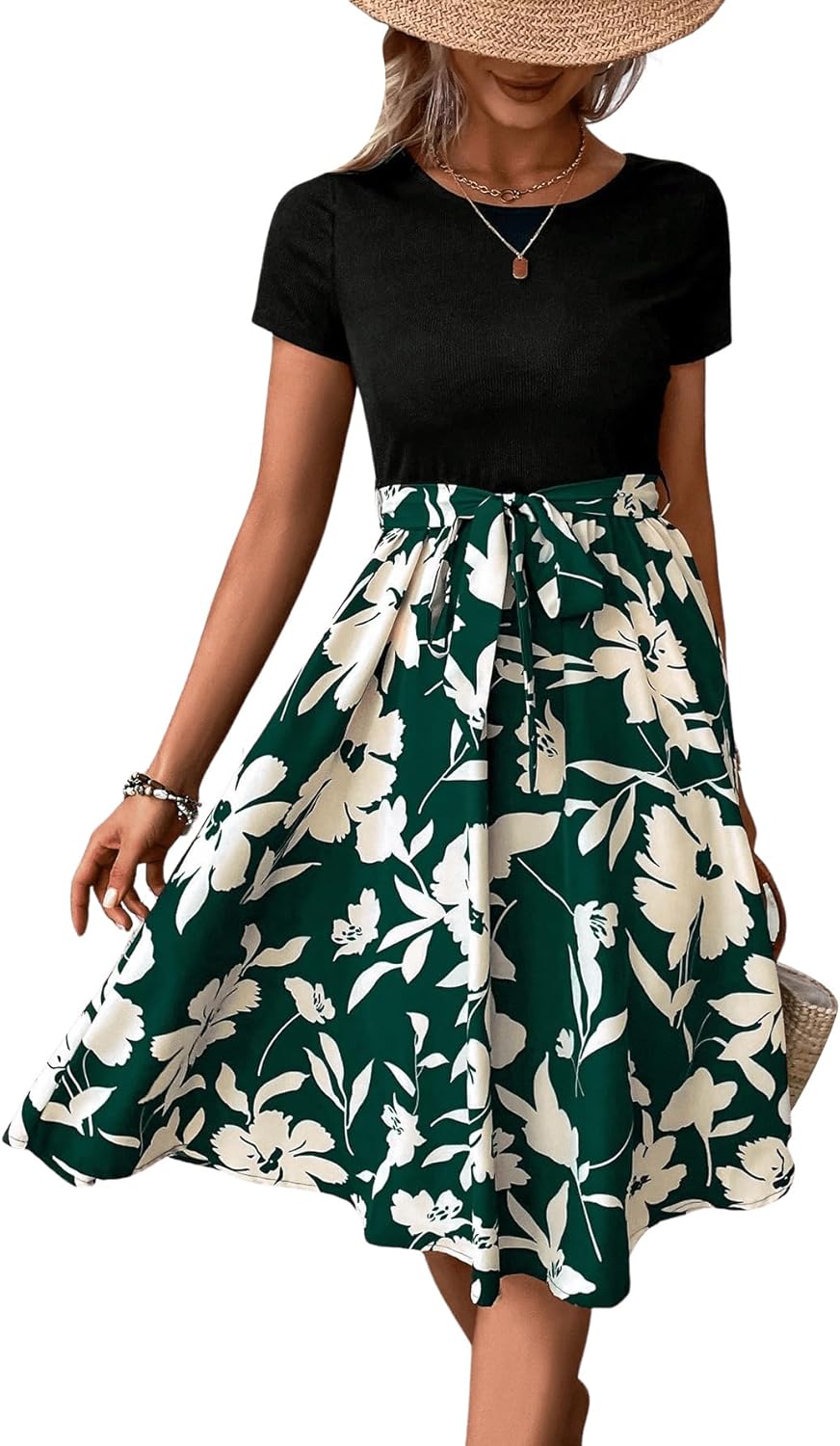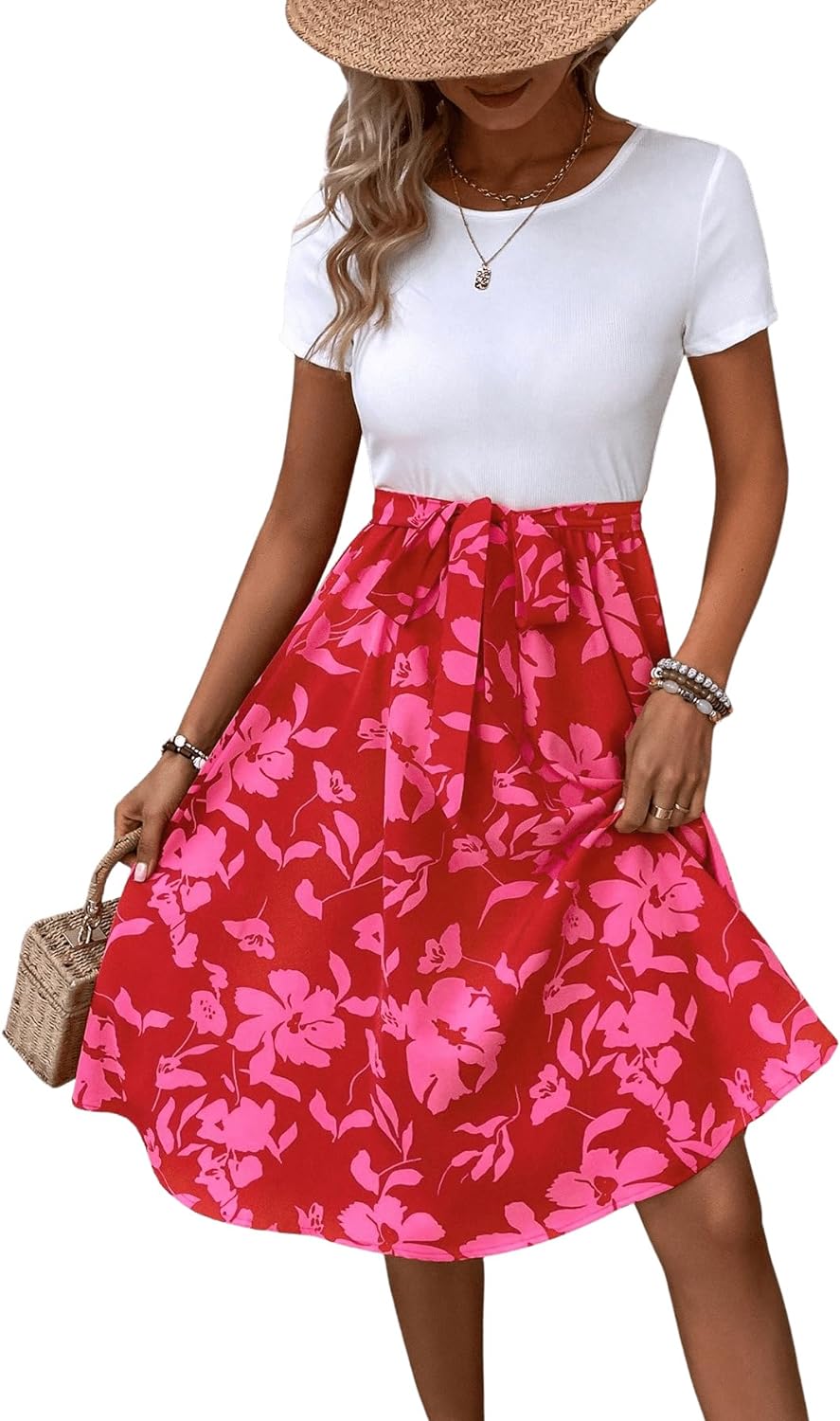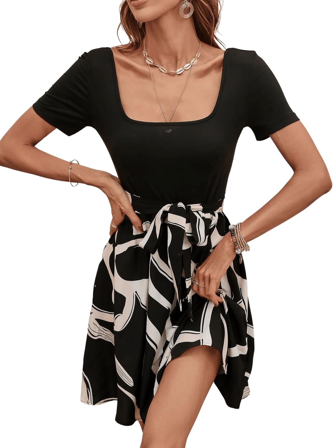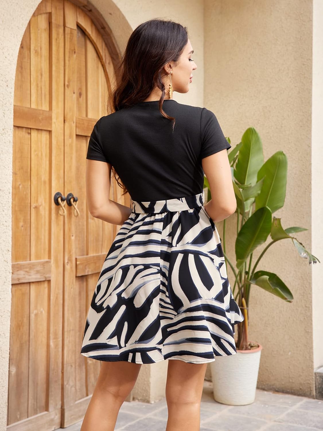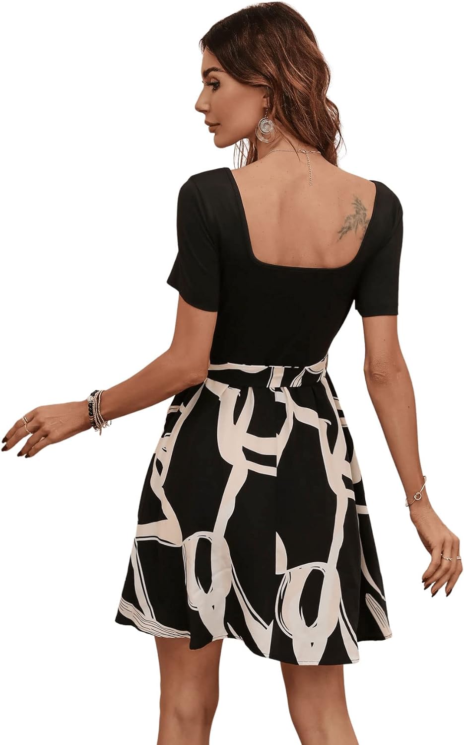 SweatyRocks Women's Graphic Short Sleeve Belted Mini Dress A Line Flared Skater Dresses/ Pattern Type: Colorblock, Graphic/ Details: Belted/ Season: Summer/ Type: A Line/ Neckline: Round Neck/ Sleeve Length: Short Sleeve/ Sleeve Type: Regular Sleeve/ Waist Line: High Waist/ Hem Shaped: Flared/ Length: Short/ Fit Type: Regular Fit/ Fabric: Medium Stretch/ Sheer: No/