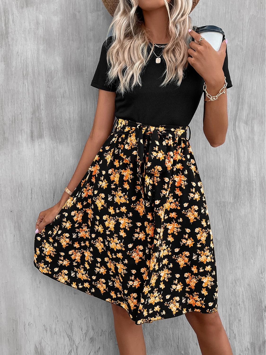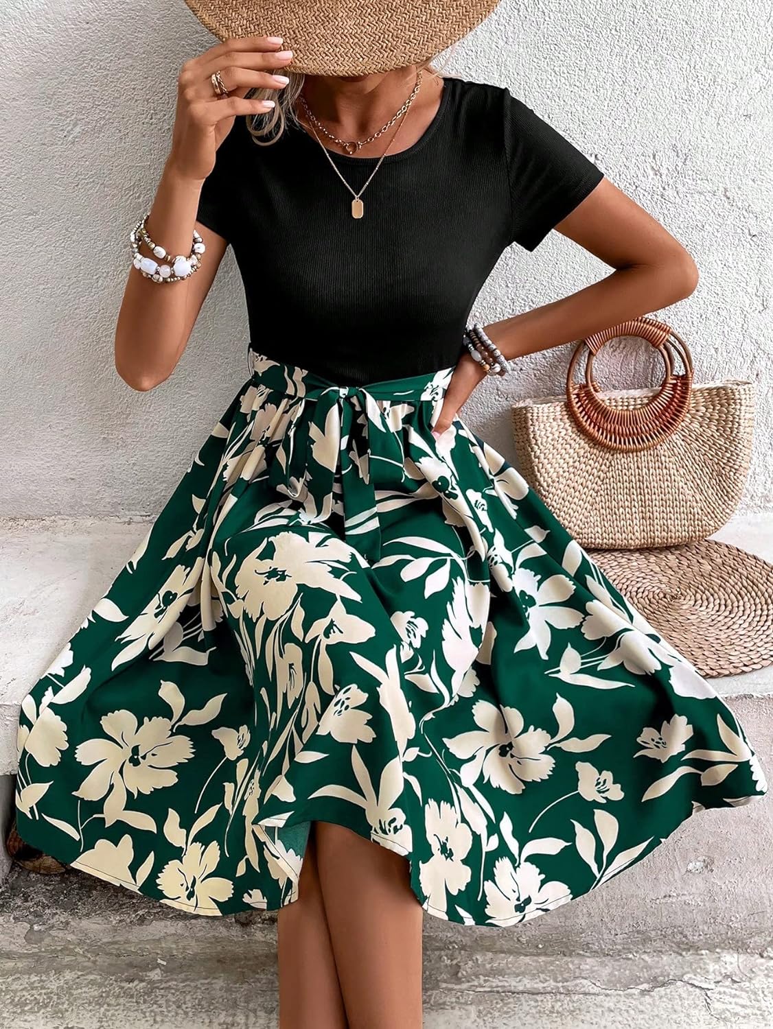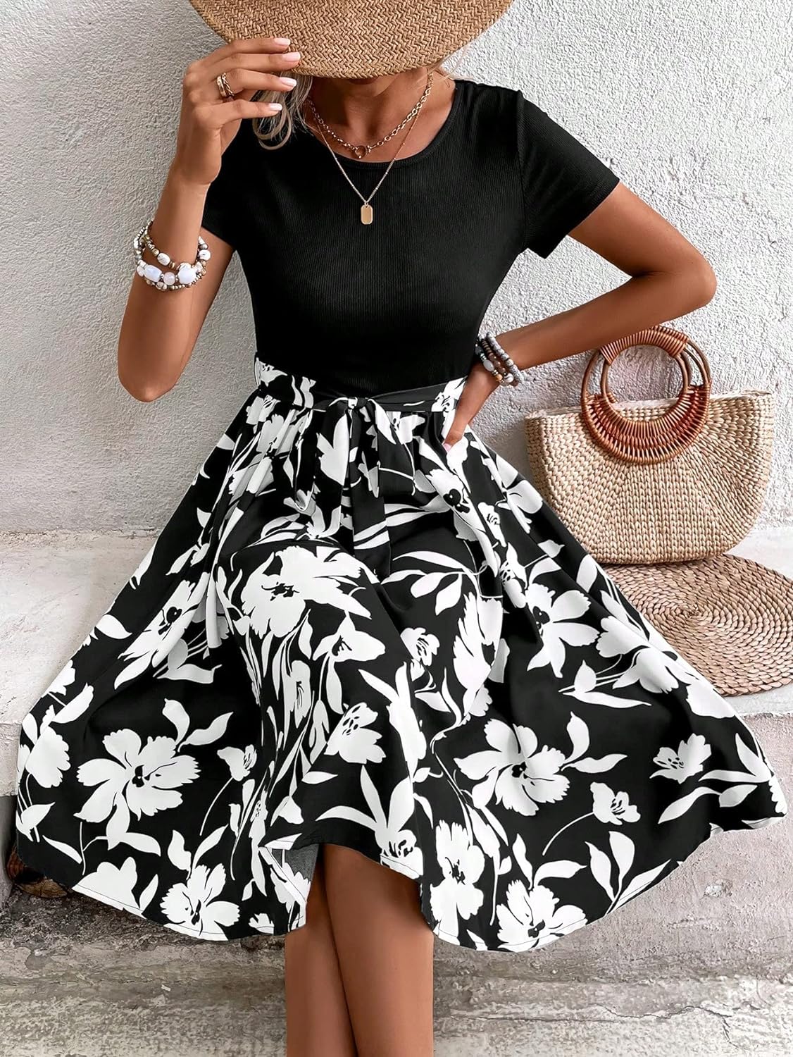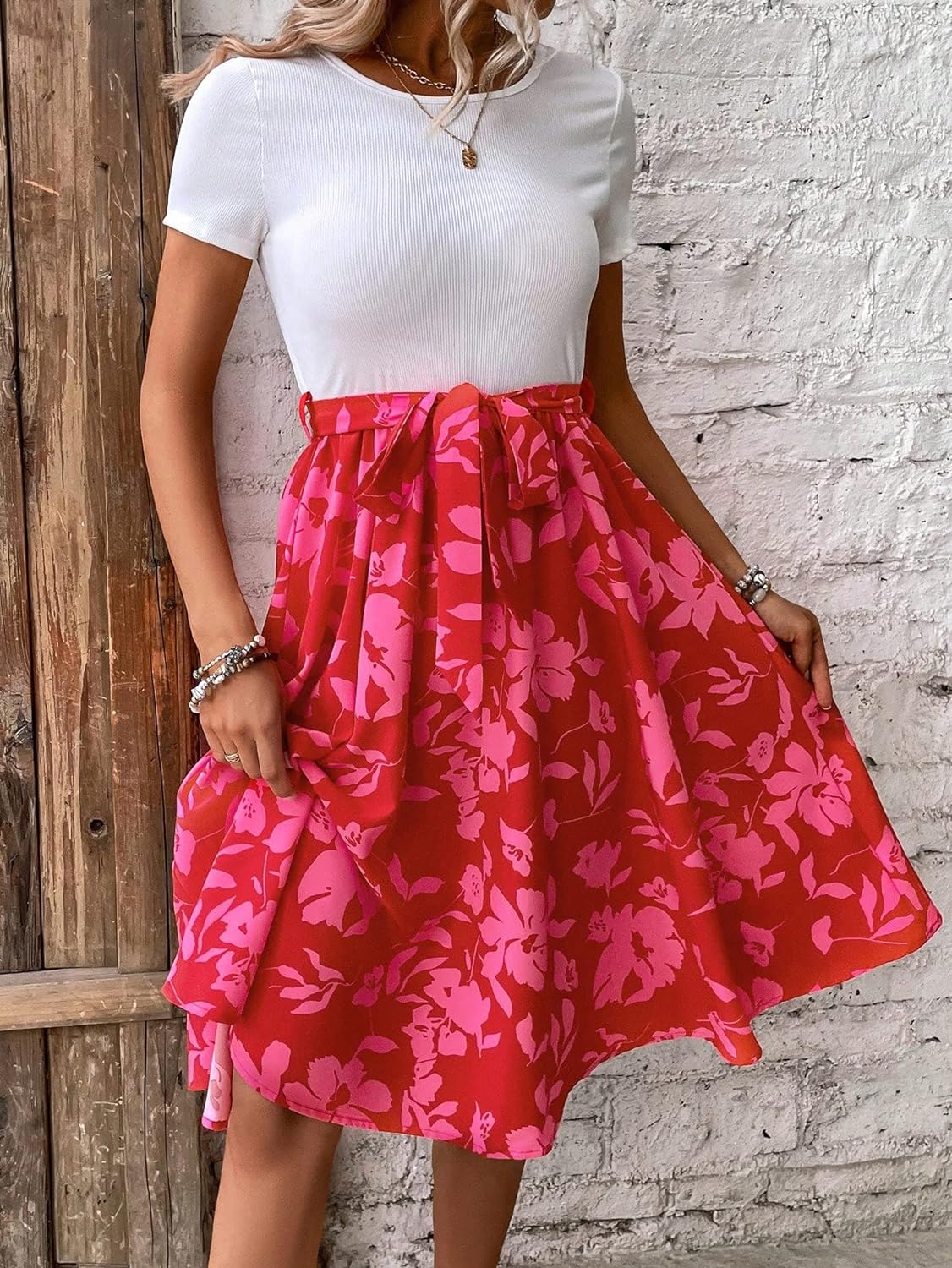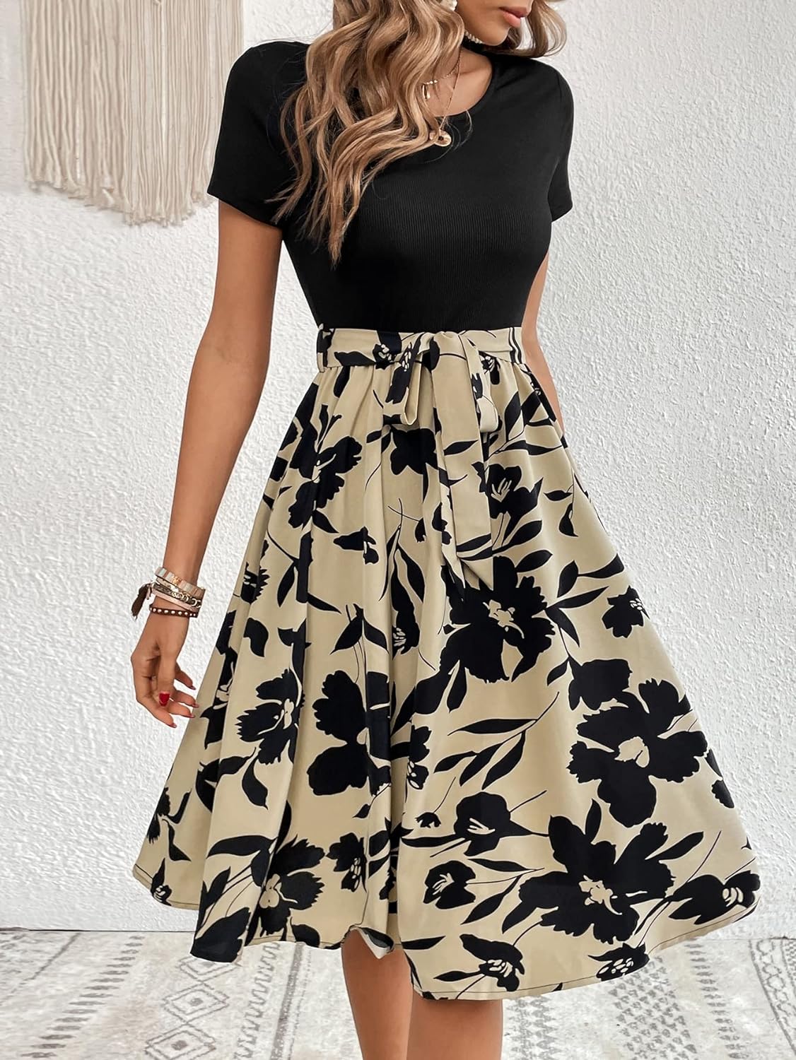 SweatyRocks Women's Graphic Short Sleeve Belted Mini Dress A Line Flared Skater Dresses/ Pattern Type: Colorblock, Graphic/ Details: Belted/ Season: Summer/ Type: A Line/ Neckline: Round Neck/ Sleeve Length: Short Sleeve/ Sleeve Type: Regular Sleeve/ Waist Line: High Waist/ Hem Shaped: Flared/ Length: Short/ Fit Type: Regular Fit/ Fabric: Medium Stretch/ Sheer: No/
